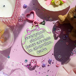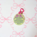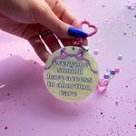 This keychain says: everyone should have access to abortion care. With a bow on top, to be extra sweet. Pretty pretty please Mr. Supreme Court!!!!