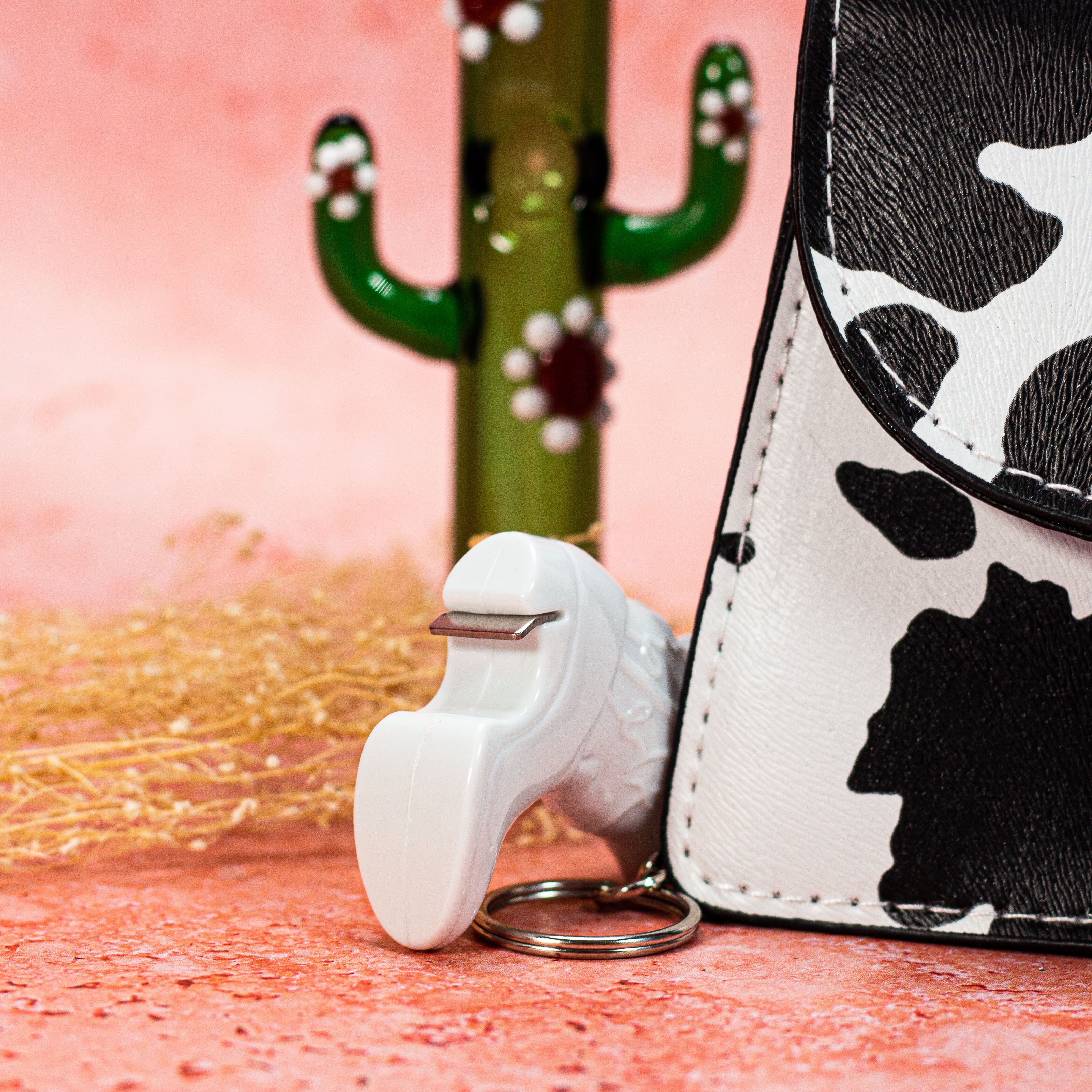 Shaped like a cowboy boot, these keychains feature a bottle opening mechanism on the bottom. Perfect for the honky tonk!