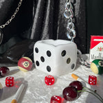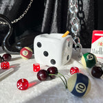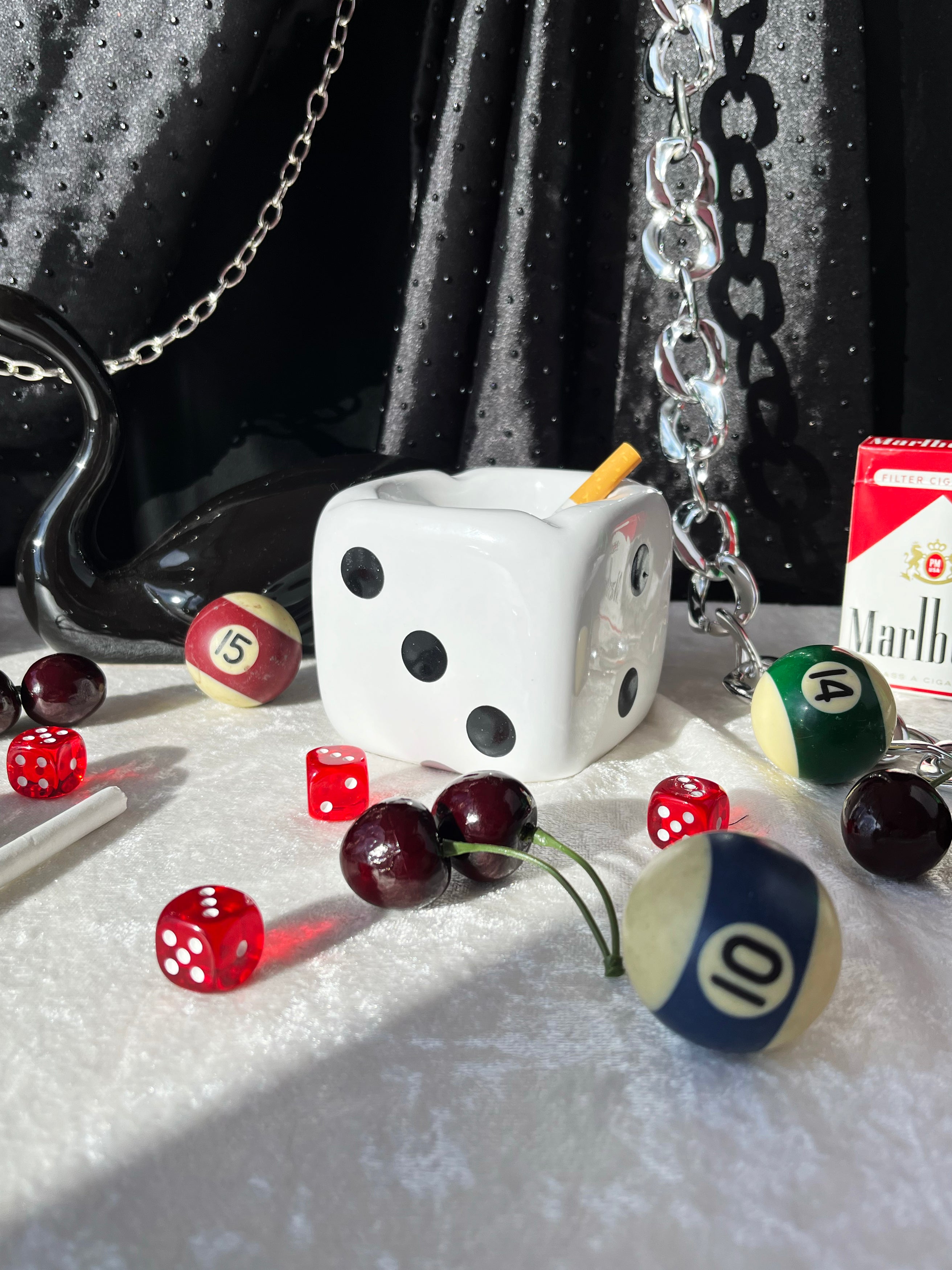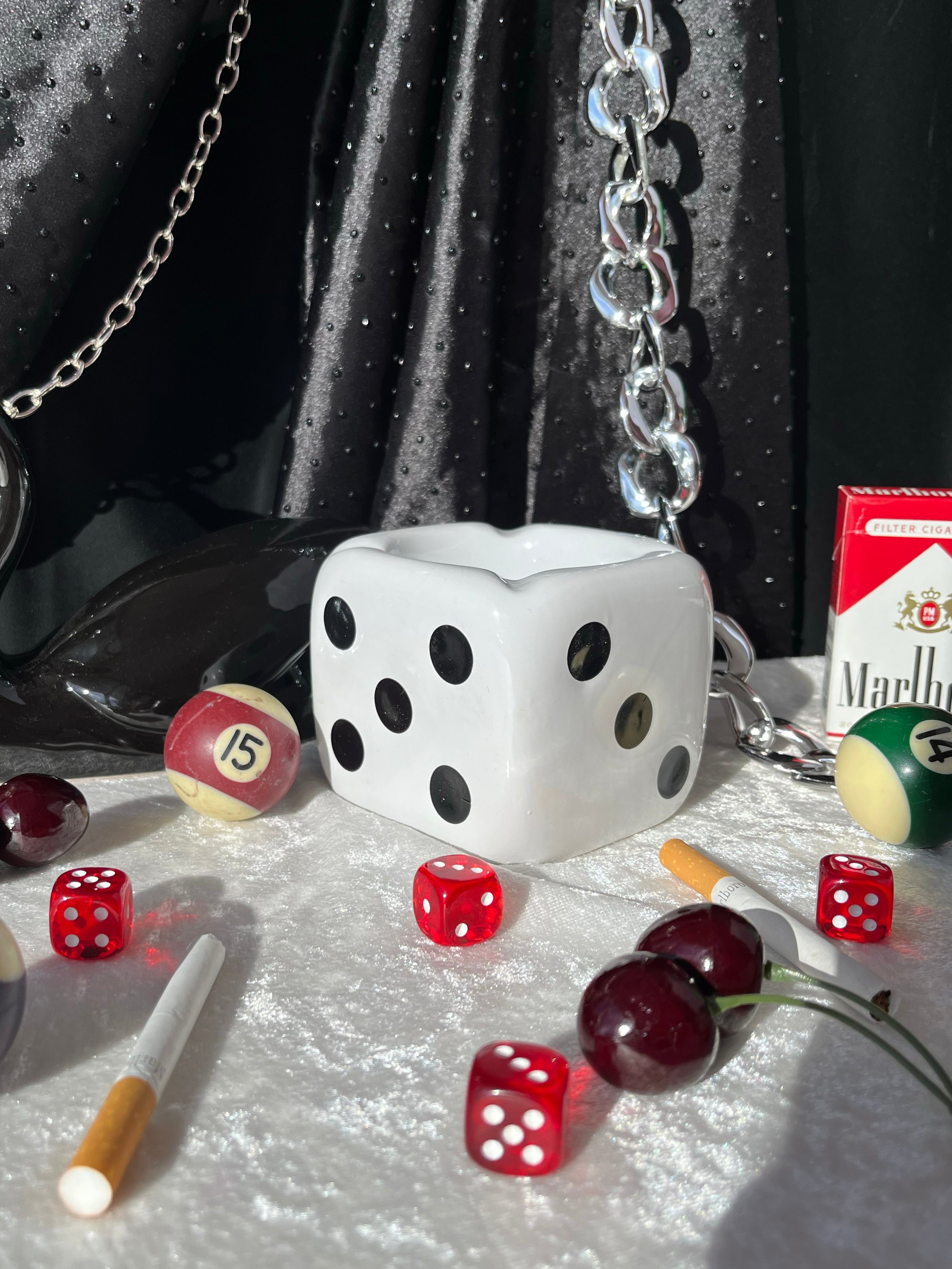 This ash tray is made of white ceramic and is decorated to mimic dice. It measures 3" x 3.75" x 3.75".
