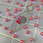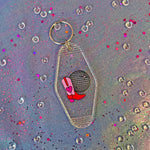 Vintage motel style keychain is 3.5" see thru glitter plastic with a 1.25" keyring for all your keychains.