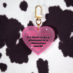 Heart-shaped keychain measures 2" x 2.25" and is made of pink acrylic.