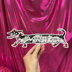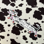 Made from high quality vinyl. Fully water resistant. Design is of a black and white spotted dog wearing cowboy boots and says, "git along lil' doggie". What could be better?!