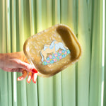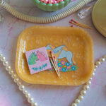 This tray is made from a gorgeous pearlescent buttery yellow acetate and is perfect for rolling or you can even use it as a trinket tray! Features two ponies in love <3 drawn by Claire Shadomy!