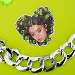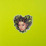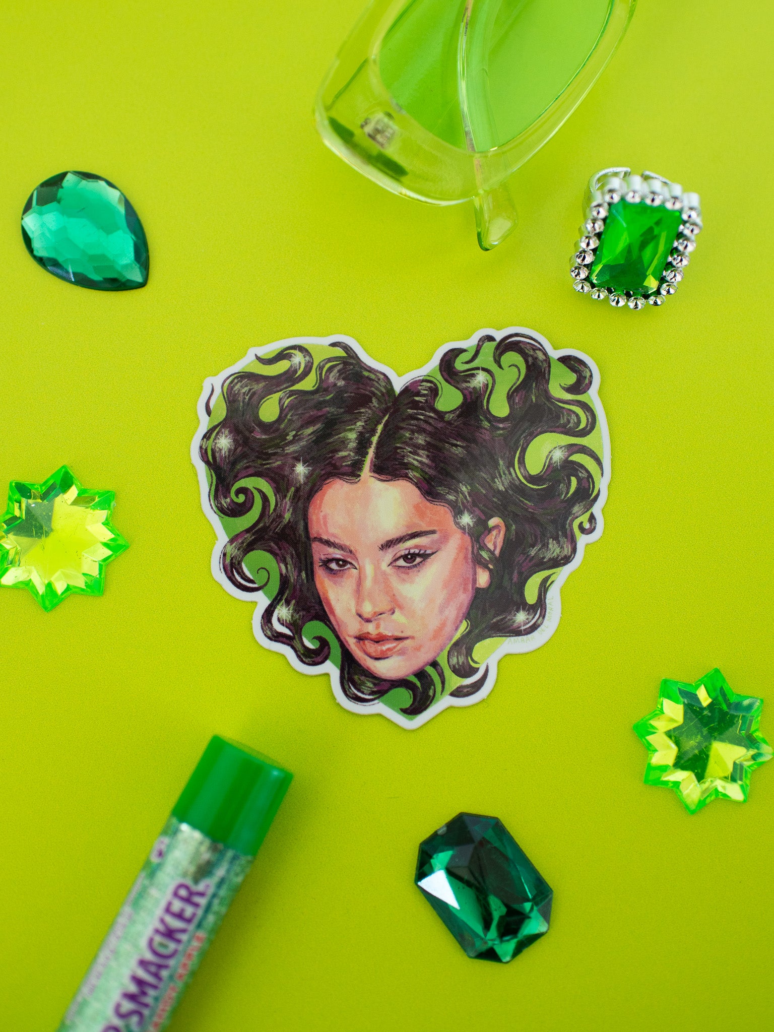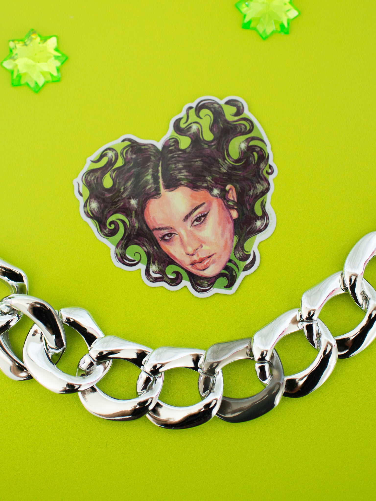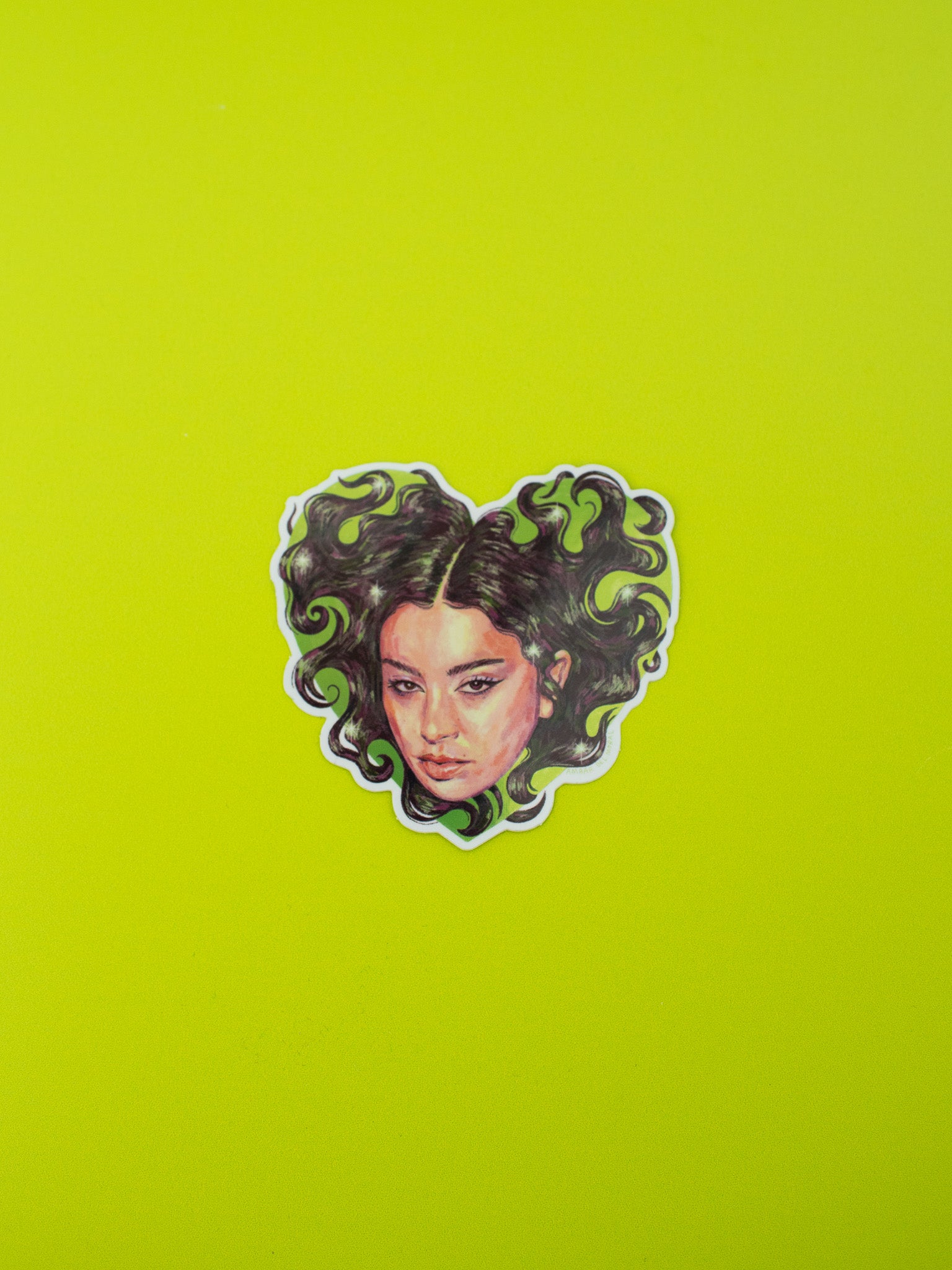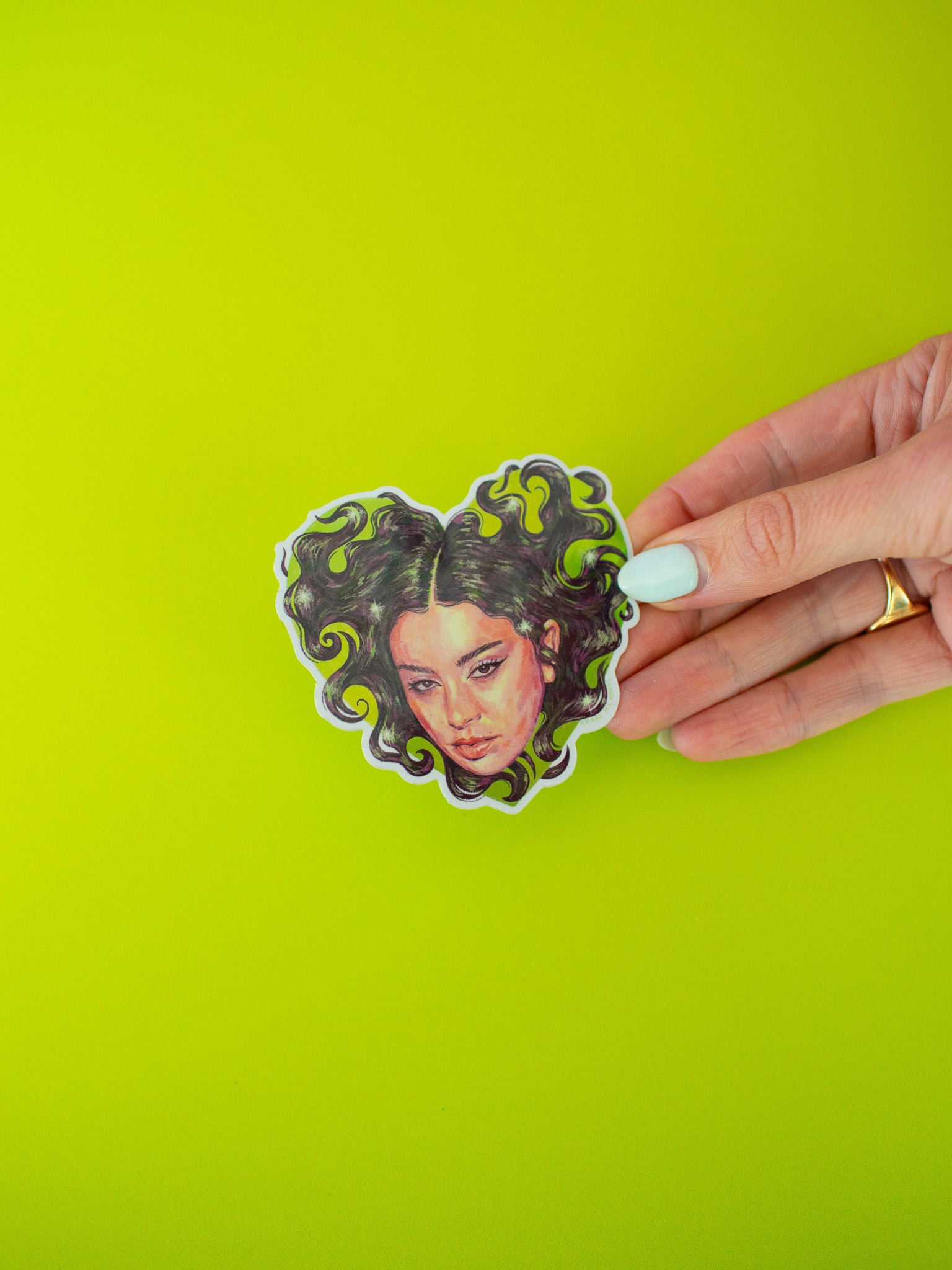 This vinyl sticker features Charli XCX inside a green holographic heart. So Brat.