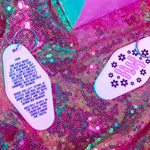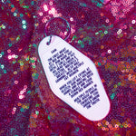 Vintage style motel keychain features an anonymous letter from JWoww and Snooki to Sammi.