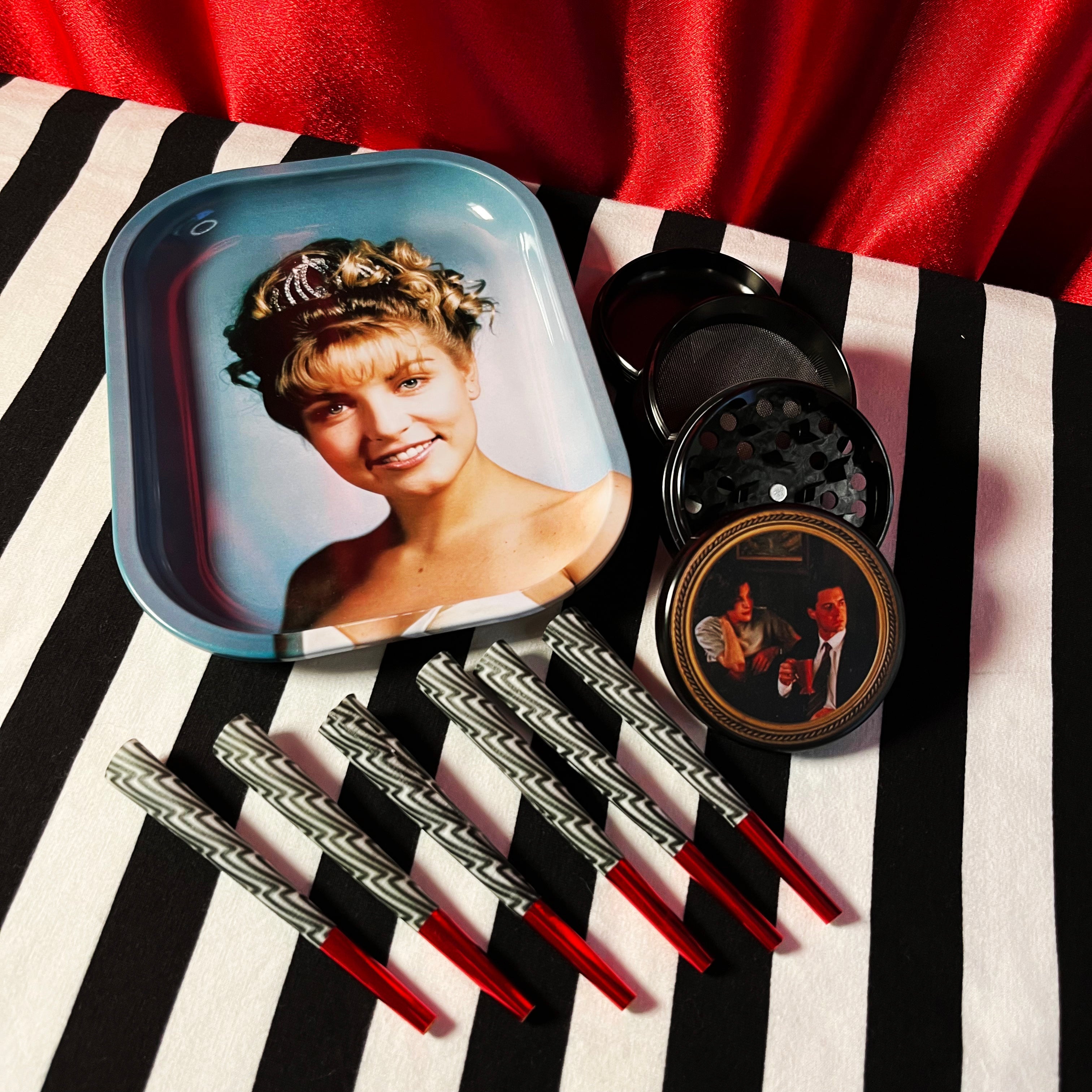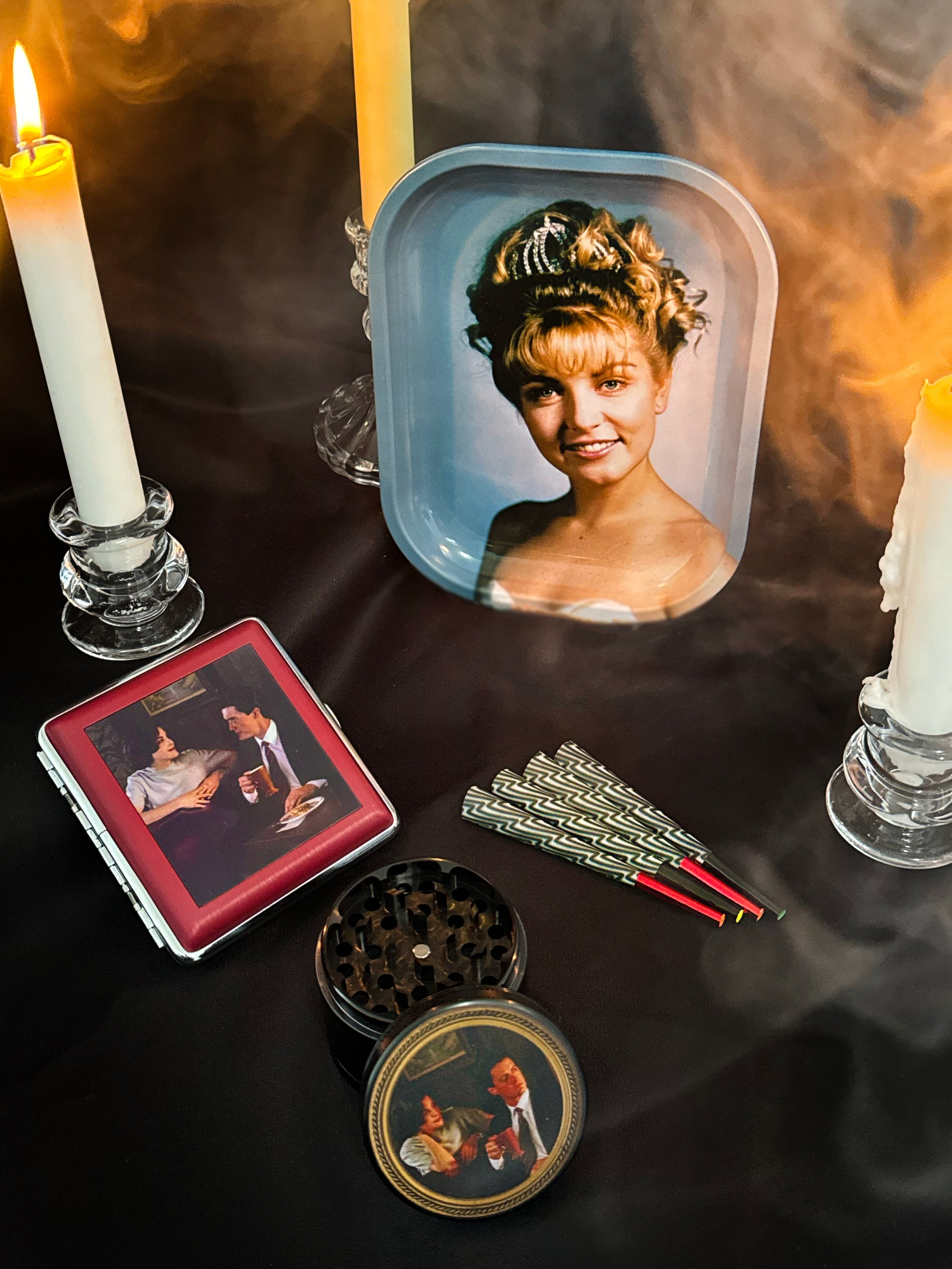 Covered in the iconic portrait of Laura Palmer, this tray is perf for rolling or as a lil trinket tray around your home. This one's for the twin peaks fans <3 a damn fine rolling tray