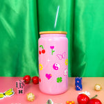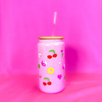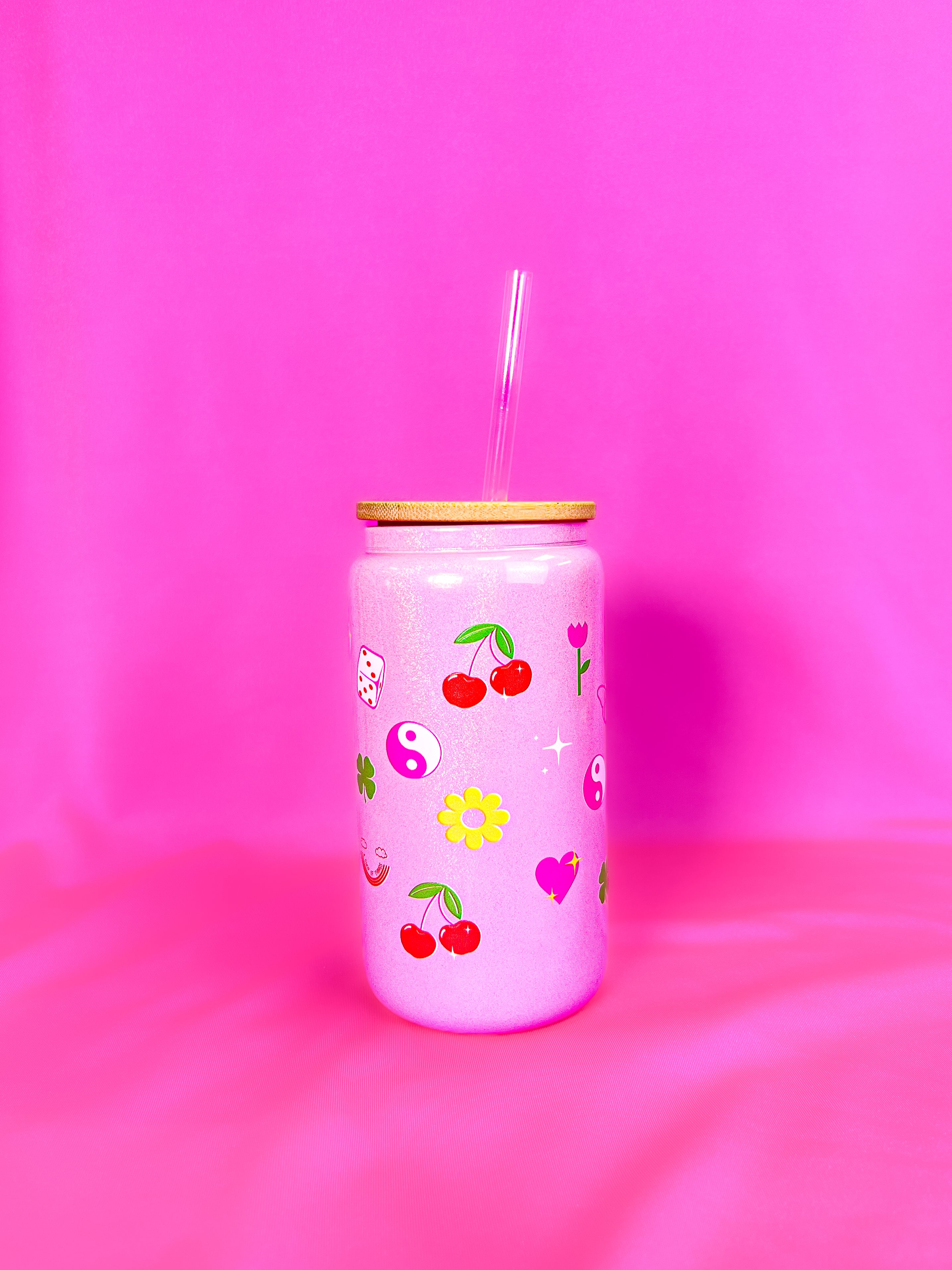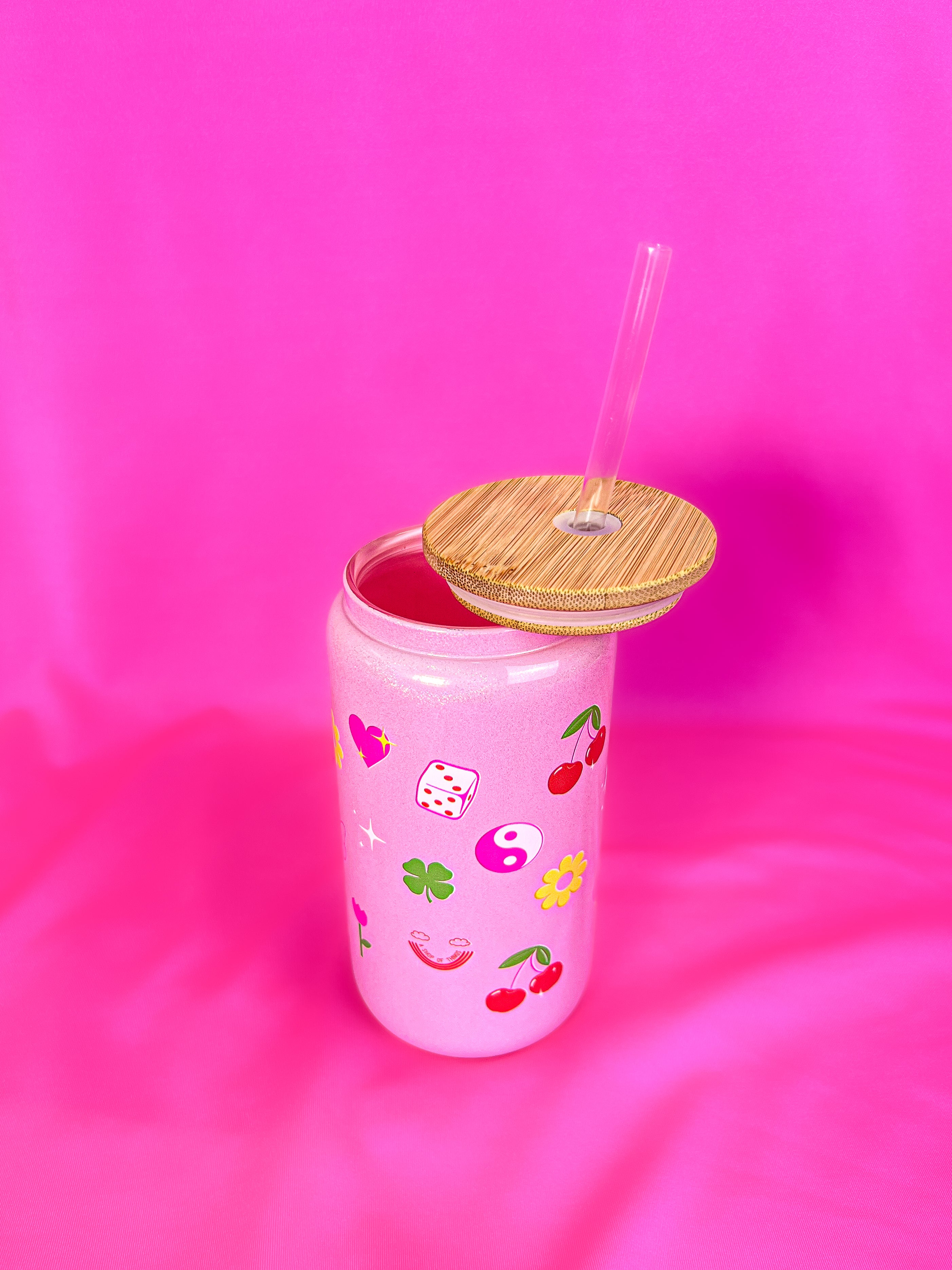 Capacity: 16 oz. Listing is for tumbler, lid, and straw. Made of pink glittery iridescent opaque glass.