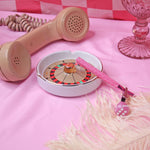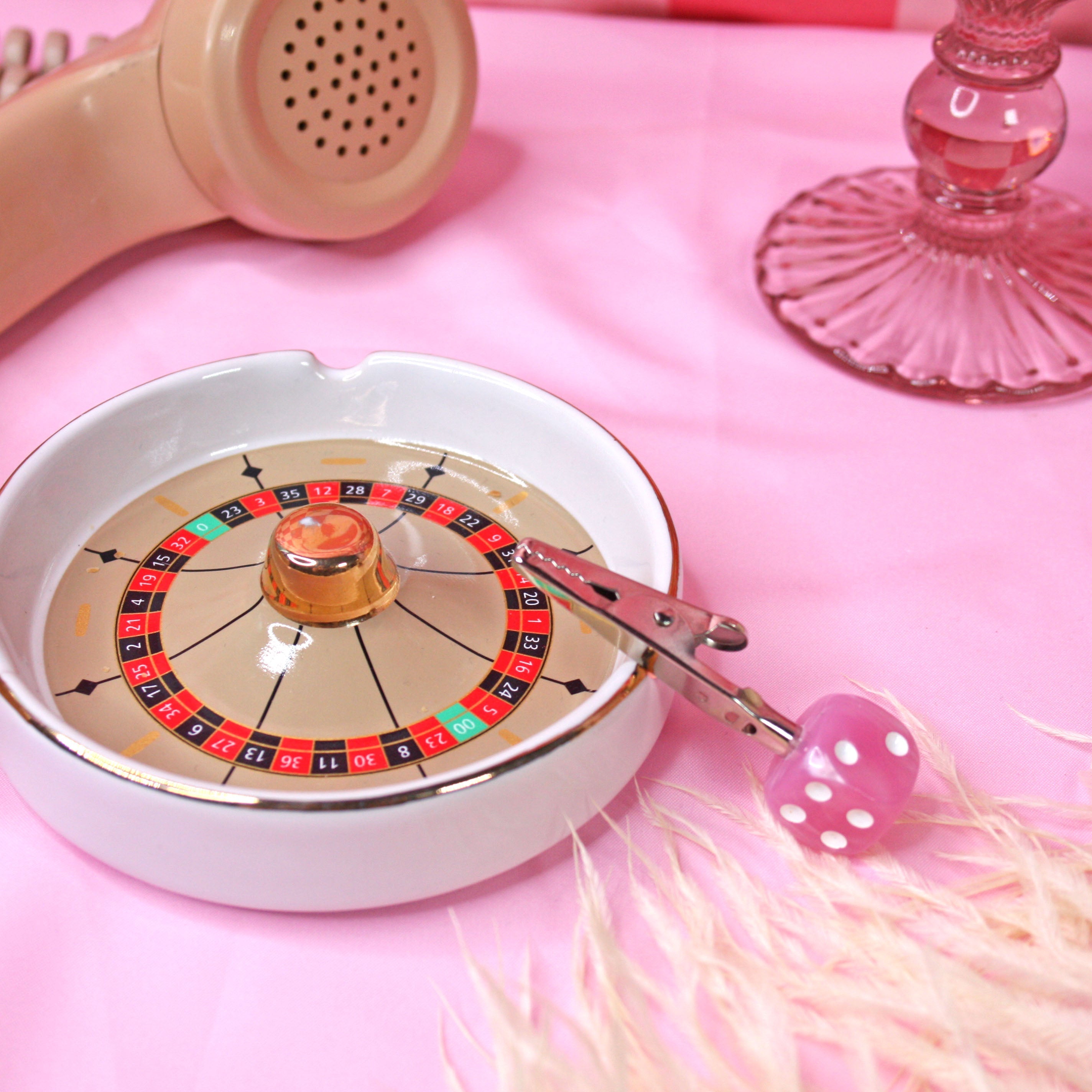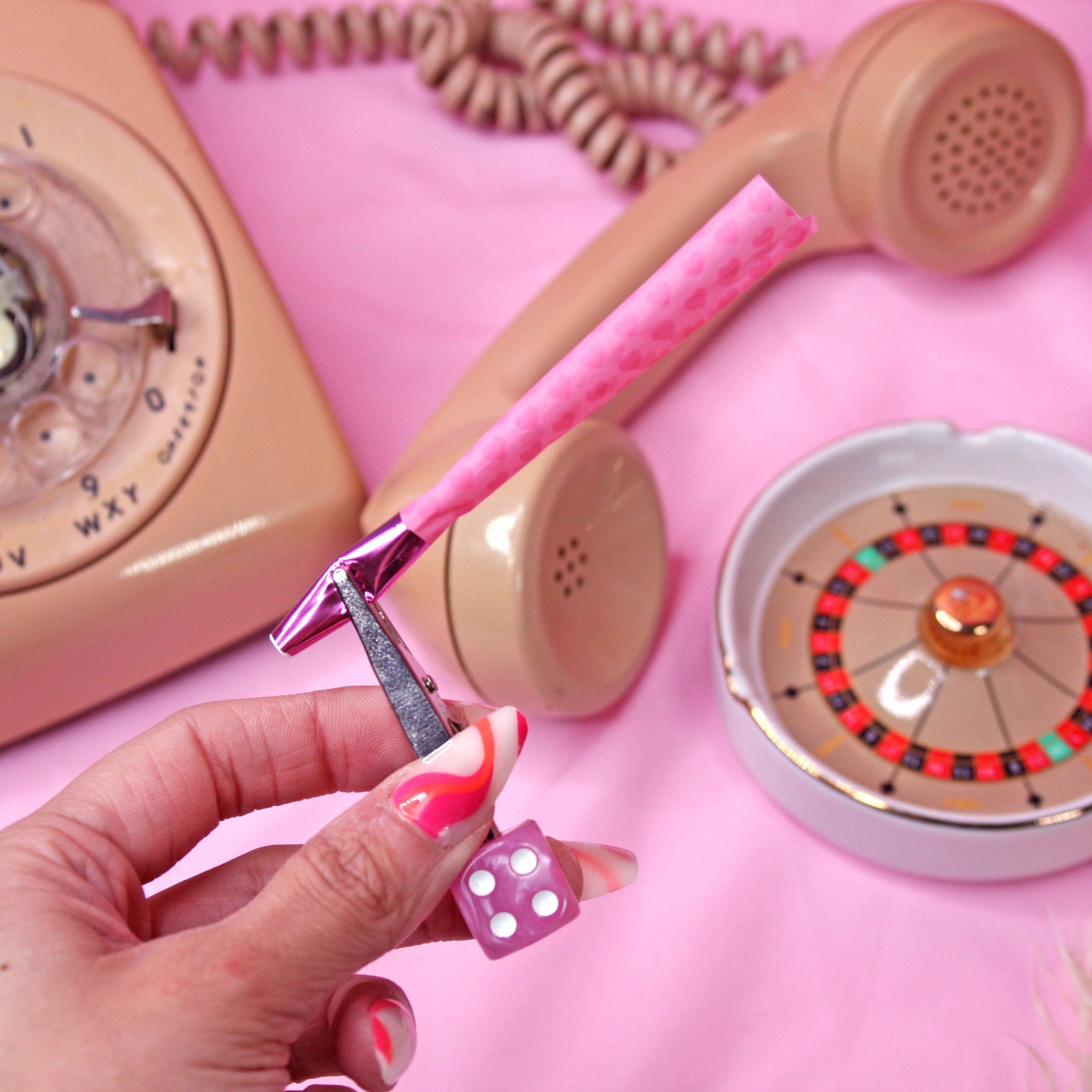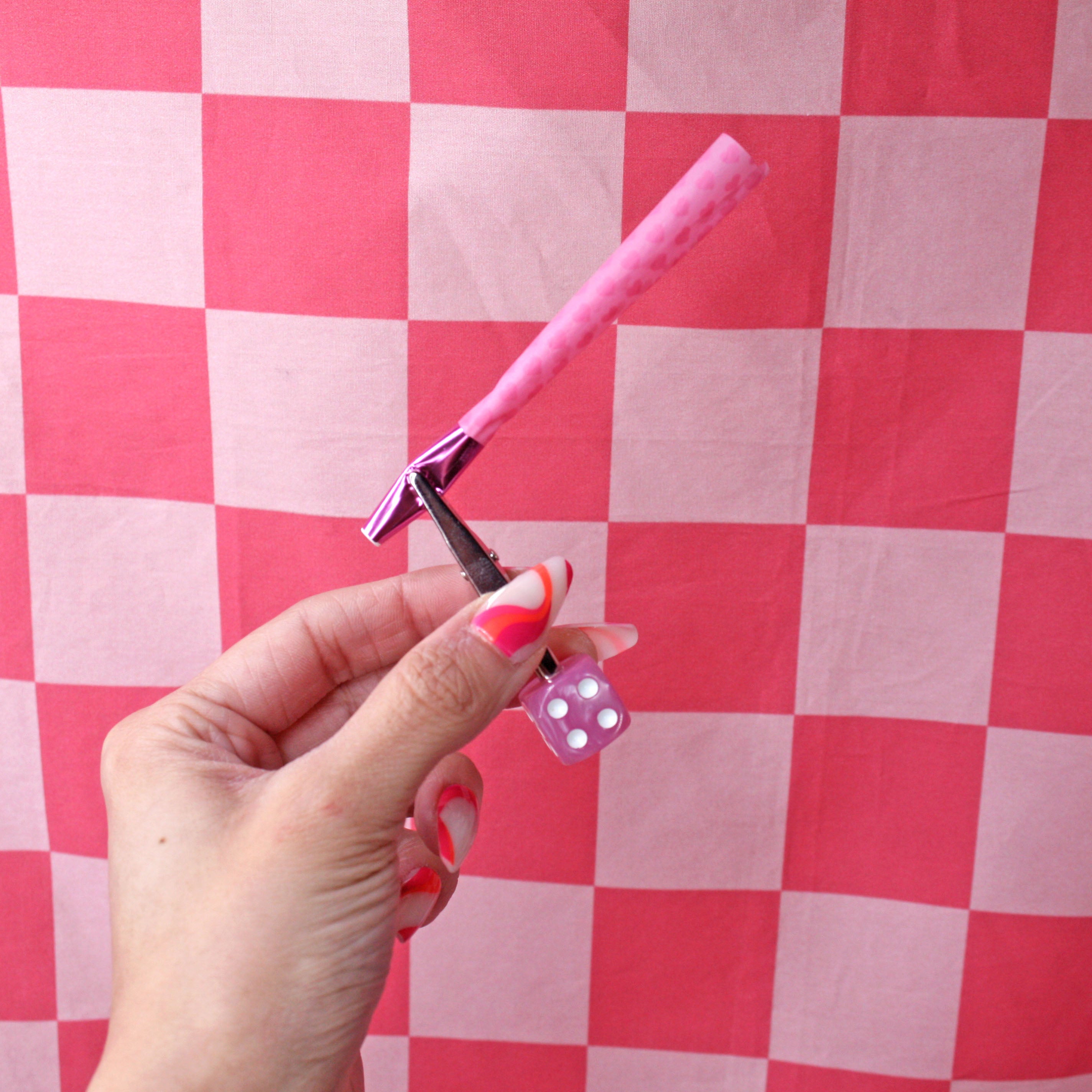 Joint stays clipped between the silver claws on the bottom of the clip. Real pink dice are the base of these clips.
