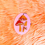 Measures 3" x 4" and is double-sided. Design is pink with an assortment of mushrooms.