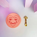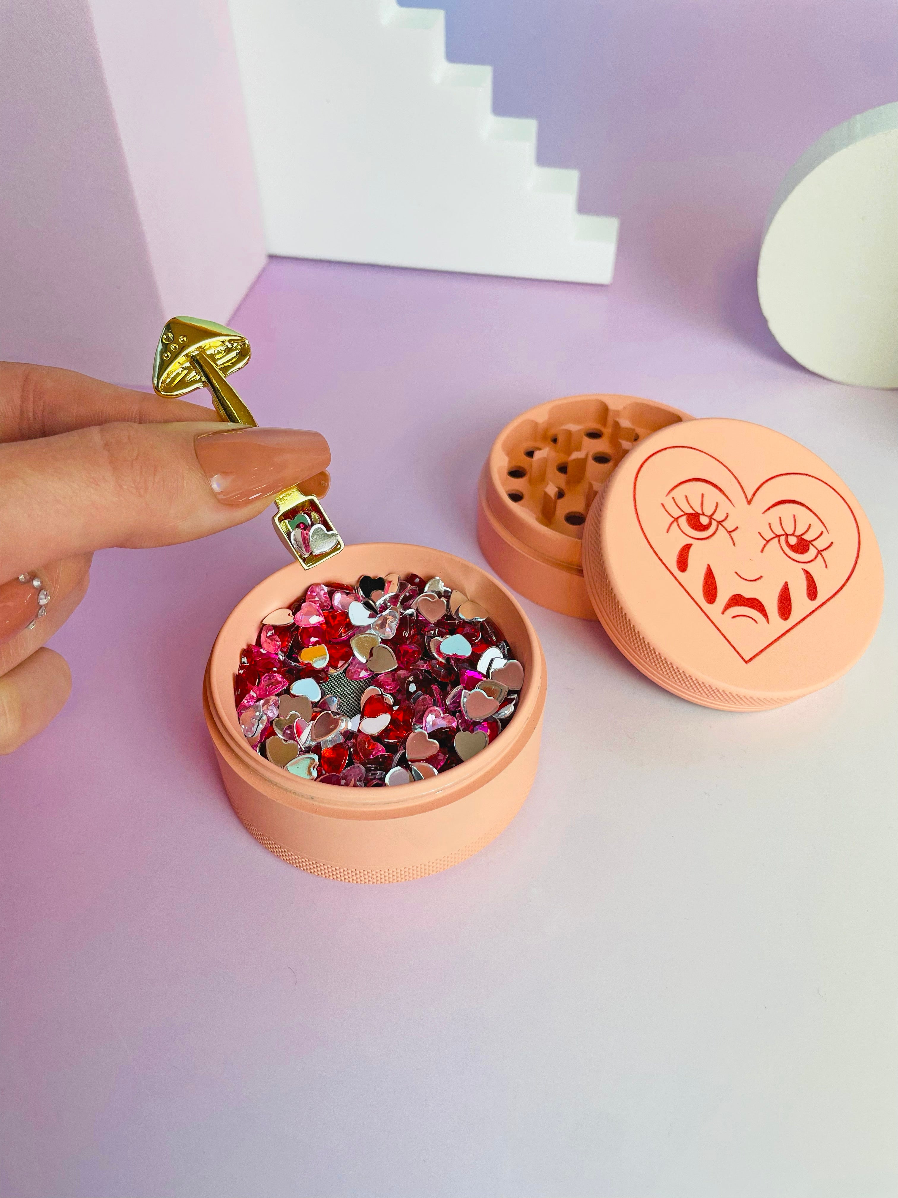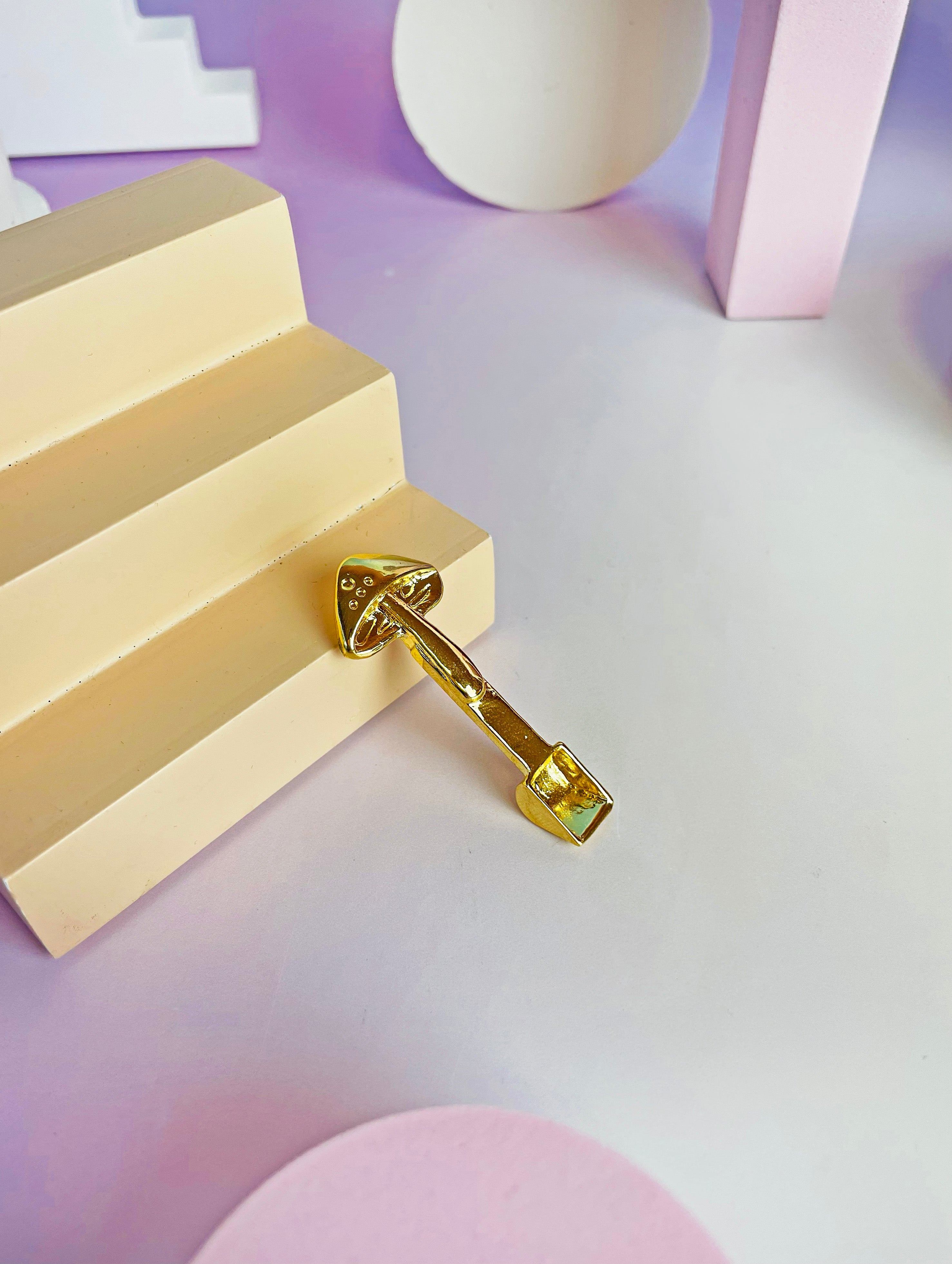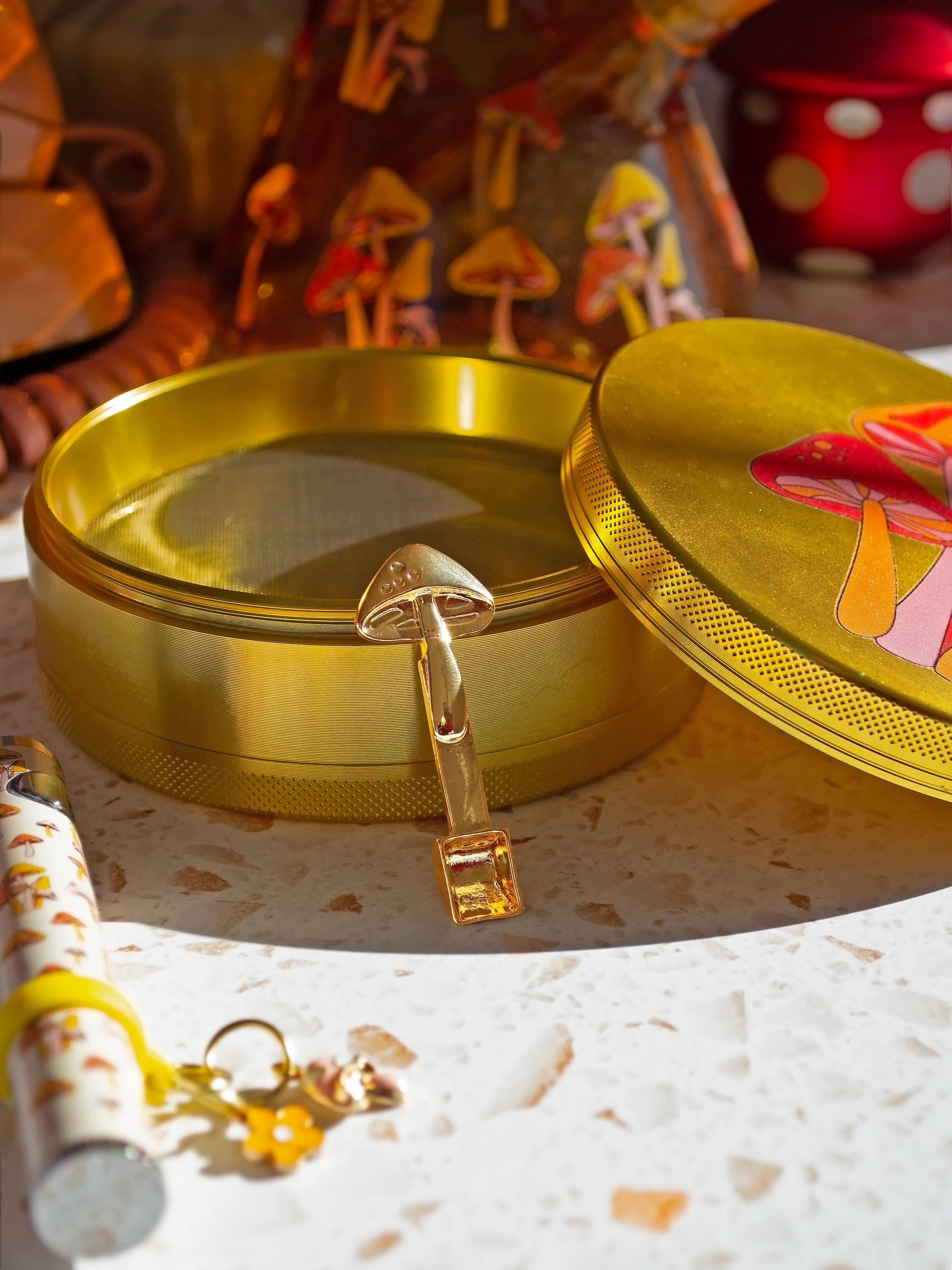 This gold tool has the cutest mushroom on the top of the handle, and fits perfectly in the bottom compartment of most grinders!
