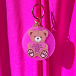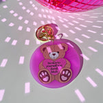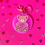 This keychain is made of pink acrylic and features a teddy with a sweet message.