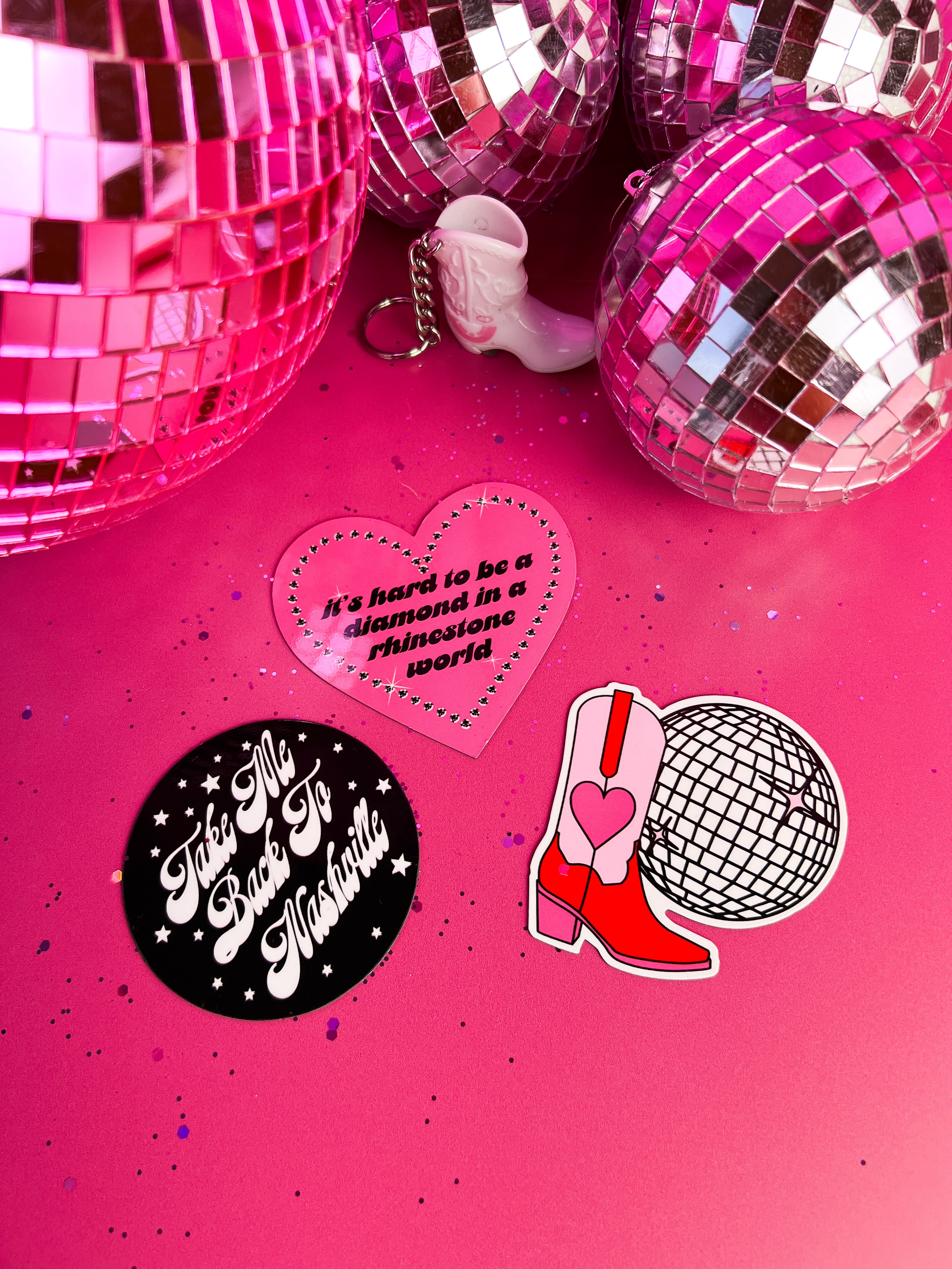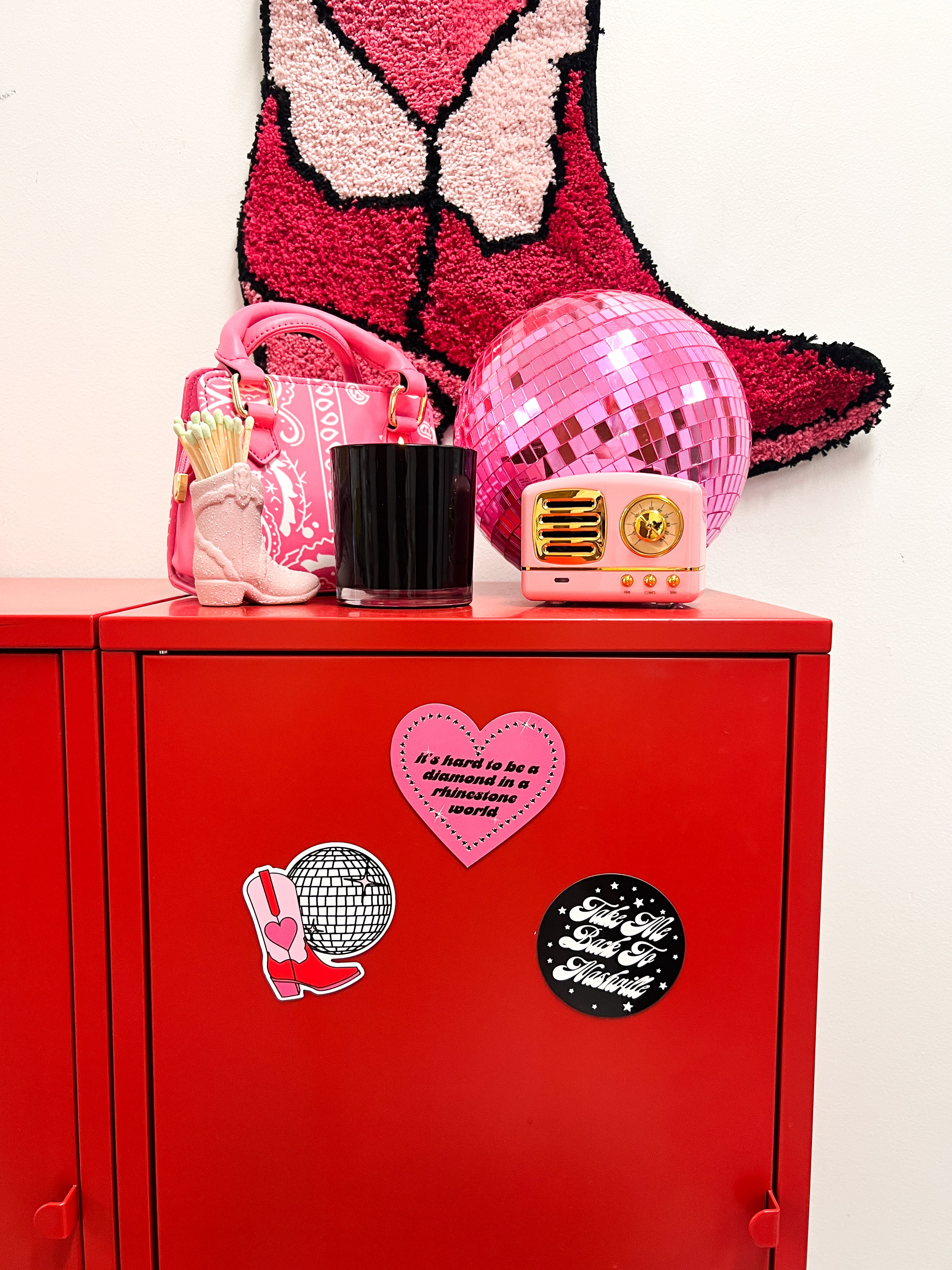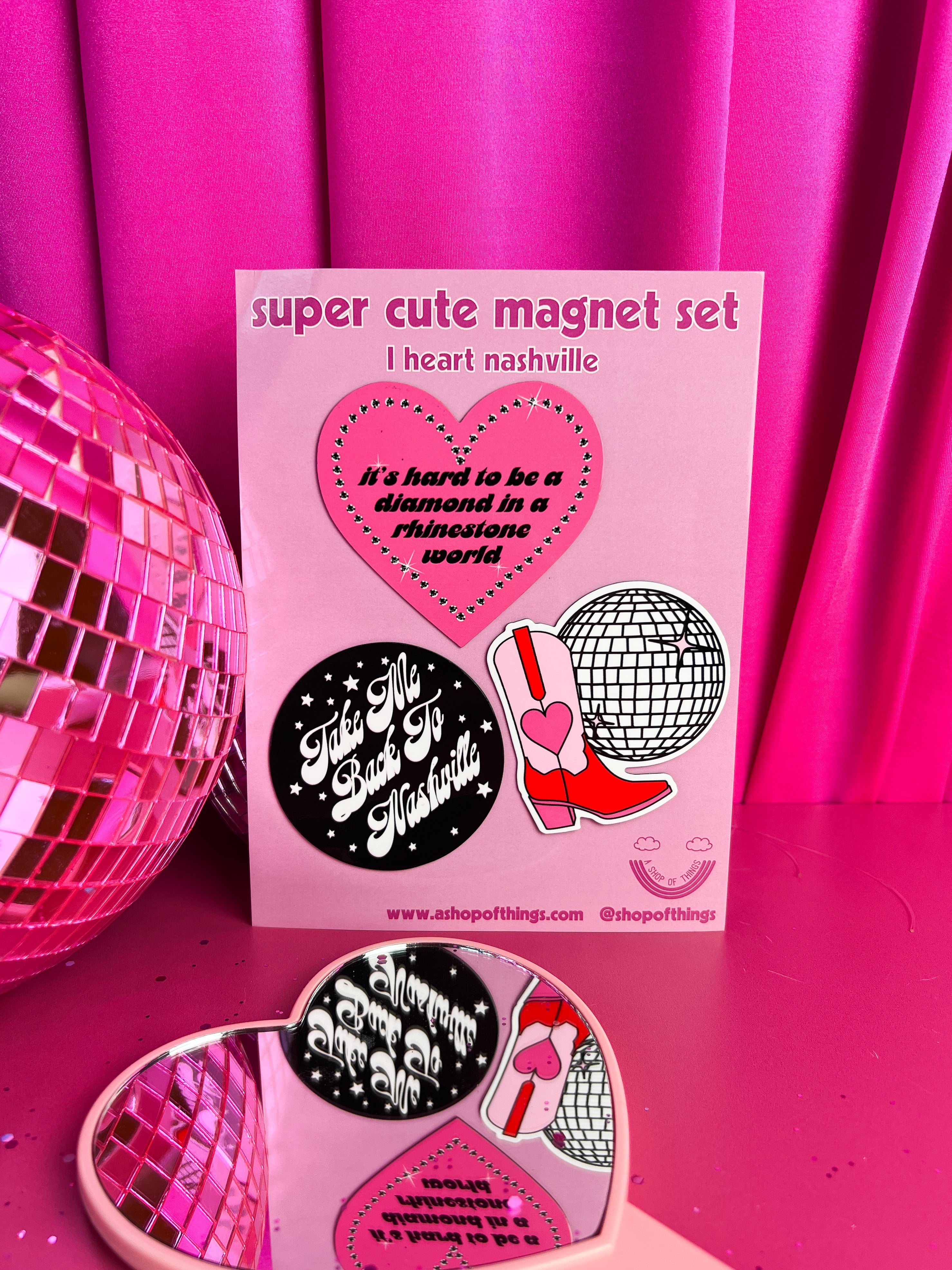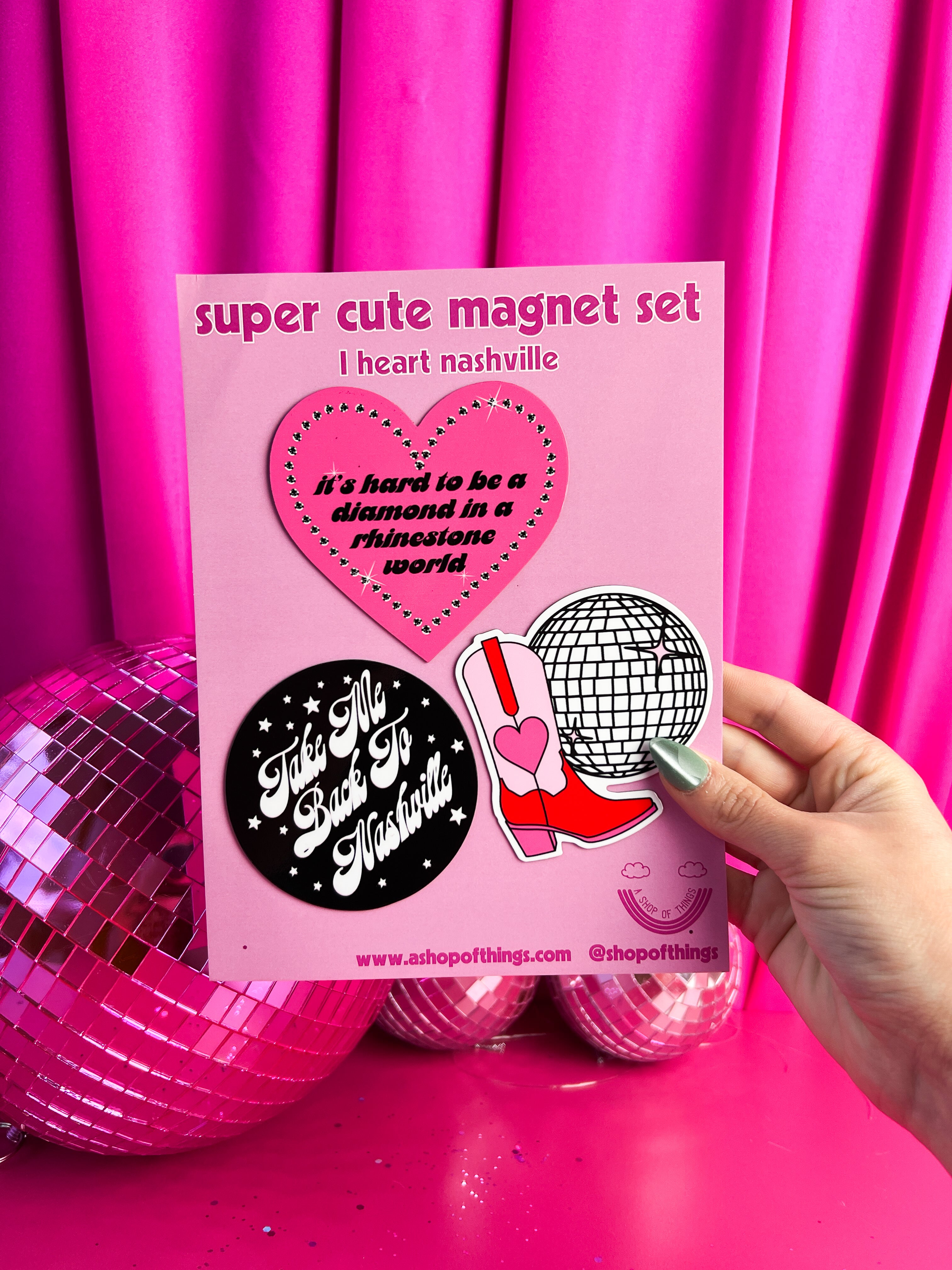 This set includes 3 magnets- a disco cowboy boot, a Dolly quote and a sweet Nashville magnet <3