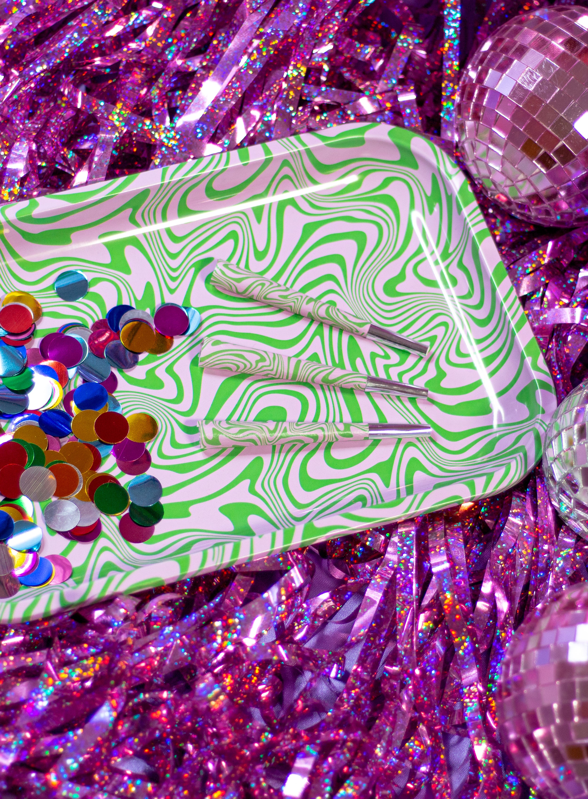 Covered in a trippy swirl, this tray is perf for rolling or as a lil trinket tray around your home.