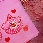 Bag is made of pvc coated canvas. This bag was made in collaboration with Linda of Creepy Gals. Design on the front is one (1) sad clown. Design on the back is three (3) clowns and the cute Creepy Gals logo.