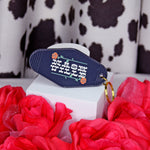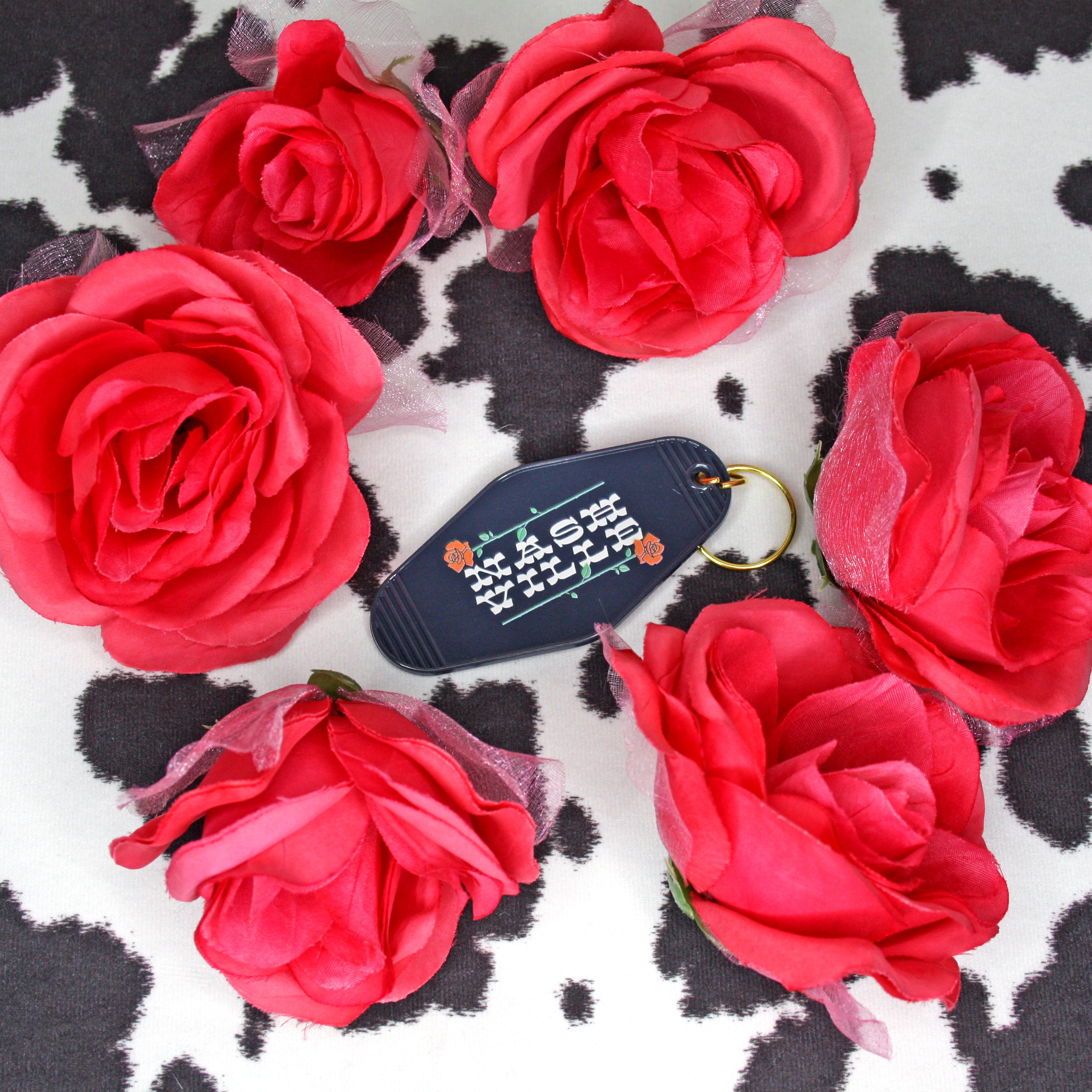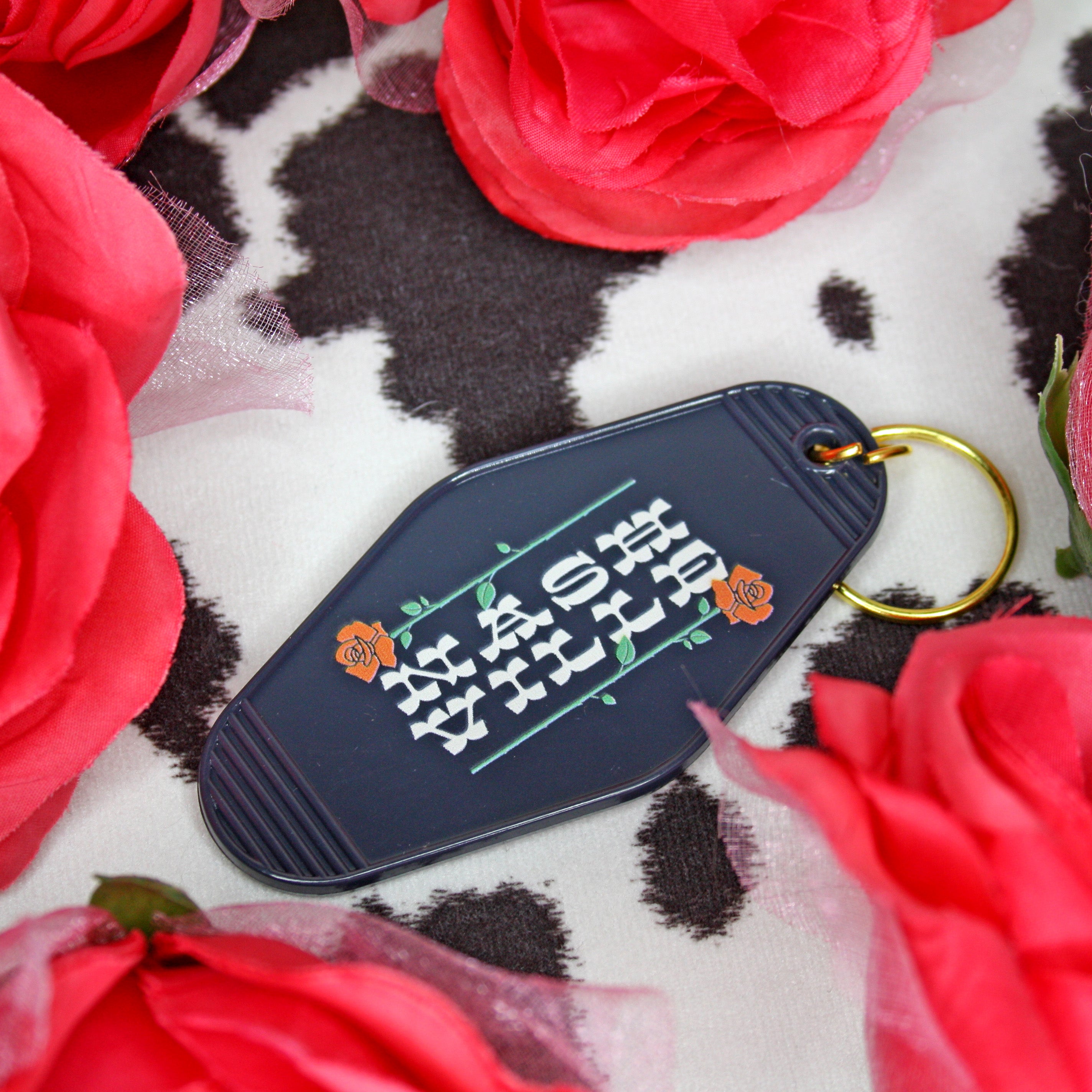 Vintage motel style keychain is 3.5" dark gray plastic with a 1.25" keyring for all your keychains.