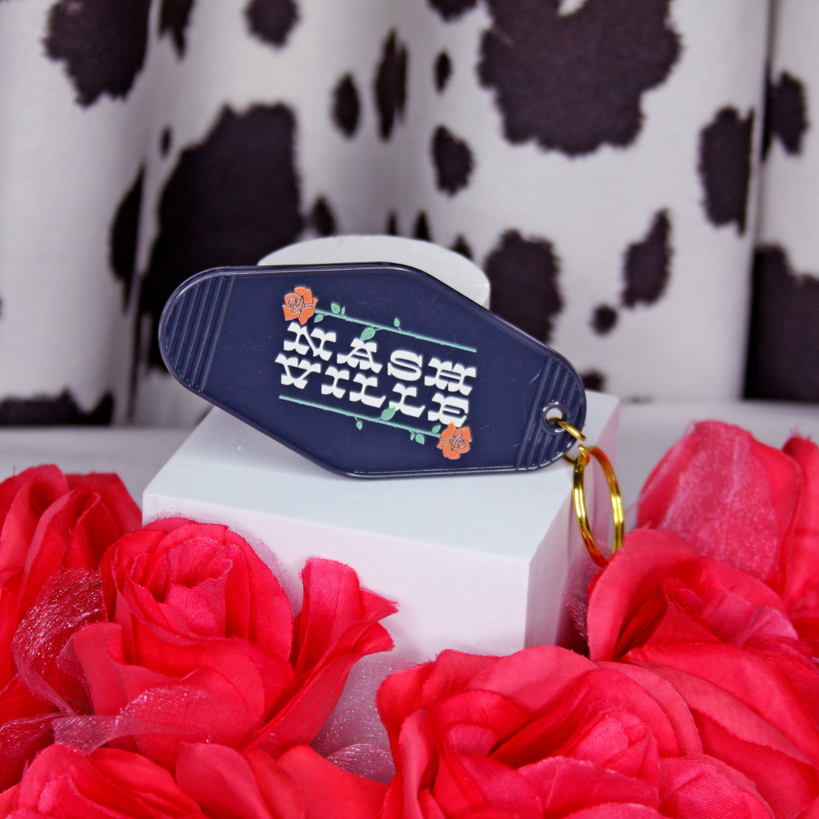 This keychain says NASHVILLE in on a charcoal gray motel keychain.