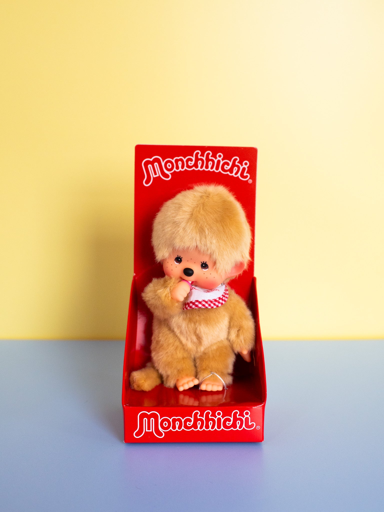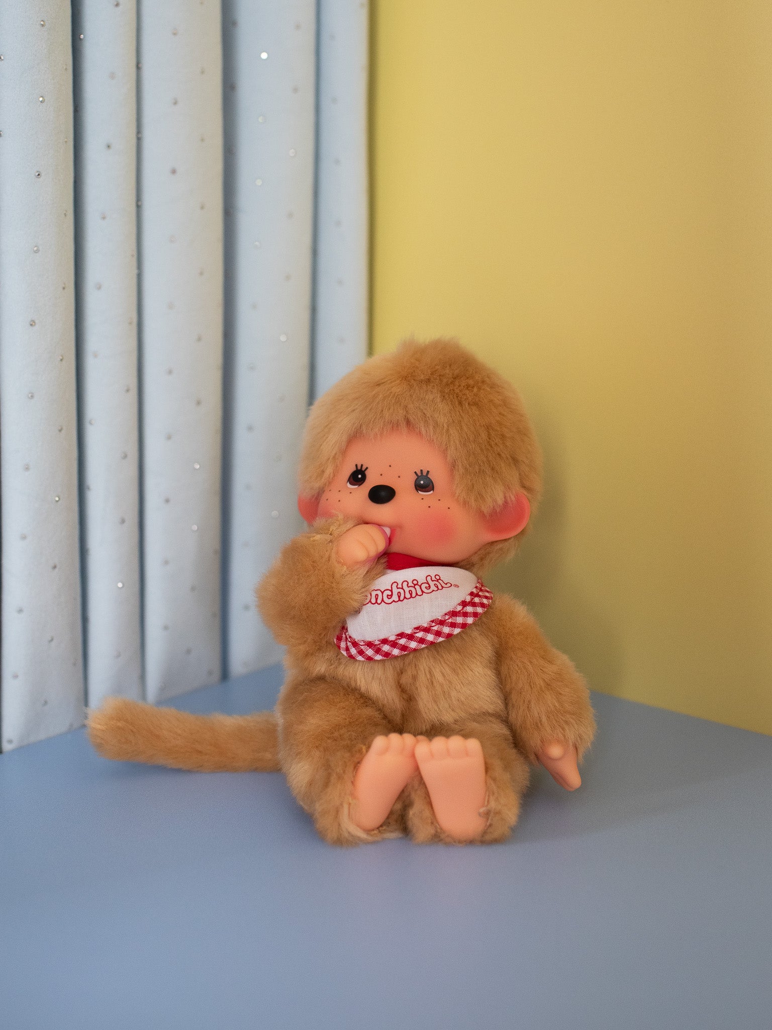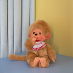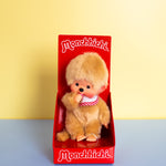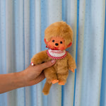 This Monchhichi has super soft and plush blonde fur, accessorized perfectly with a cute white and red Monchhichi bib! Perfect for gifting, adding to your growing collection, or just to add some fun vibes to your space!