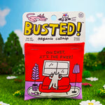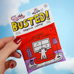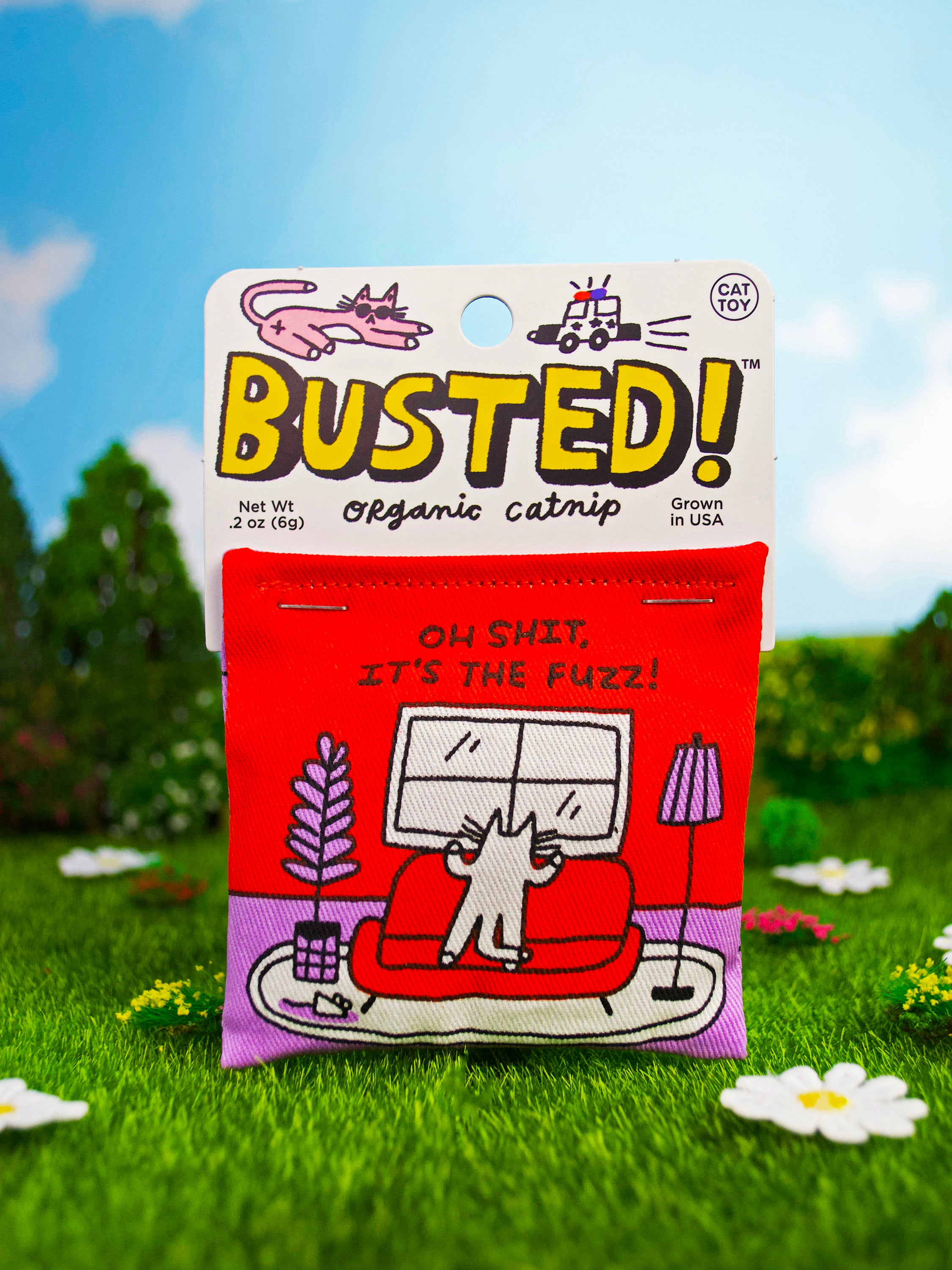 Featuring a kitty peeking out the window and the saying, "oh shit. it's the fuzz!" on one side, and another window cat saying, "act normal!!" on the other!