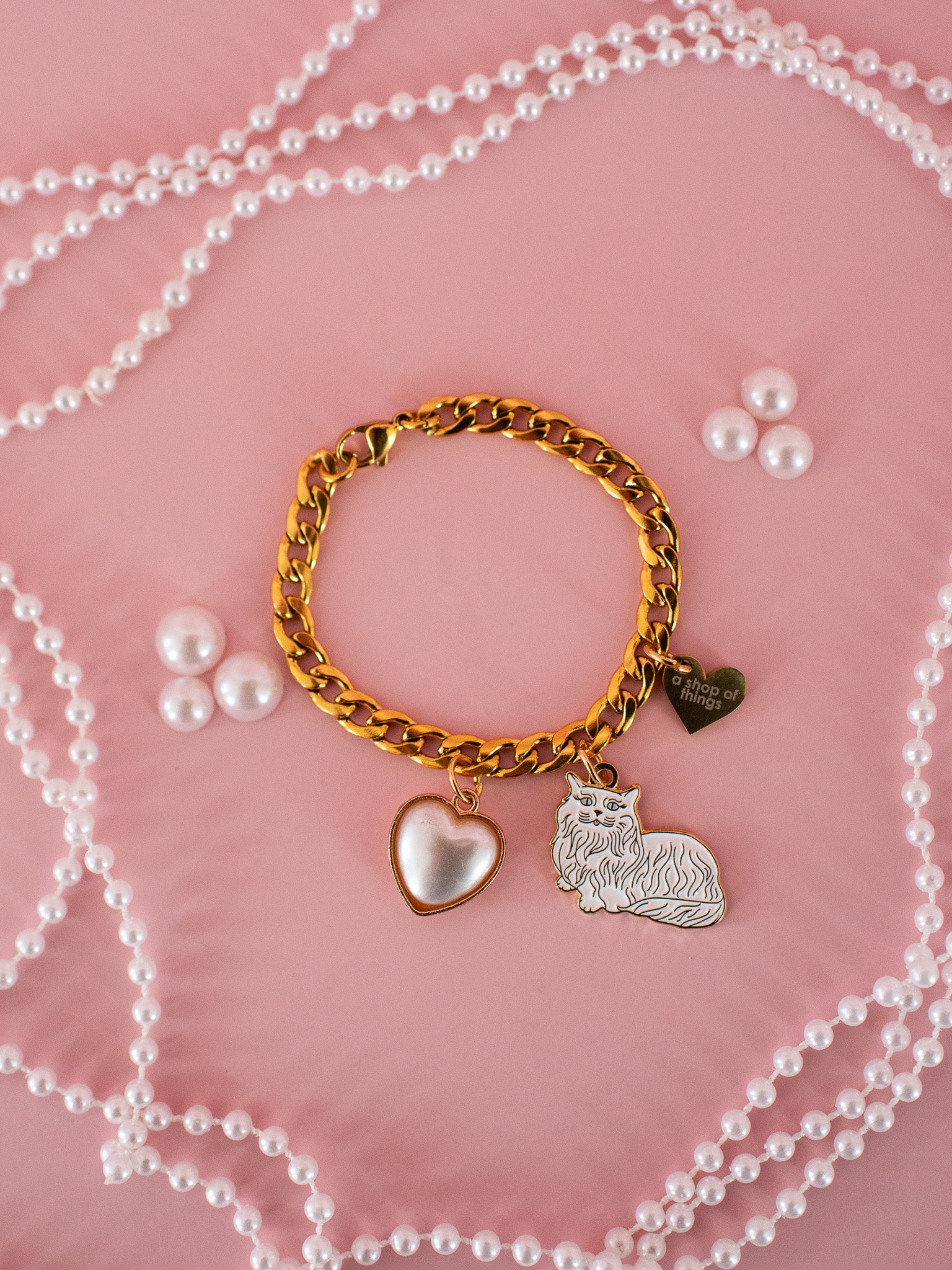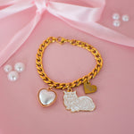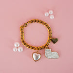 This cup charm is made from a gold toned curb link chain and has a pearl heart, cat, and gold heart charm attached.