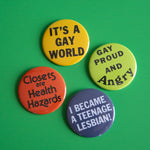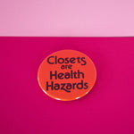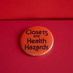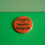 This red button pin reads, "closets are health hazards" in a black font! Iconic.