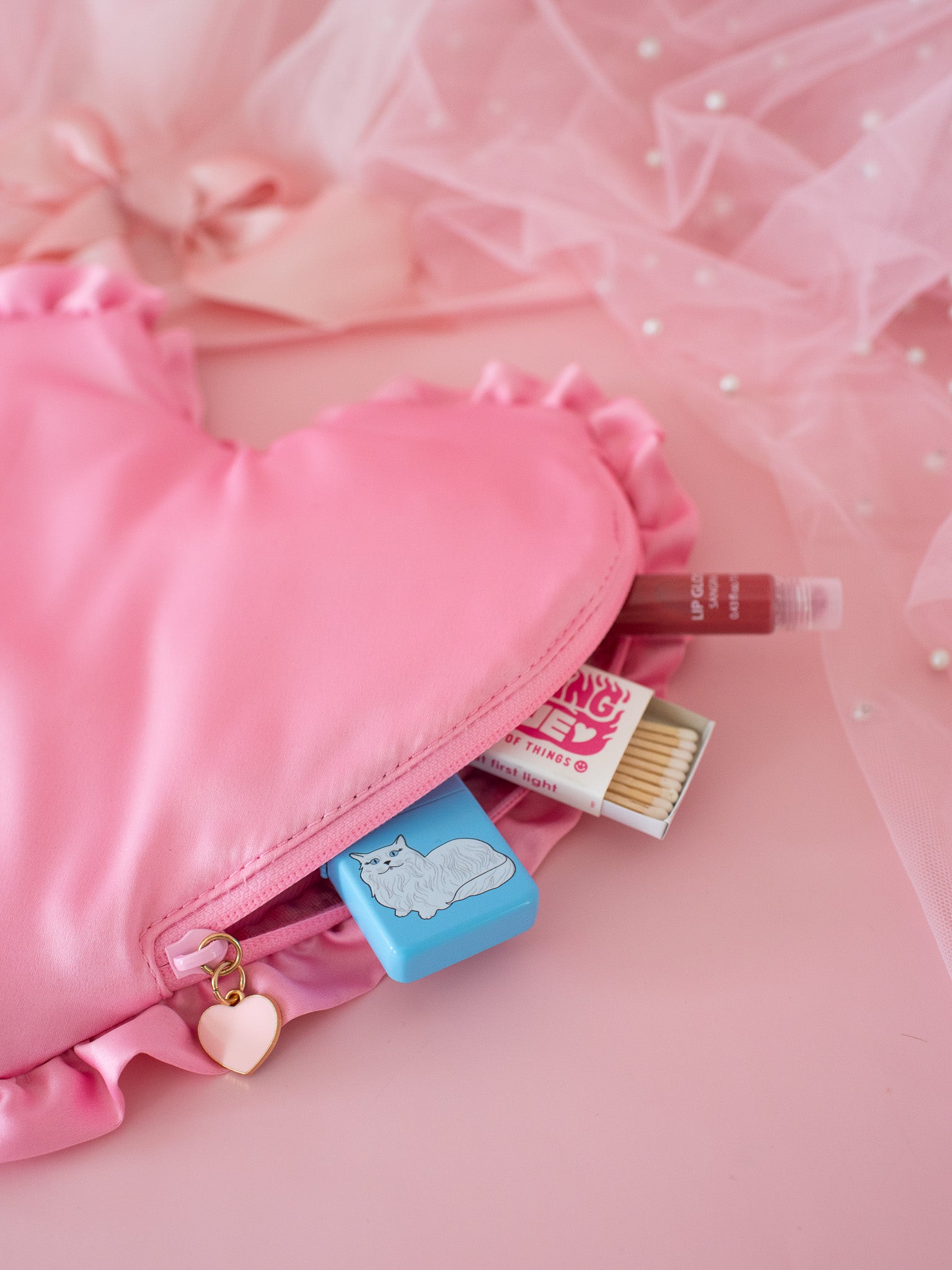Made of pink satin with a waterproof zipper and smell proof lining.