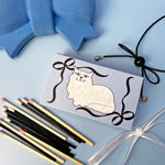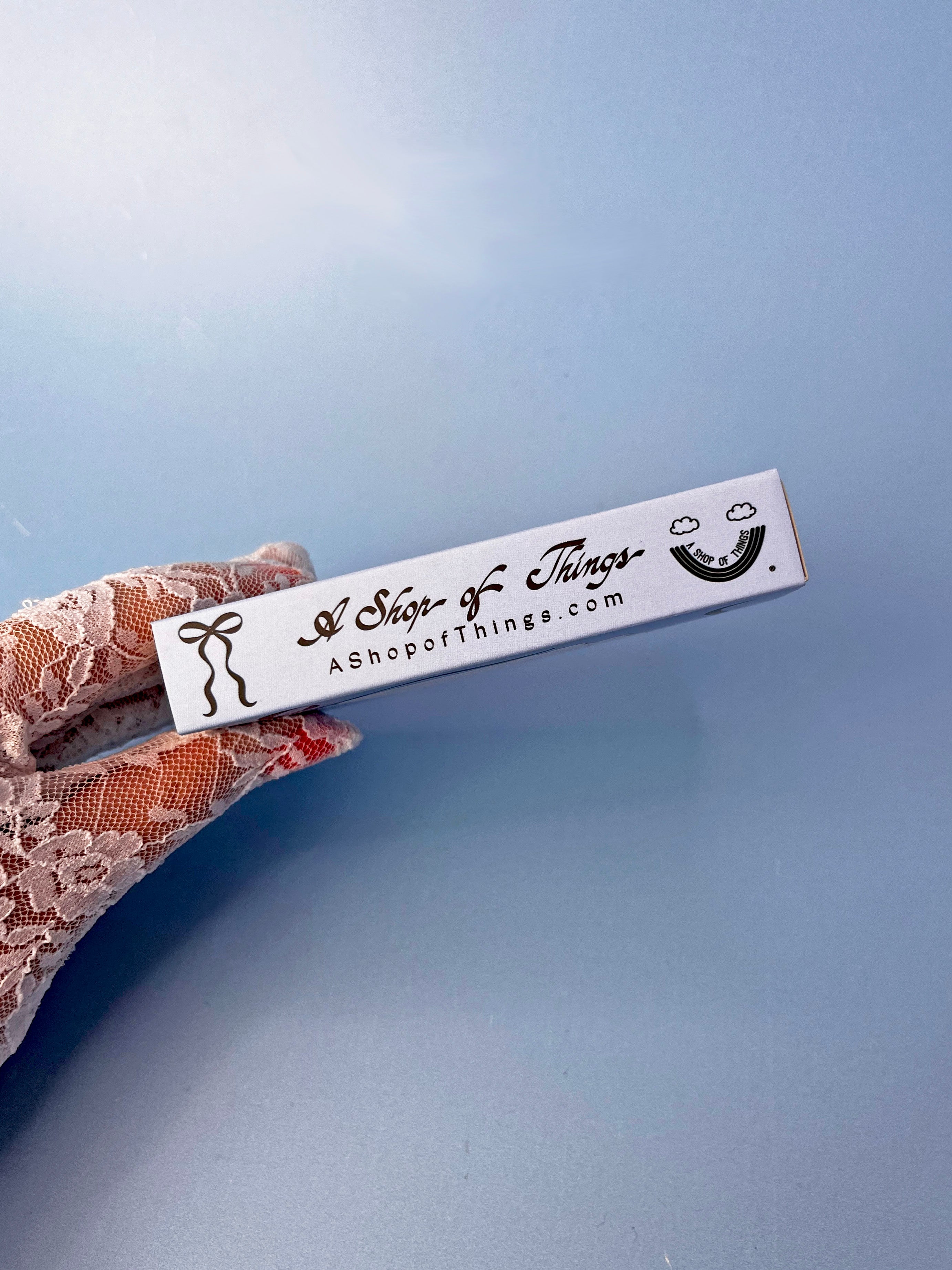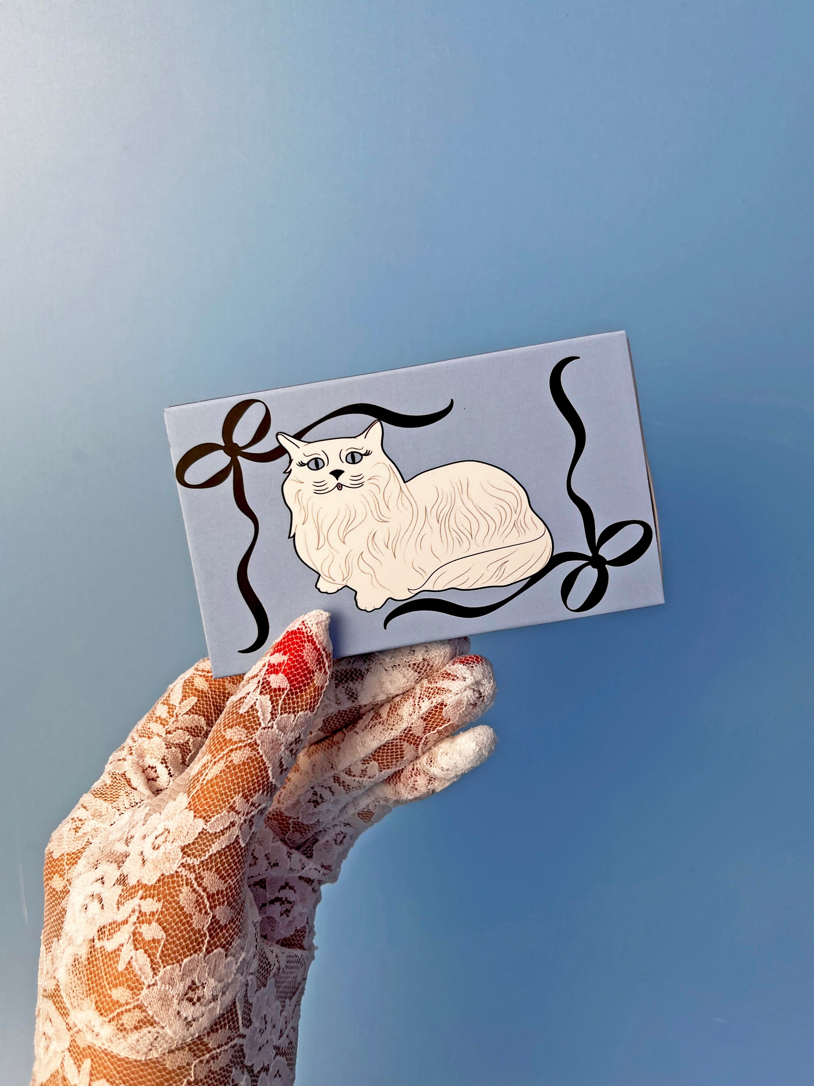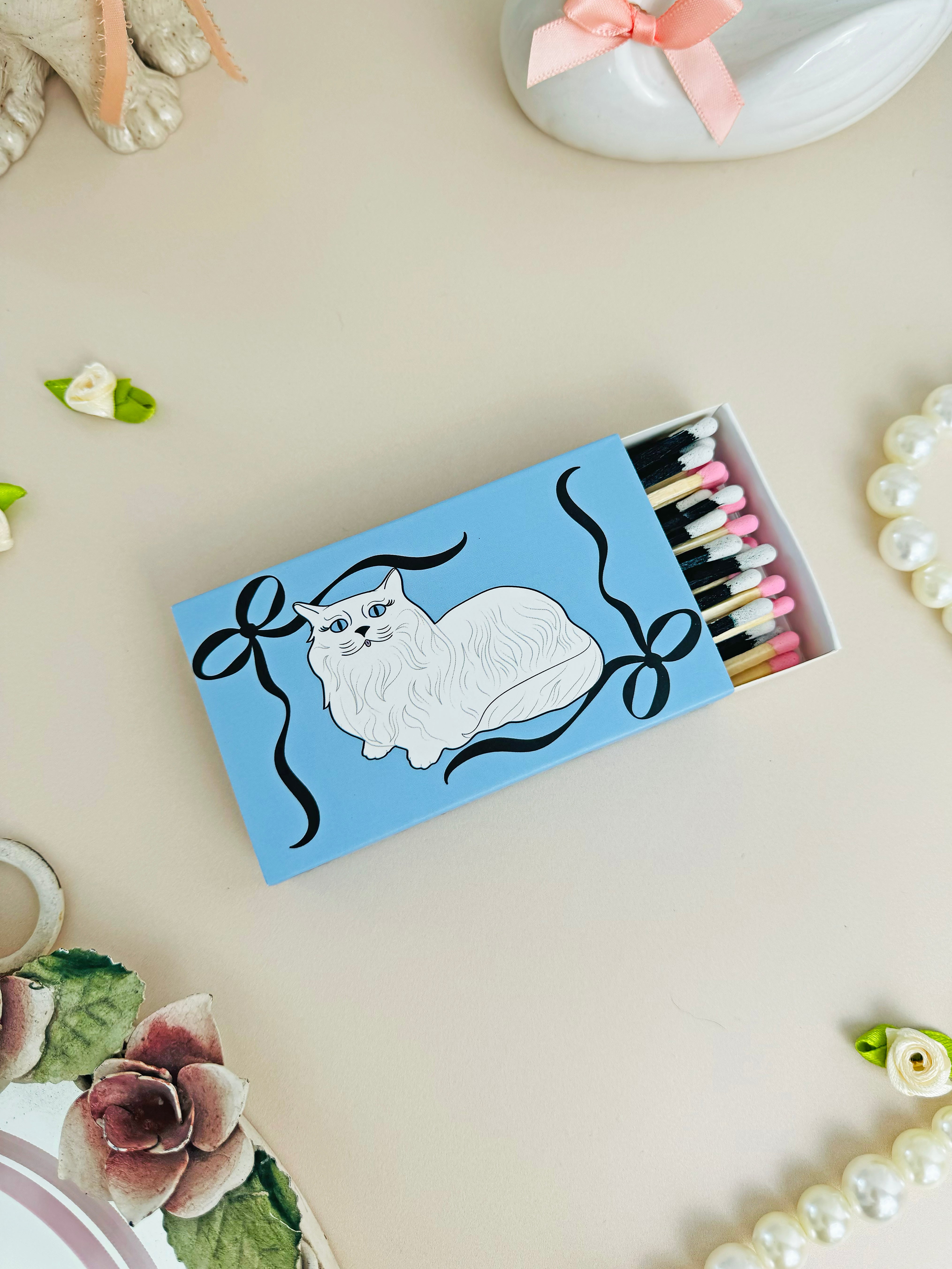 The match box features the same art on the front and back, a kitty cat with some cute bows. On the side of the matchbox is a striker and inside are special black/white and pink large match sticks.