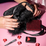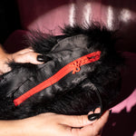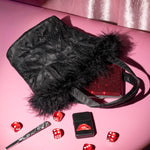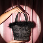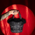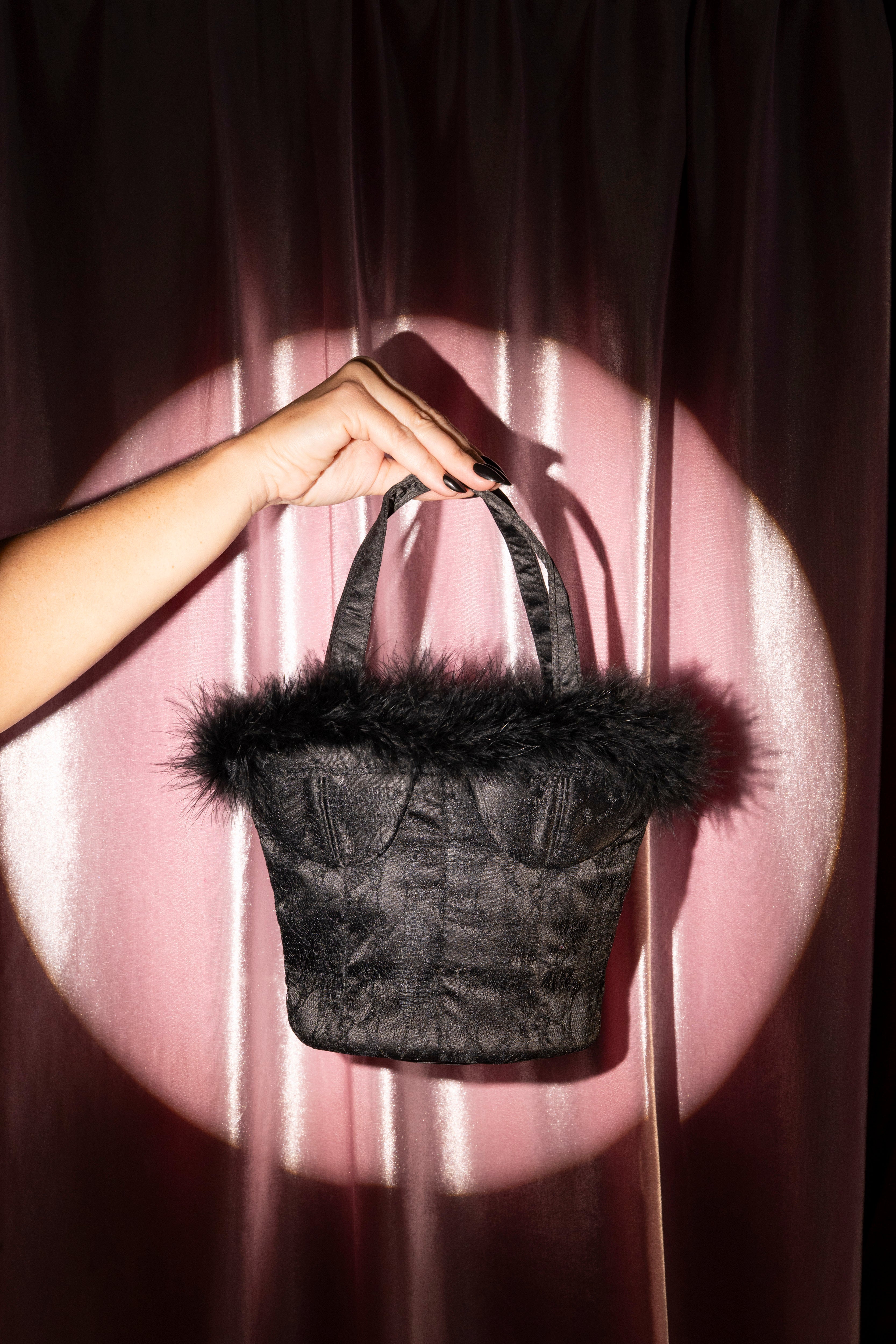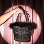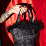 This black satin bag is textured with delicate lace and shaped like the dreamiest little corset! It features a row of stunning black feathers along the top and 2 sleek black handles for convenient carrying. It zips open and closed with a cute red bow zipper-pull, revealing a gorgeous red lining inside! What more could a girlie ask for?
