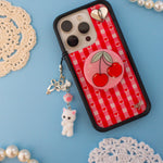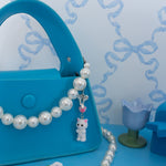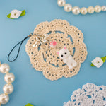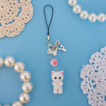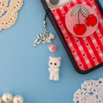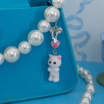 Features one REALLY cute fuzzy white cat with kitty paw and bow charms. Has a removable attachment cord that makes it super easy to attach to your phone, bag, keys, etc!