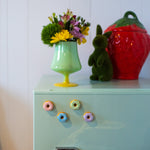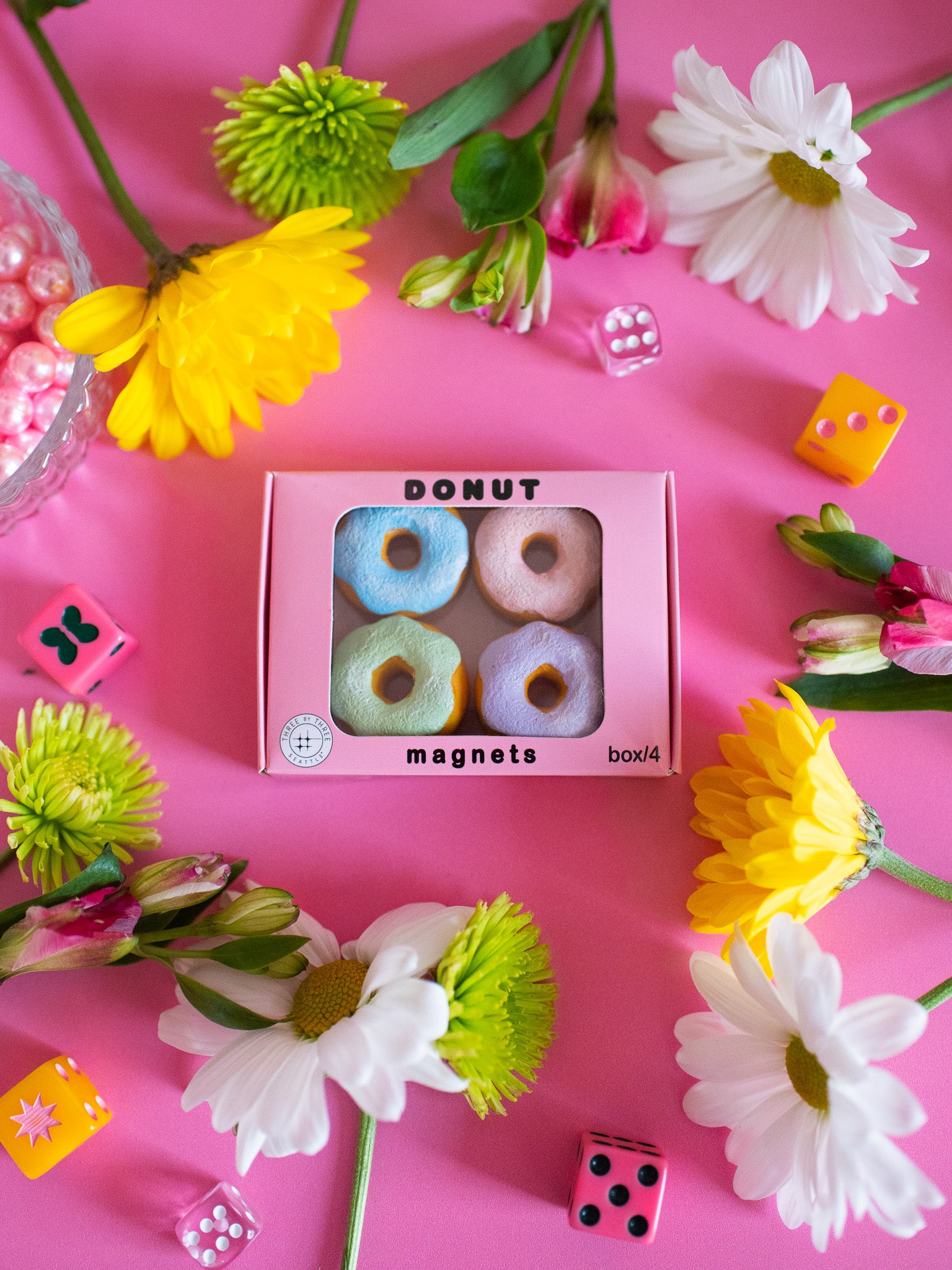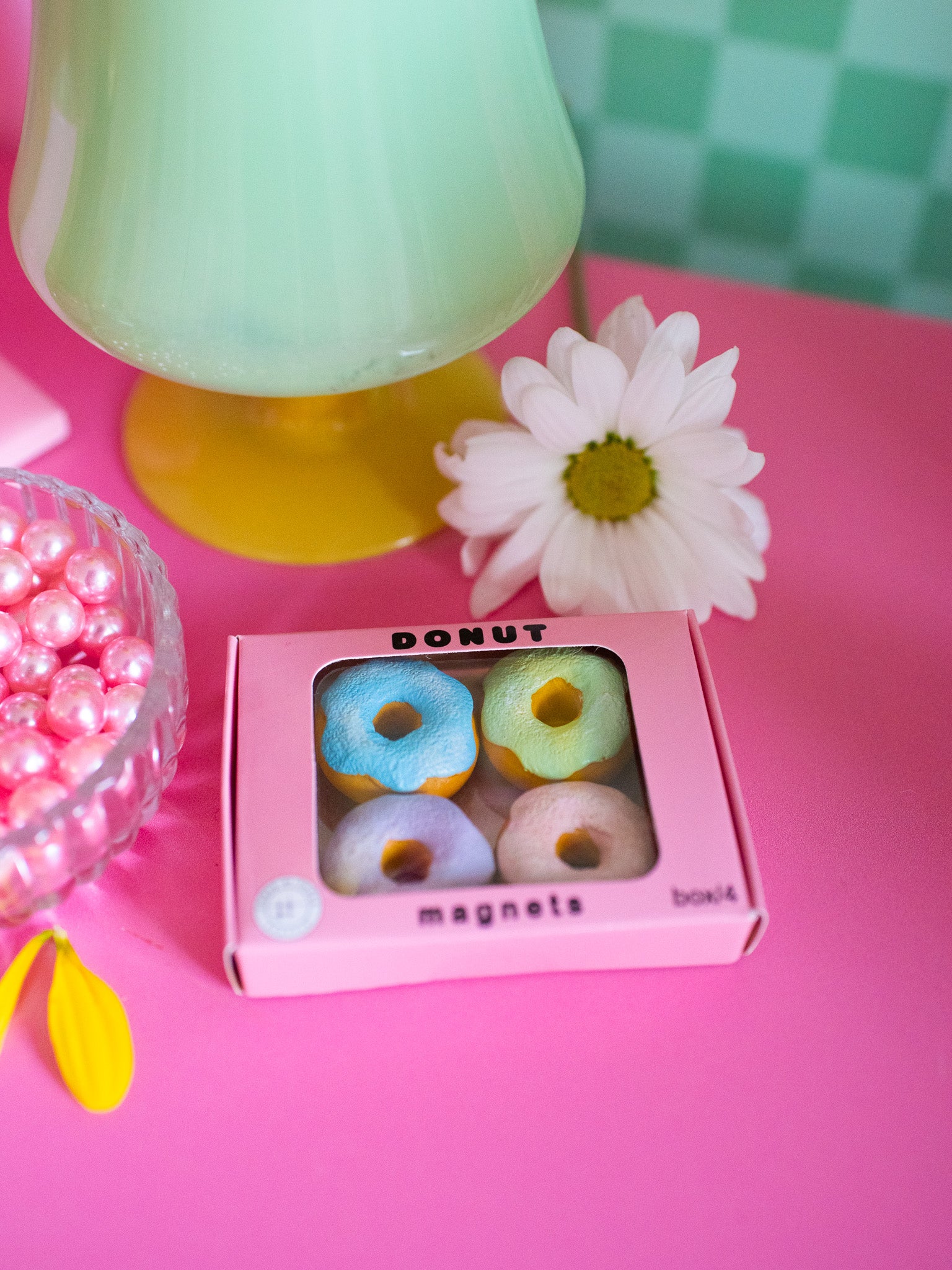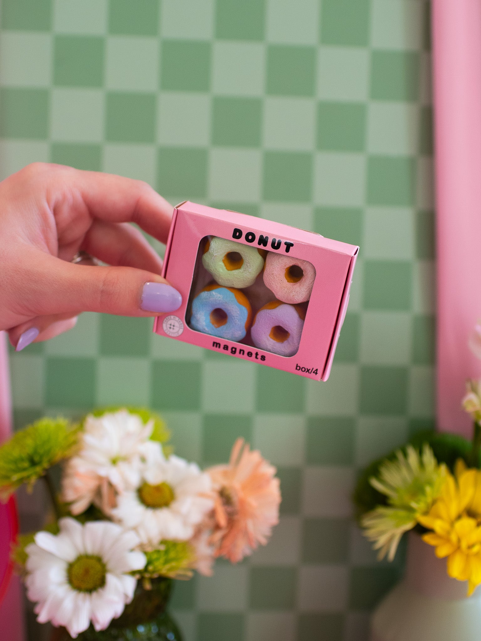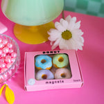 Jazz up your fridge with these adorable donut magnets! This set features 4 sweet as can be donuts, all with different colored icing. Yummy. Perfect for fridges, lockers, calendar boards, etc!