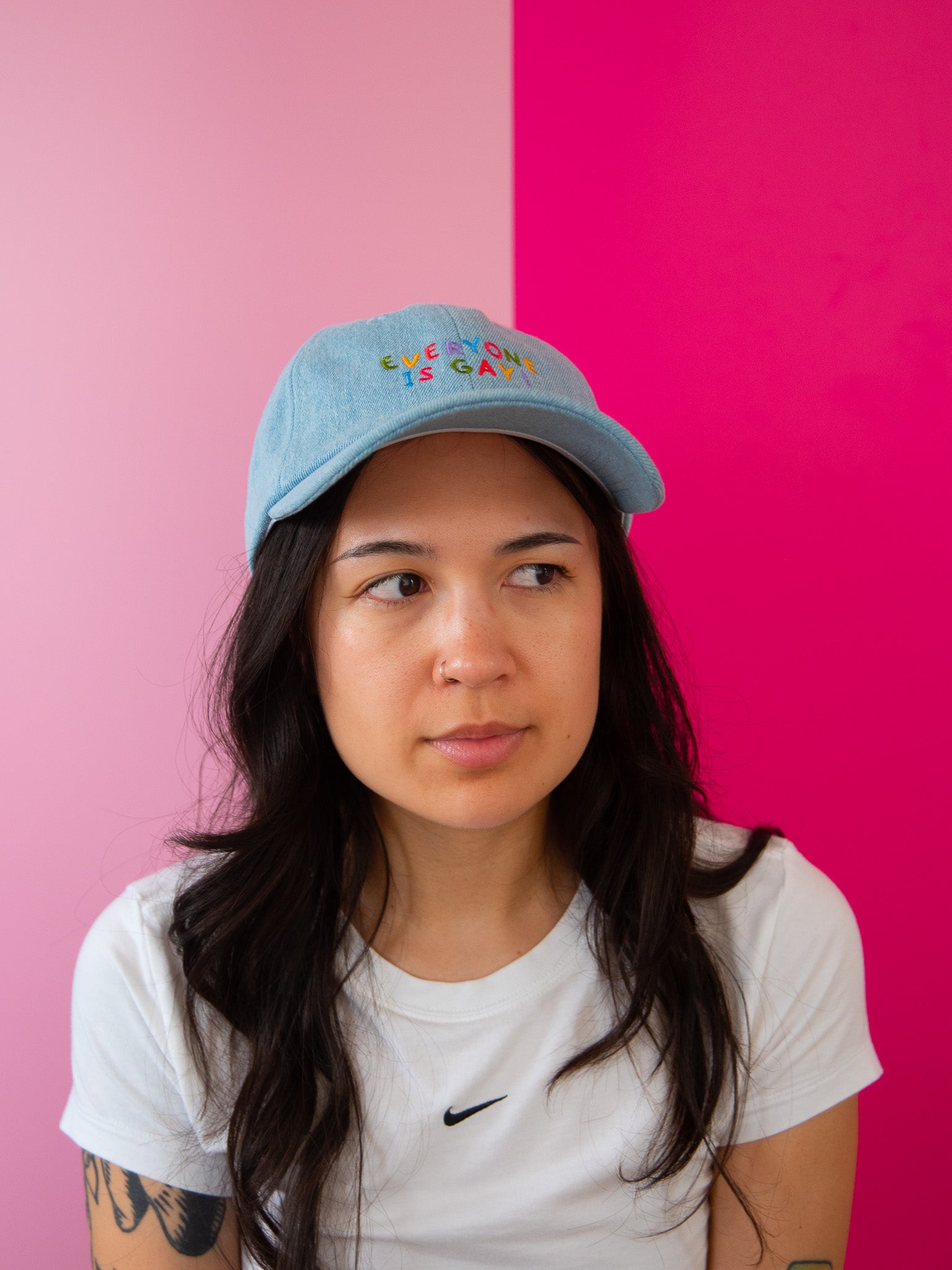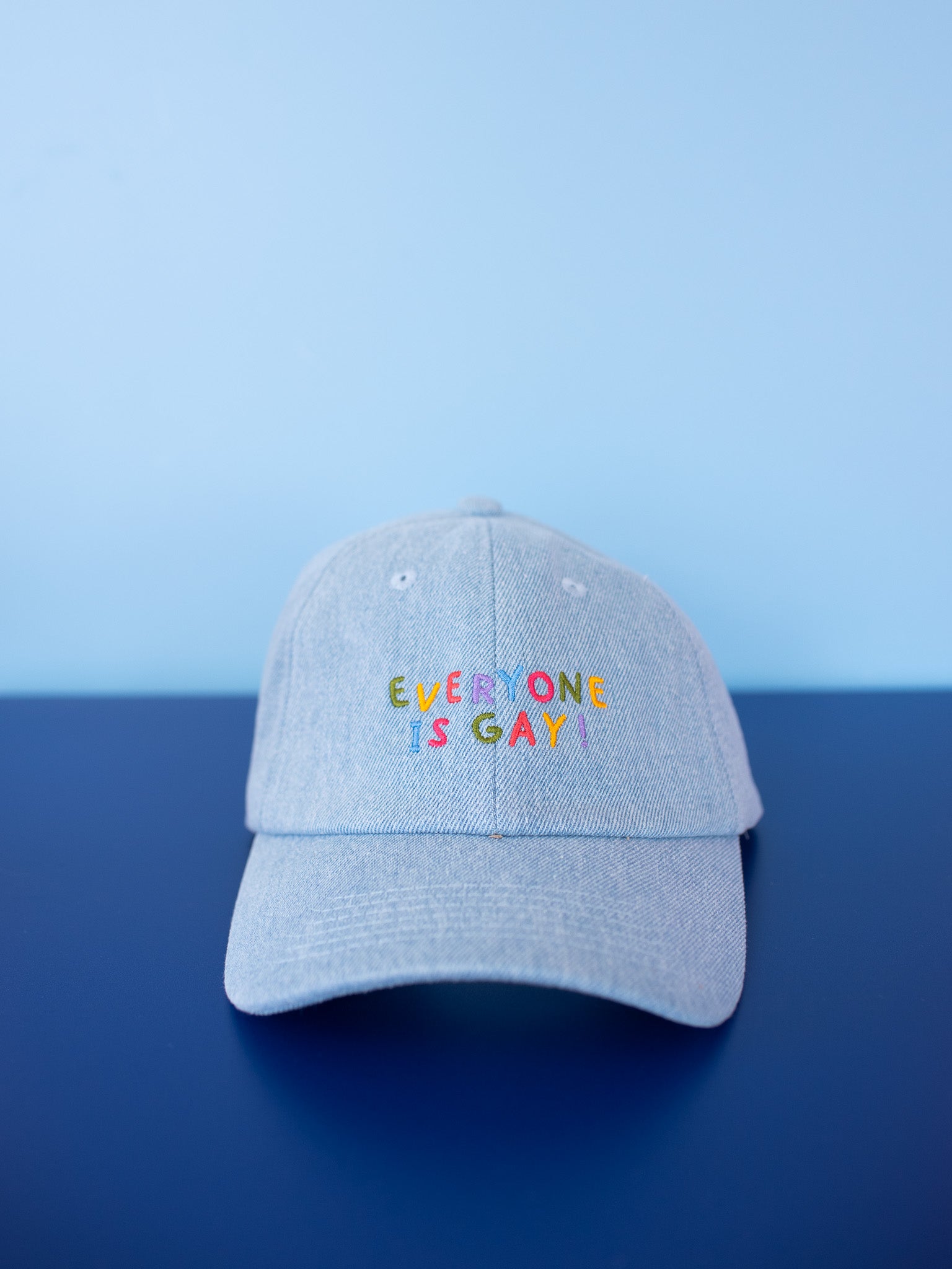 This hat is here to help you have the gayest summer to date! This light wash denim dad hat reads "everyone is gay" in colorful embroidery across the front. Looks perf with any outfit and is adjustable - we love!!