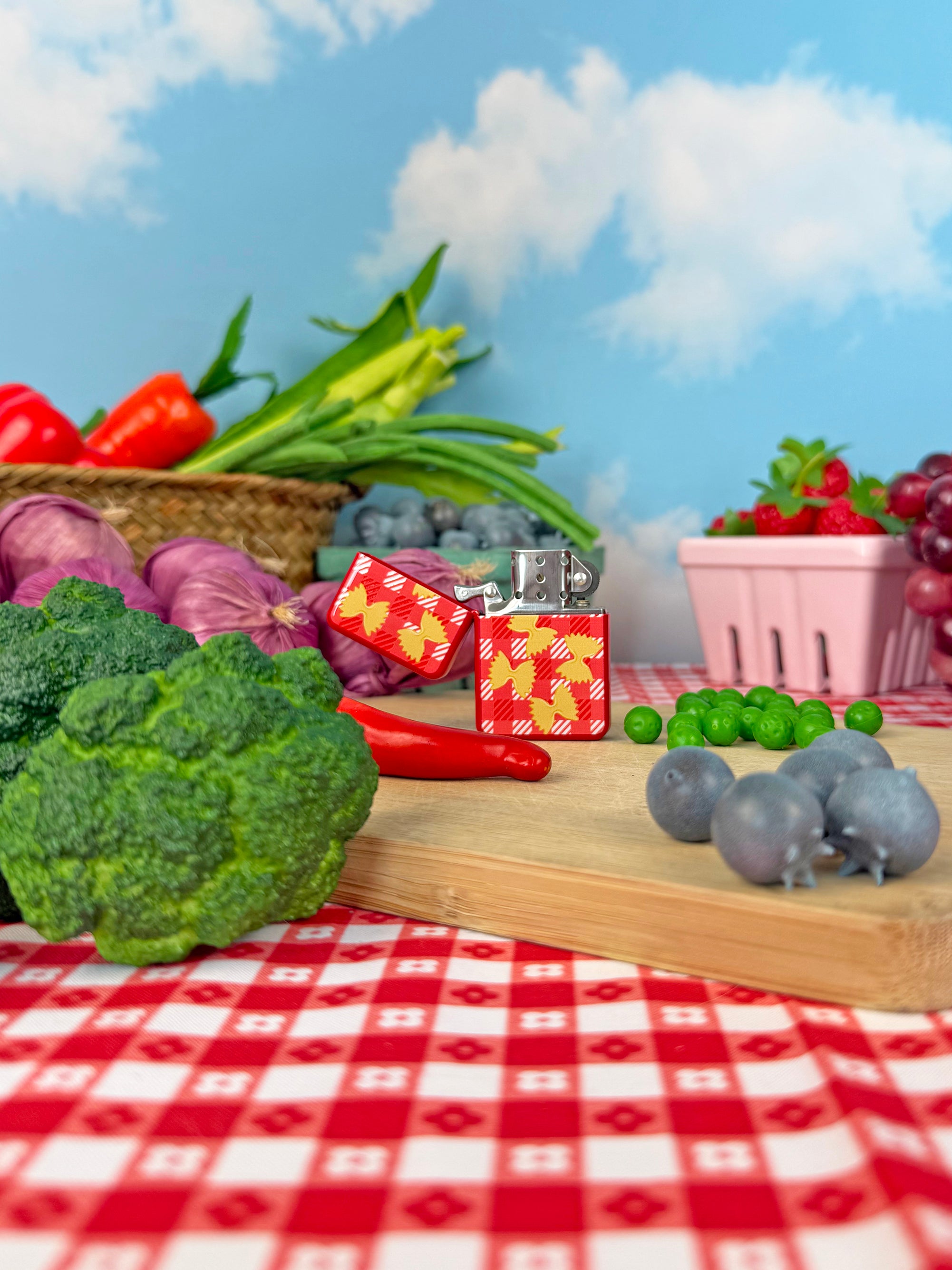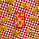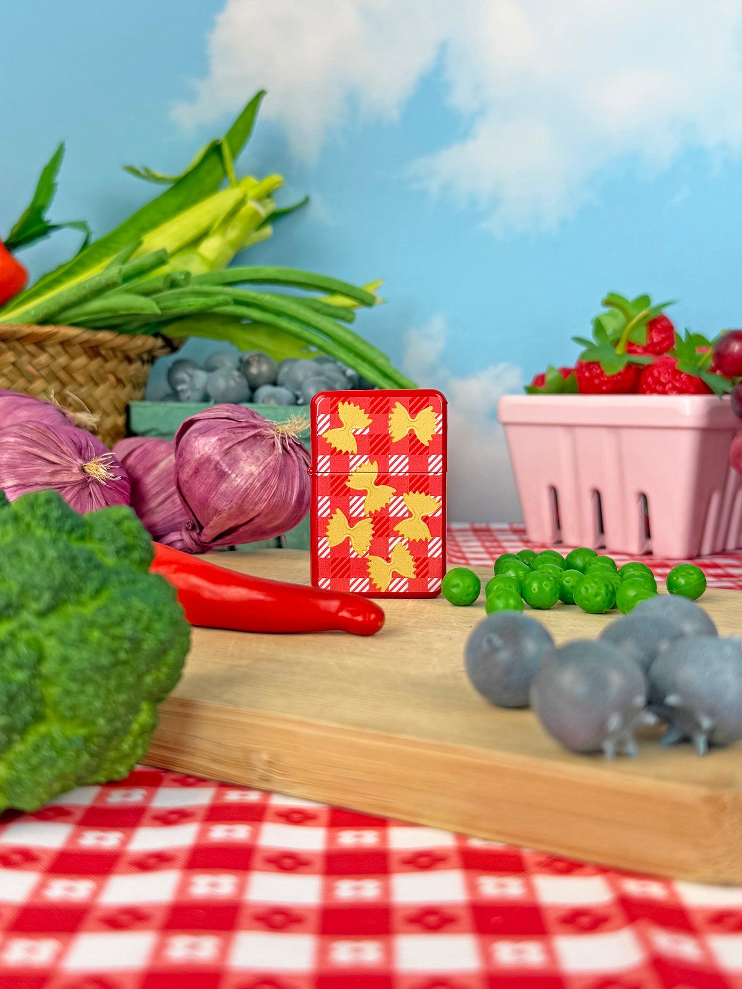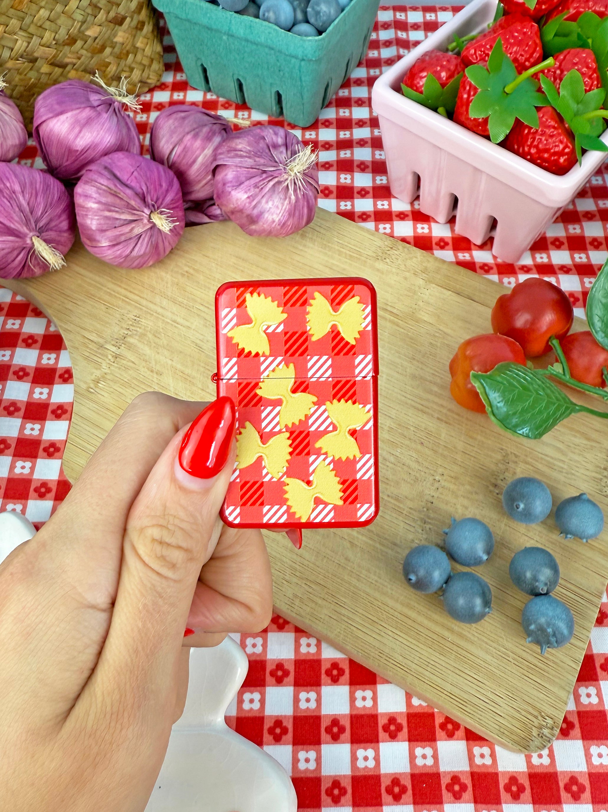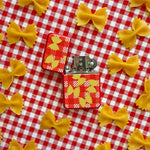 This red gingham lighter features an all over farfalle noodle print! The kitschy lighter of our dreams. Perfect for lighting cigarettes, candles, or whatever else you need a fire for!