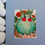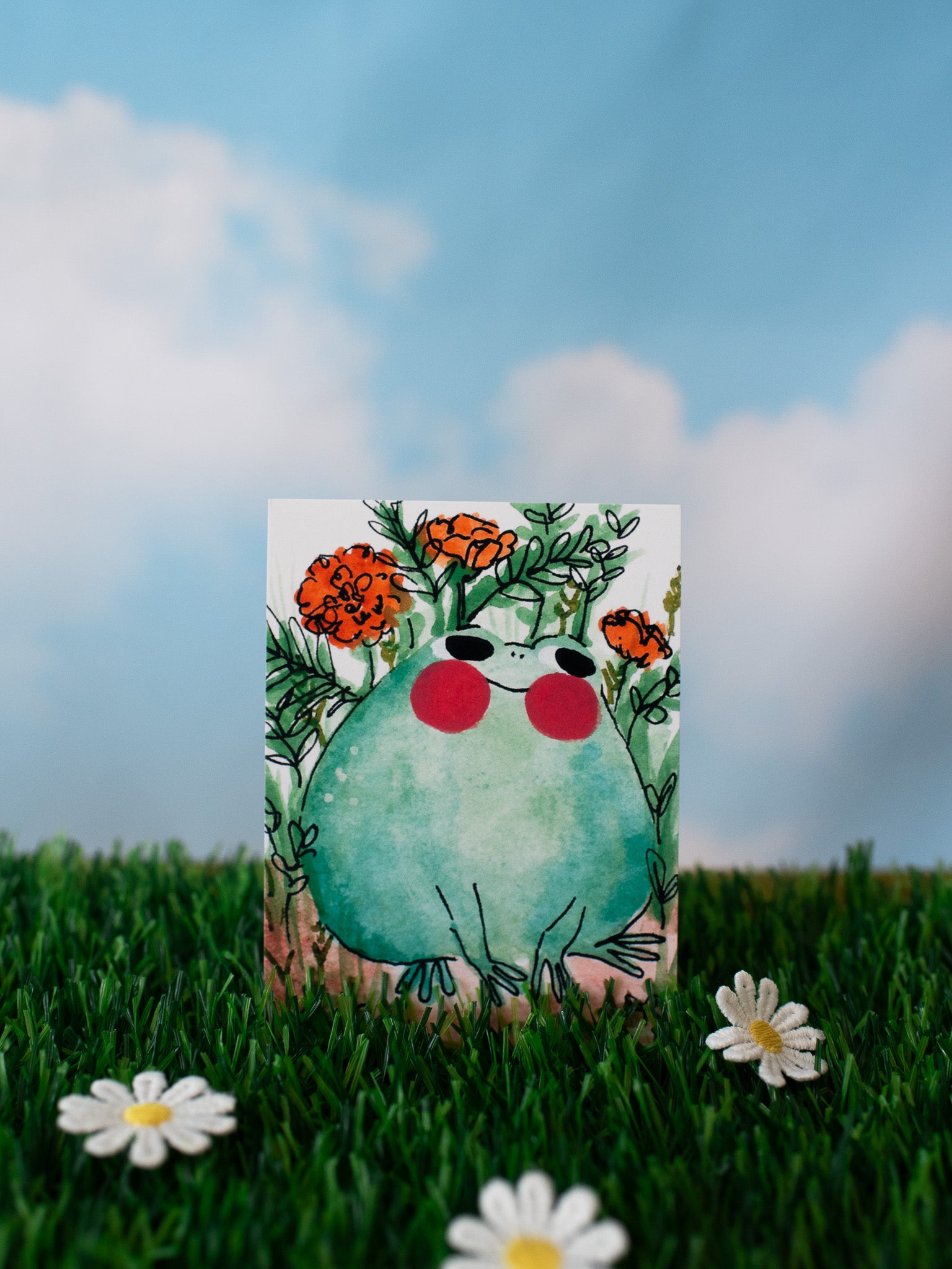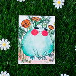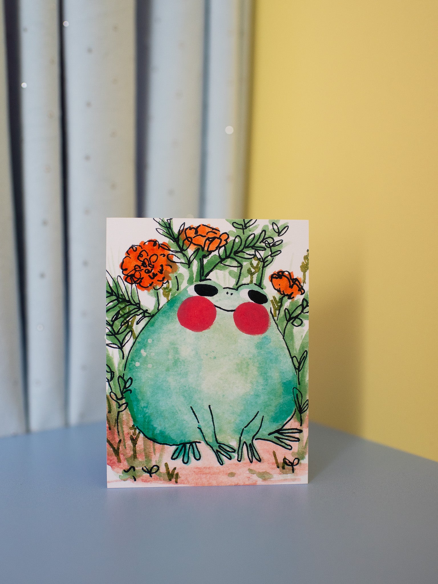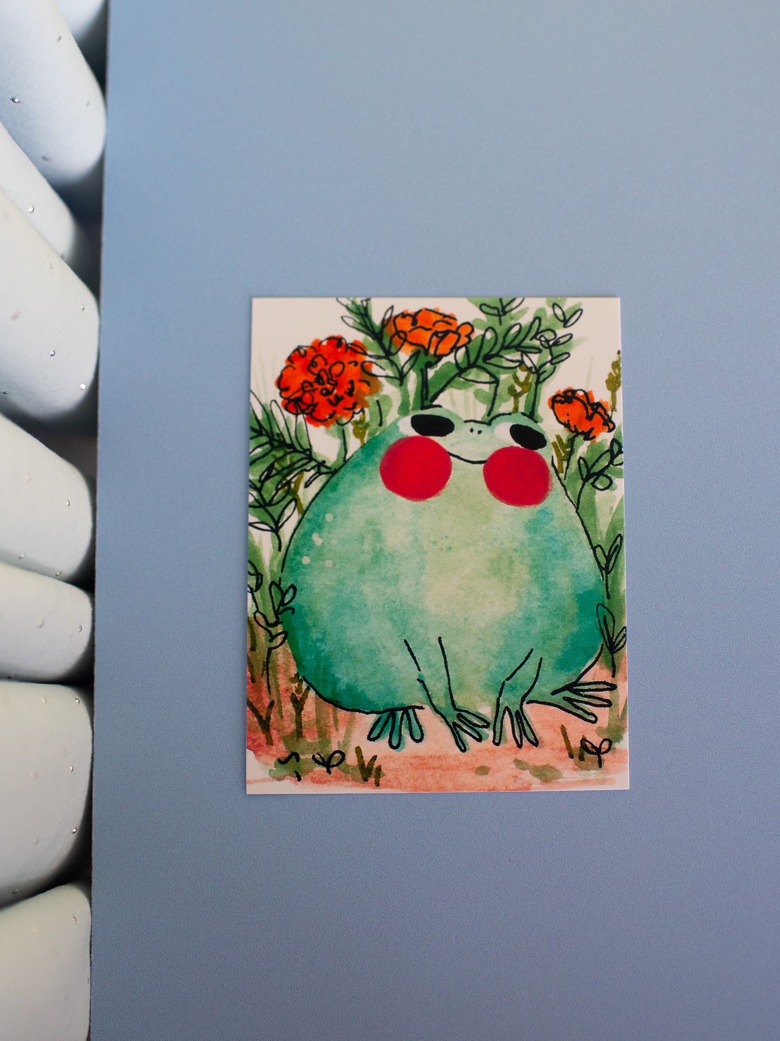 This print features a cute blushing frog surrounded by blooming marigolds! Made by artist Rebekah Evans, this watercolor print looks adorable on a shelf and makes for the sweetest gift!