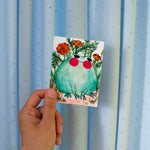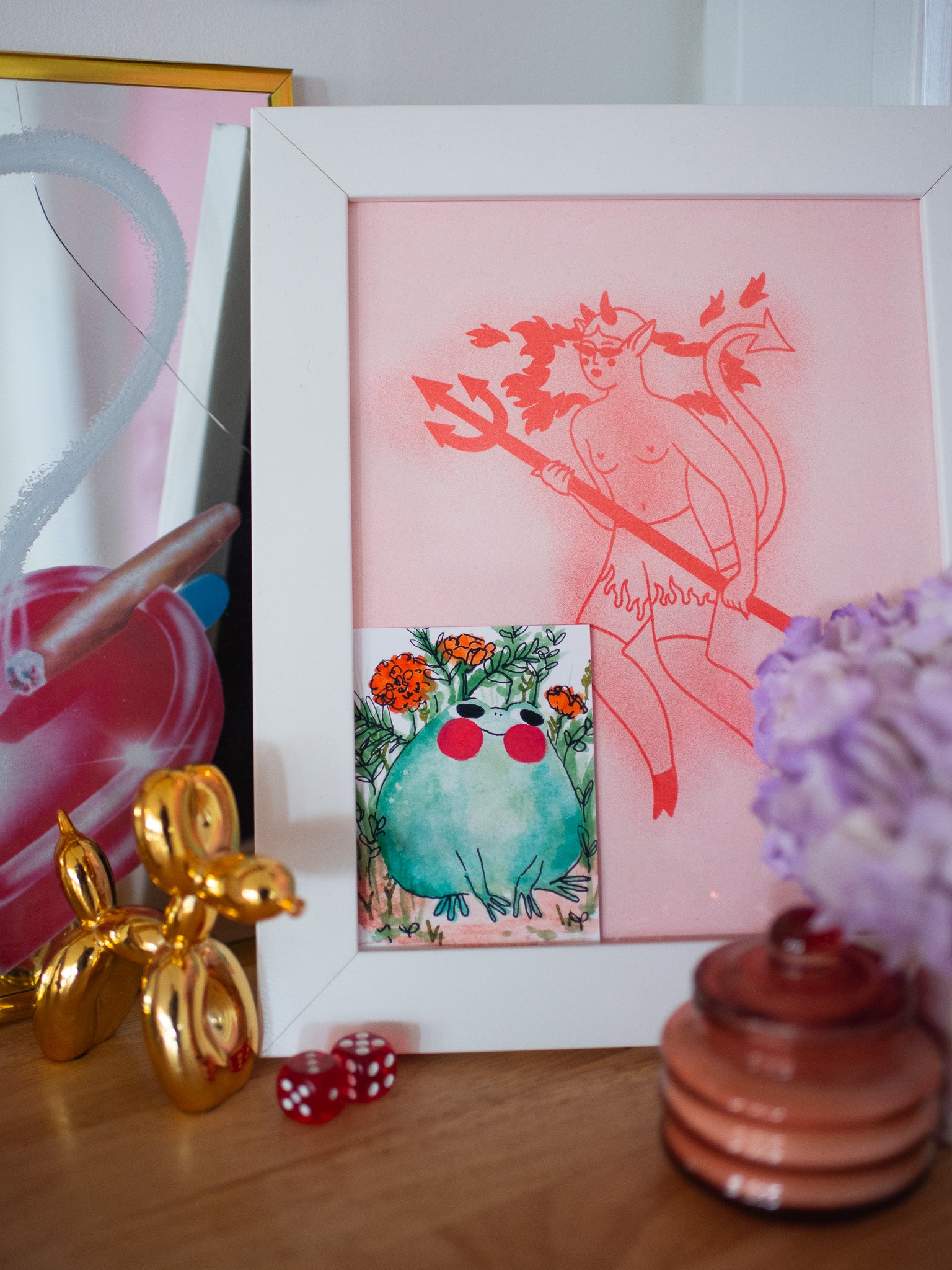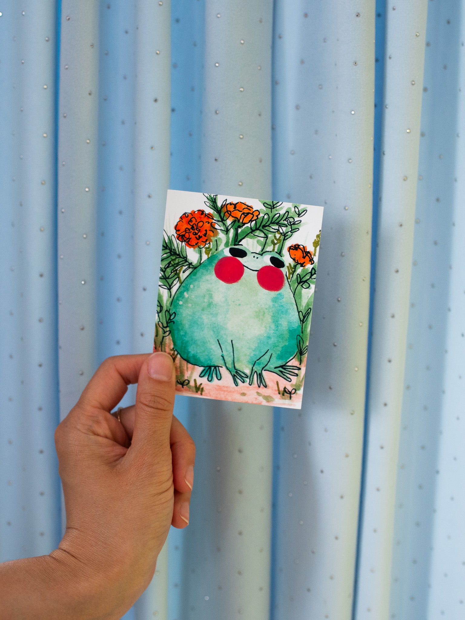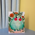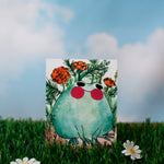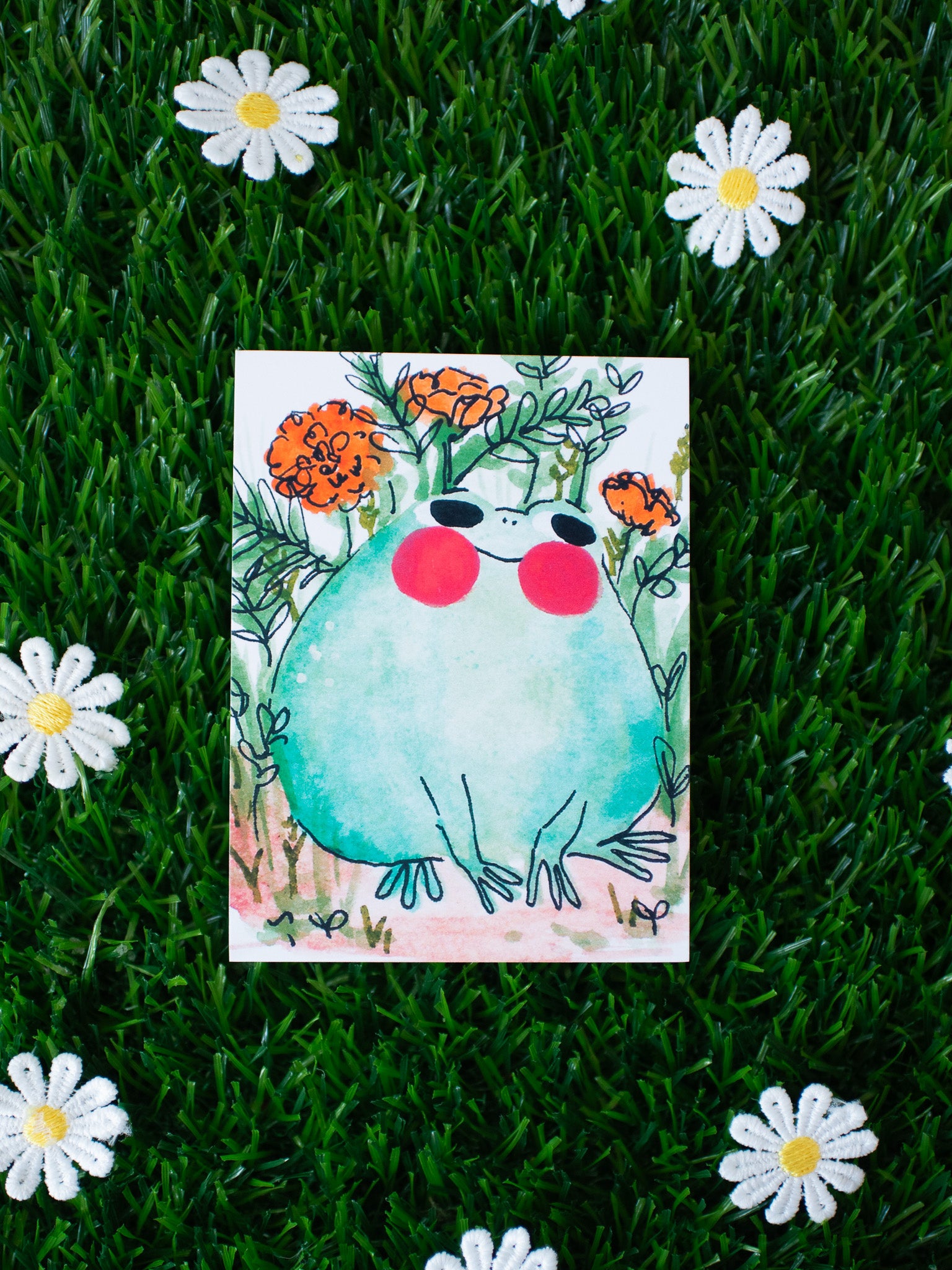 This print features a cute blushing frog surrounded by blooming marigolds! Made by artist Rebekah Evans, this watercolor print looks adorable on a shelf and makes for the sweetest gift!