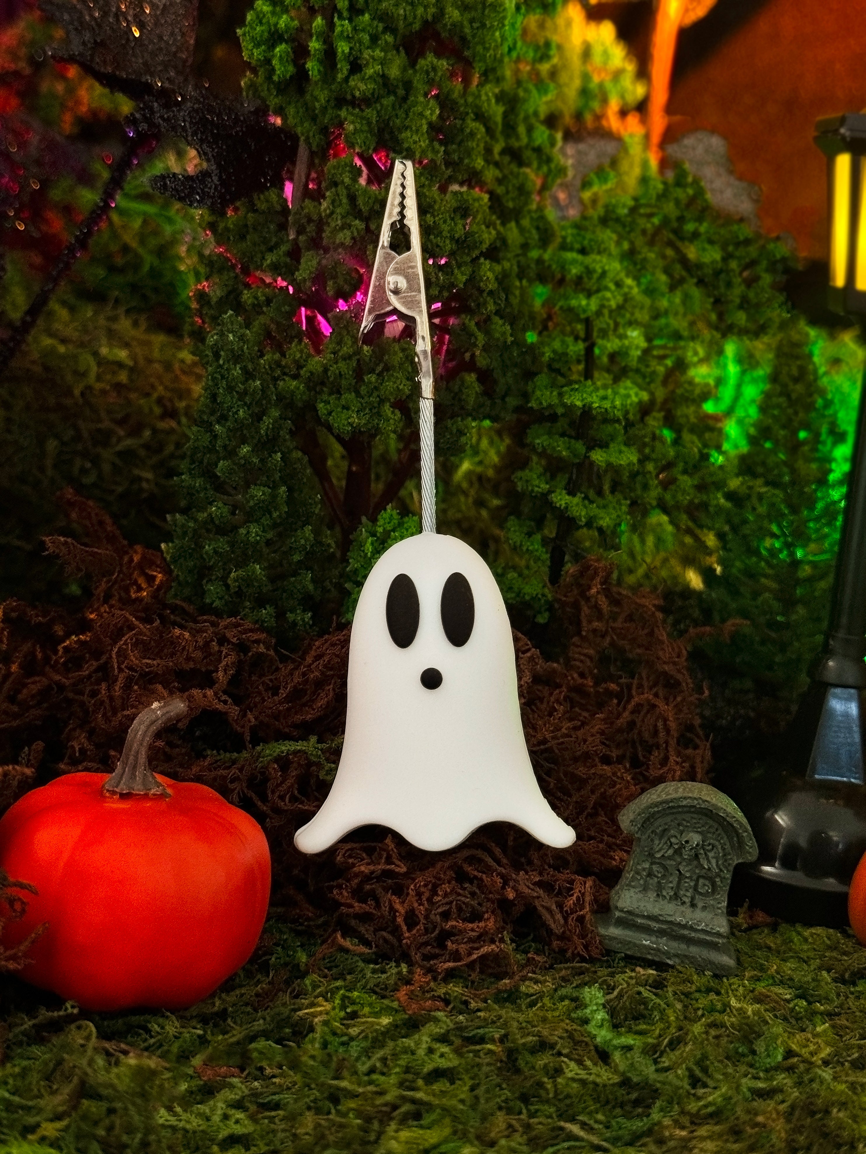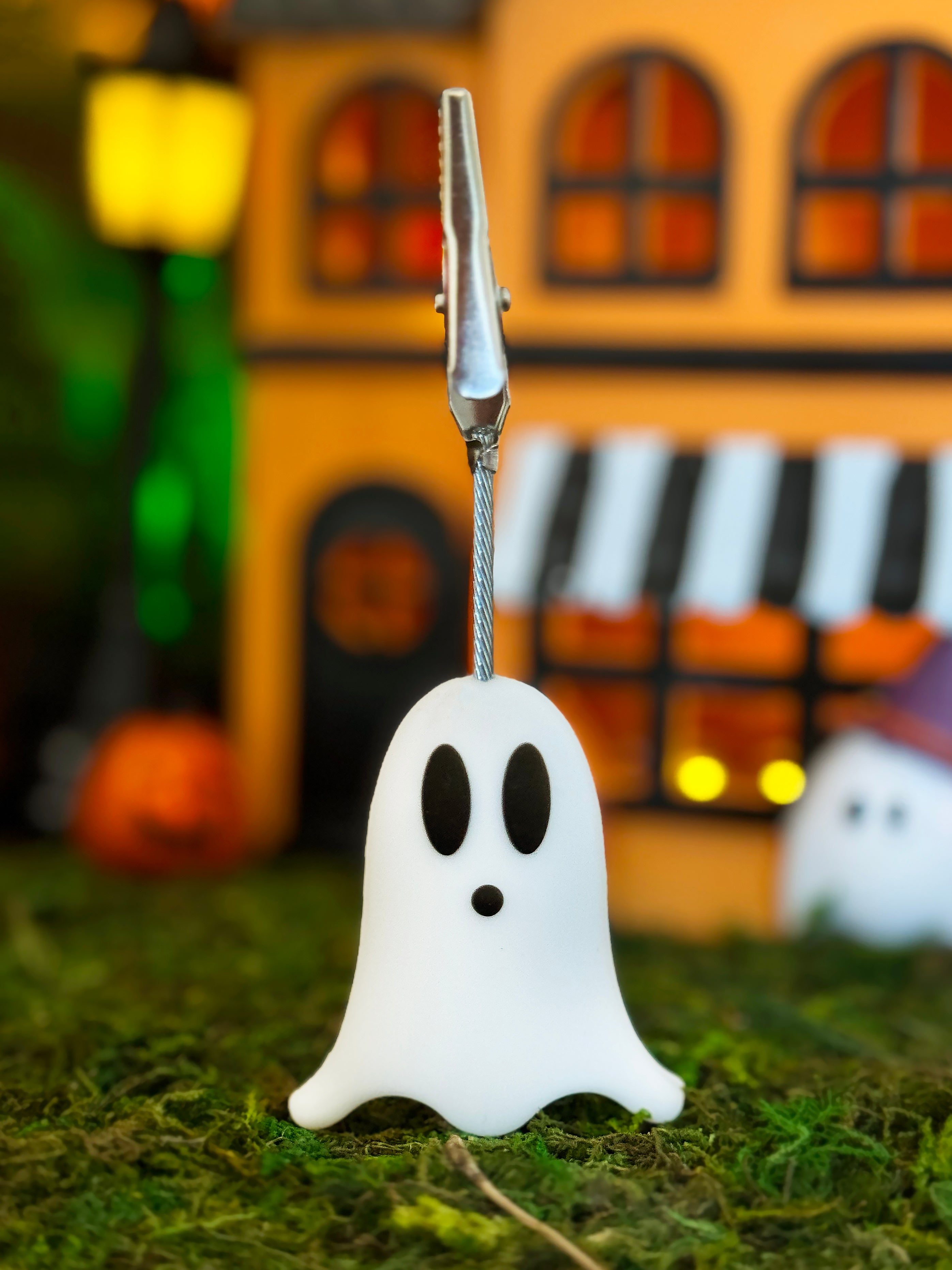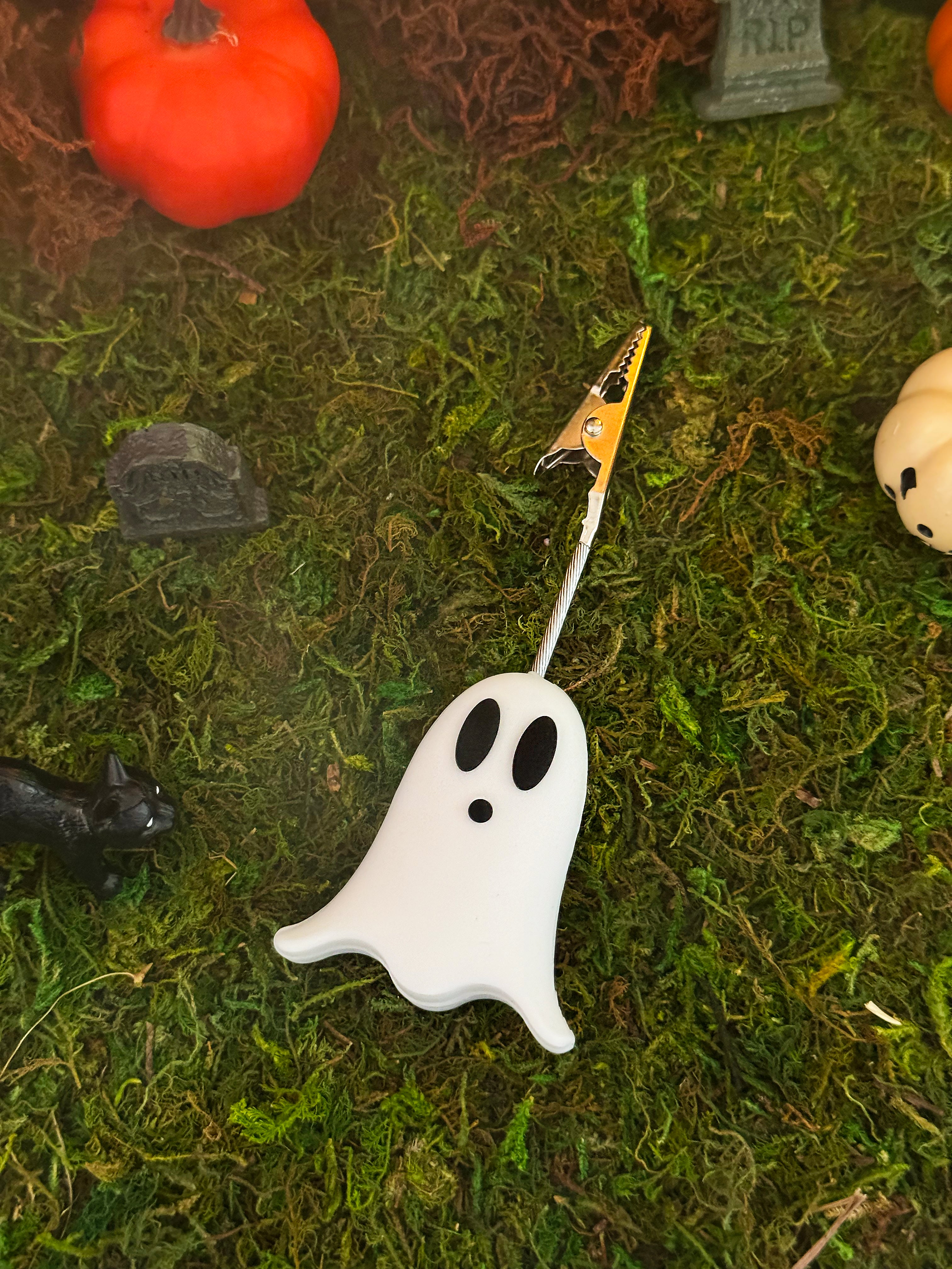 Joint stays clipped between the silver claws on the top of the clip. An adorable silicone ghost is the base for these clips. Measures 4" tall