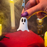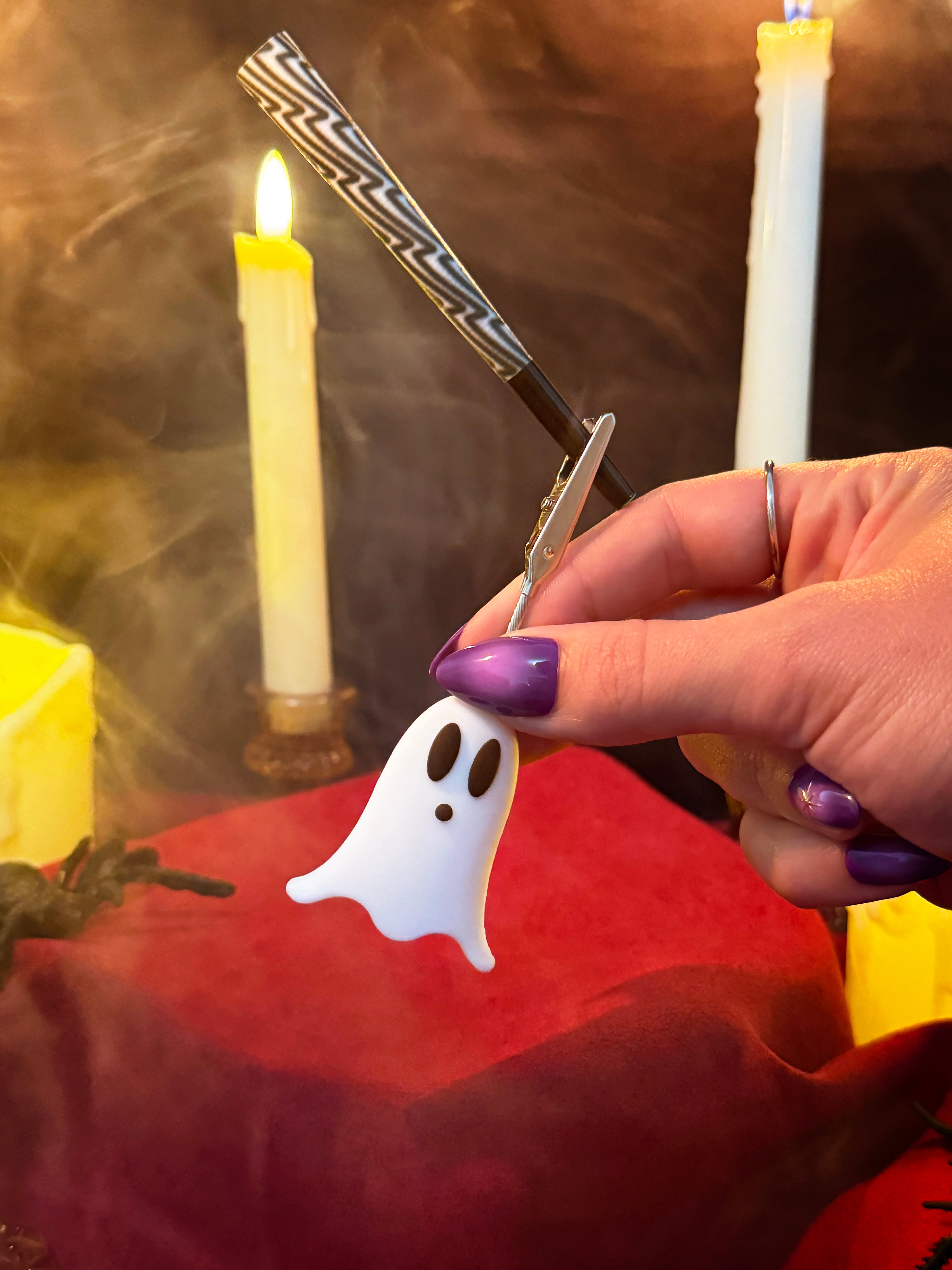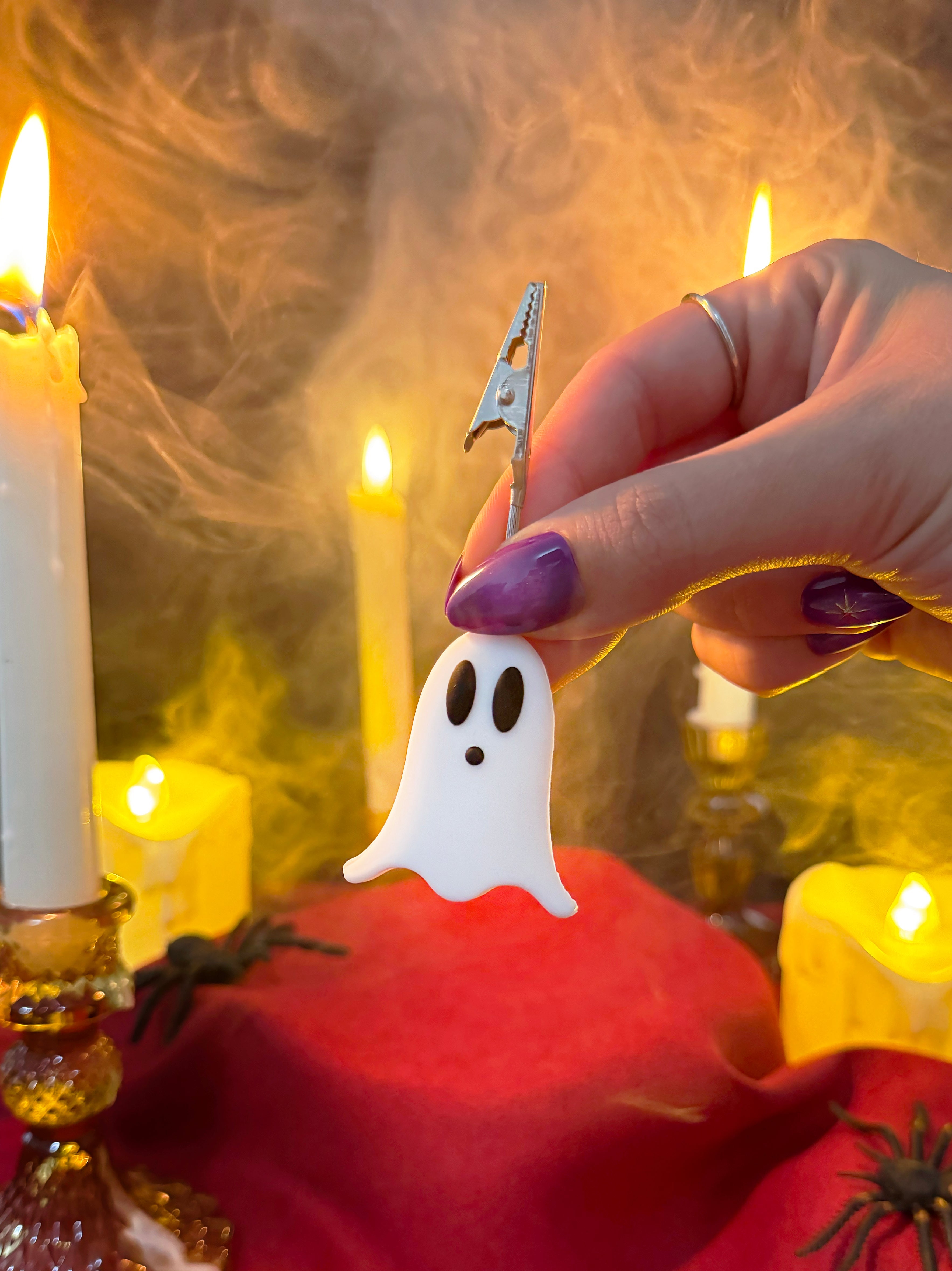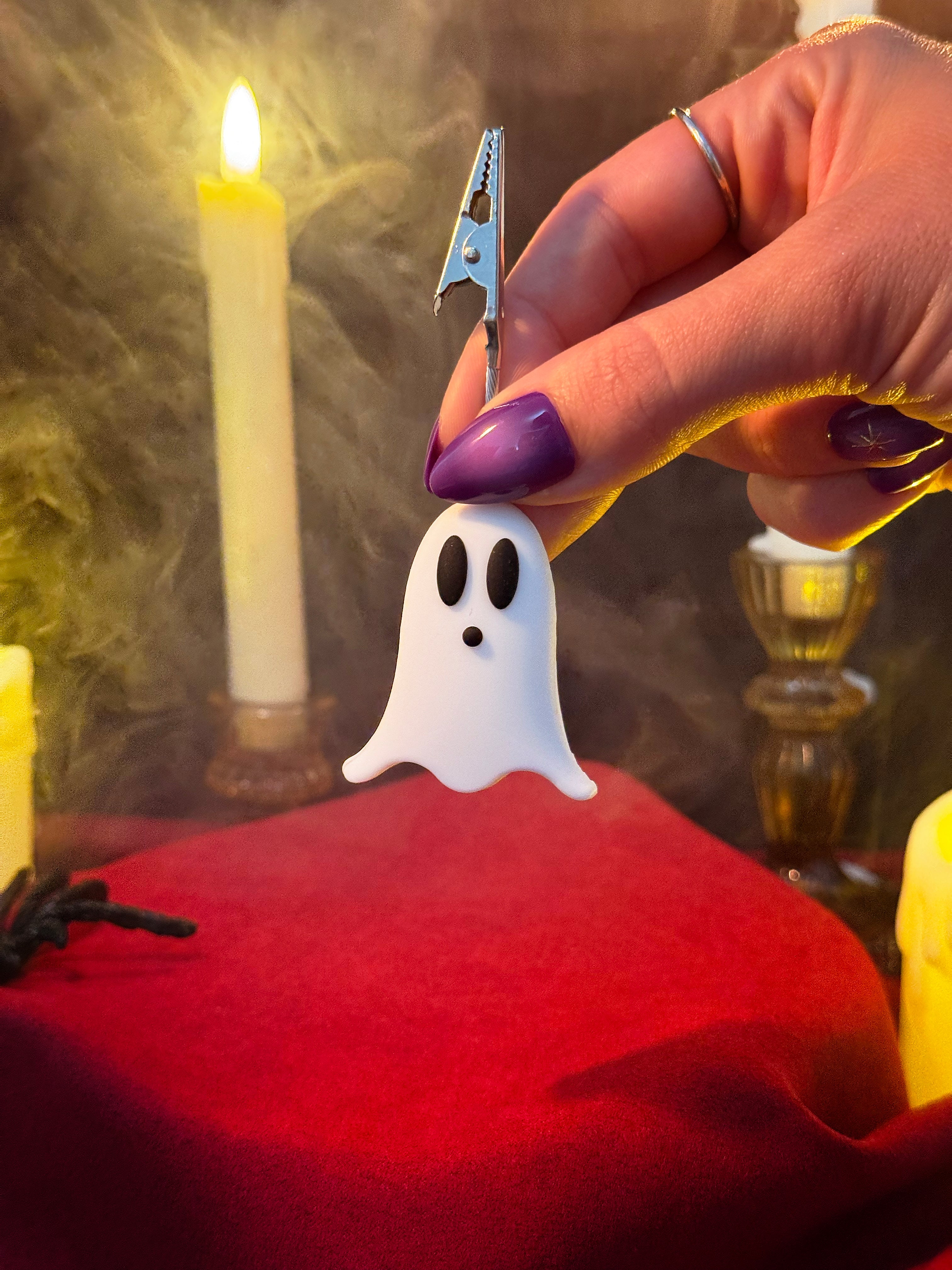 Joint stays clipped between the silver claws on the top of the clip. An adorable silicone ghost is the base for these clips. Measures 4" tall