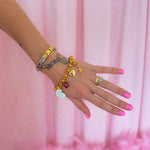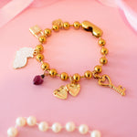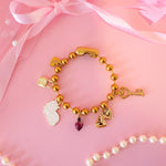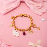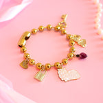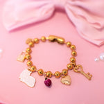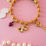 This charm bracelet is made from a gold plated oversized ball chain and has a gold heart, lock, cat, rosebud, heart locket, and key charm attached. The locket actually opens!