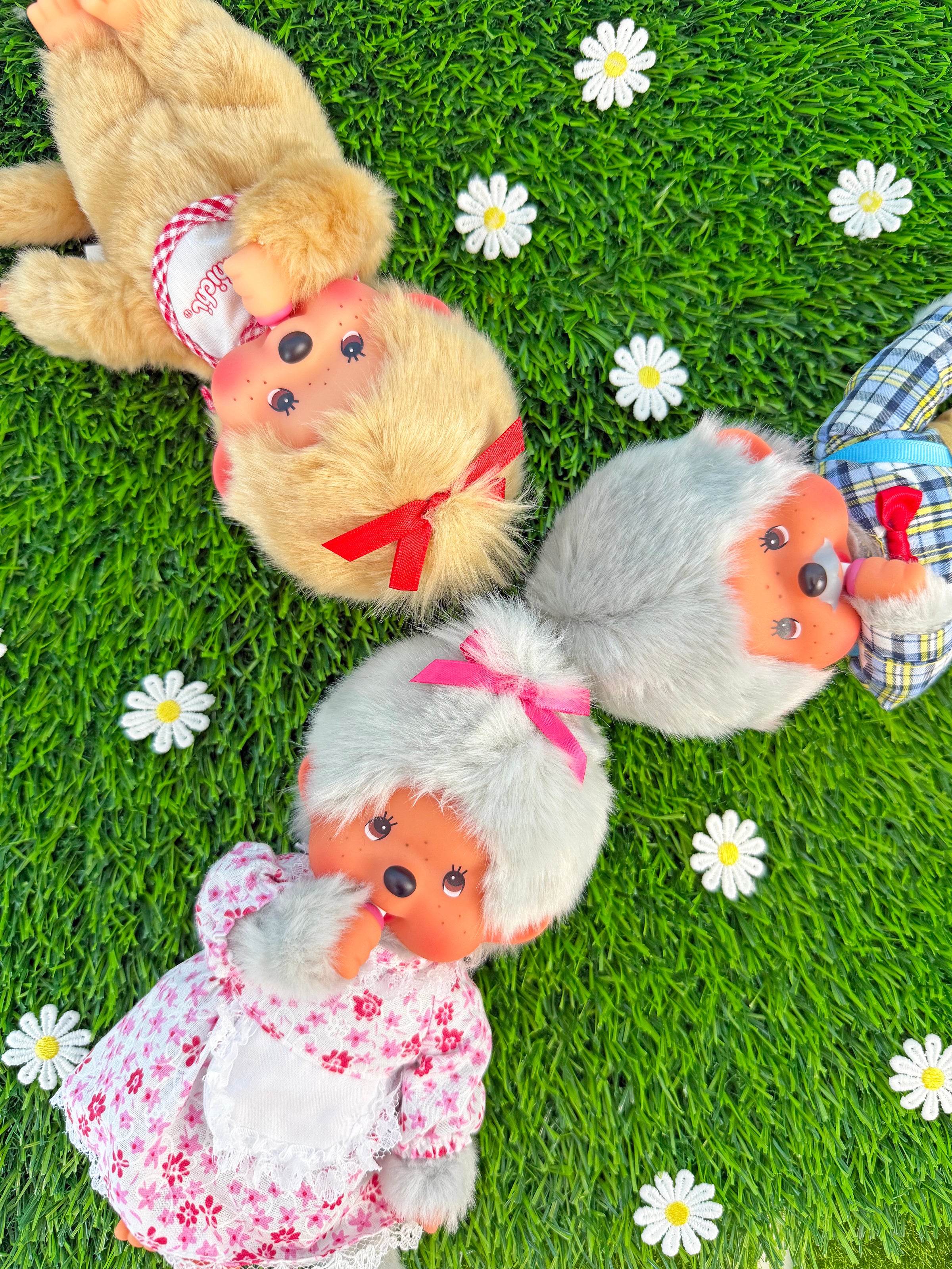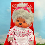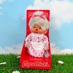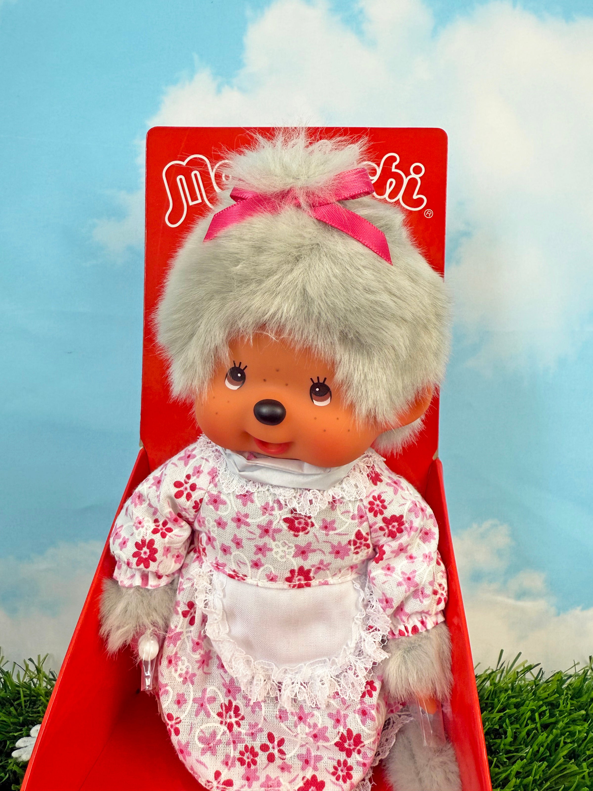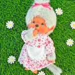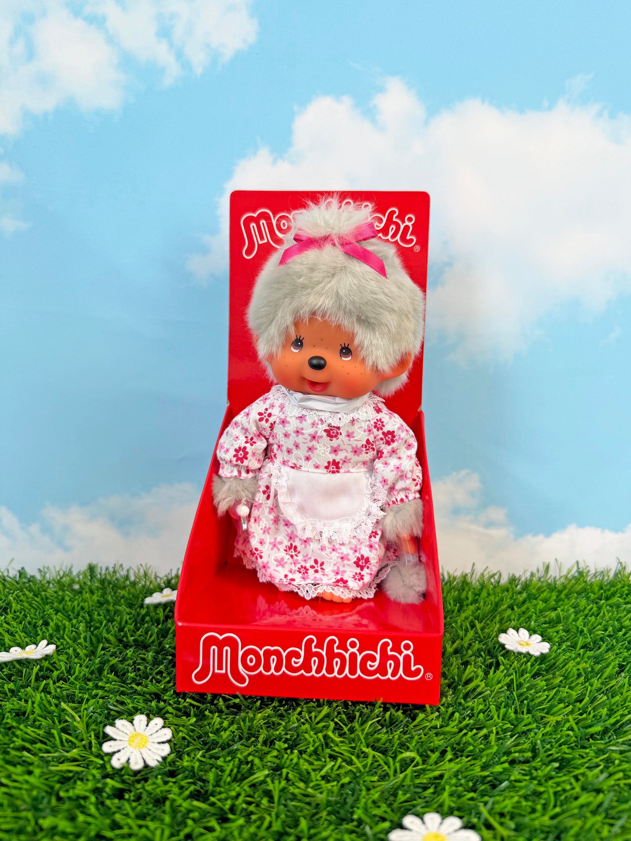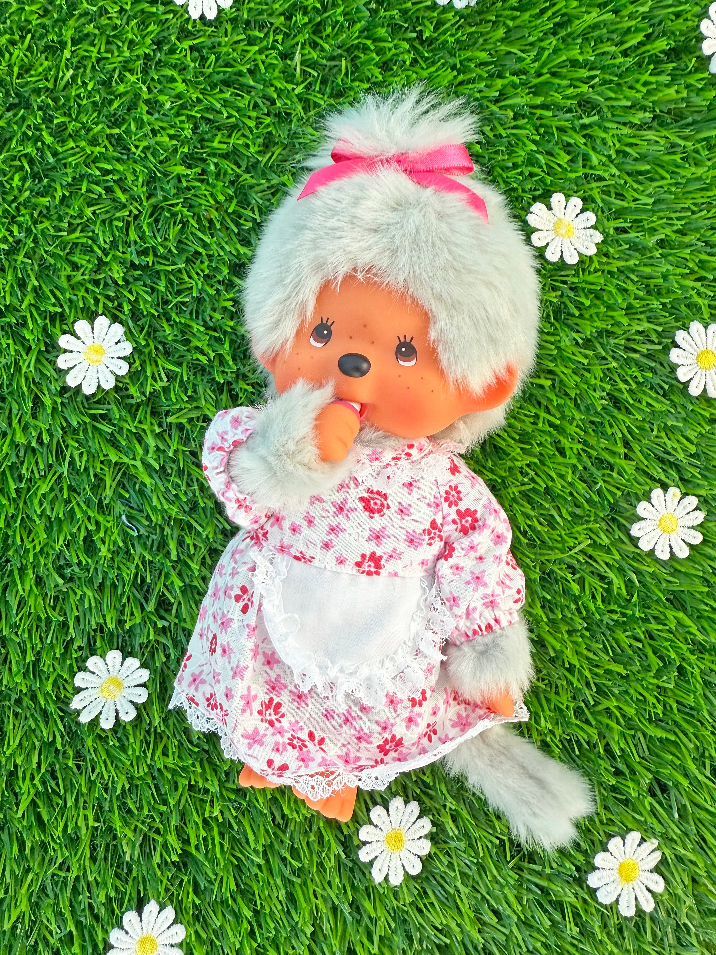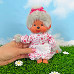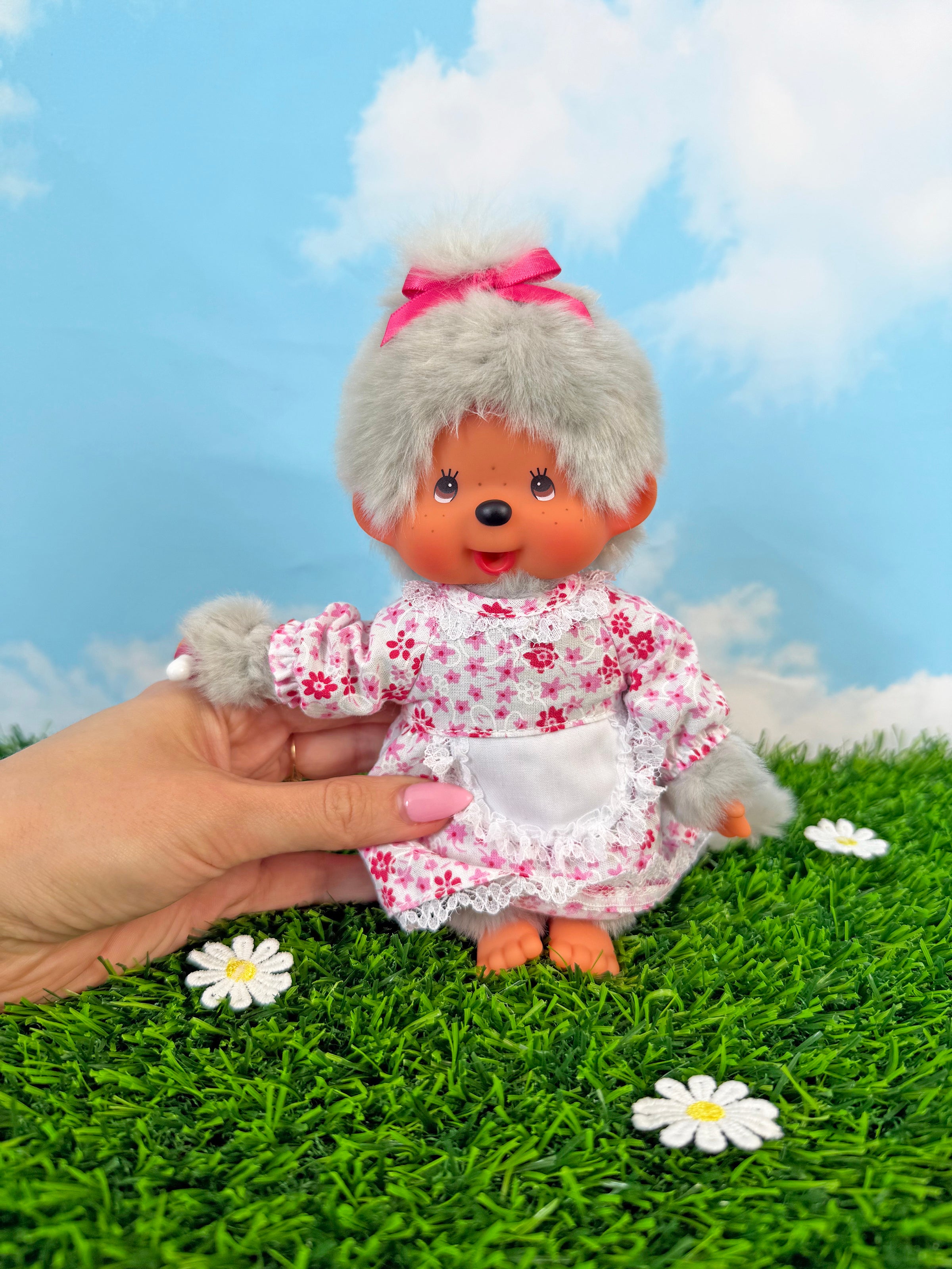 This sweet grandma Monchhichi has the cutest grey fur and is wearing an adorable pink floral dress, with a white apron and lace details! Perfect for gifting, adding to your growing collection, or just to add some fun vibes to your space!