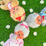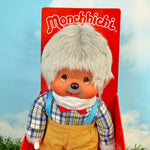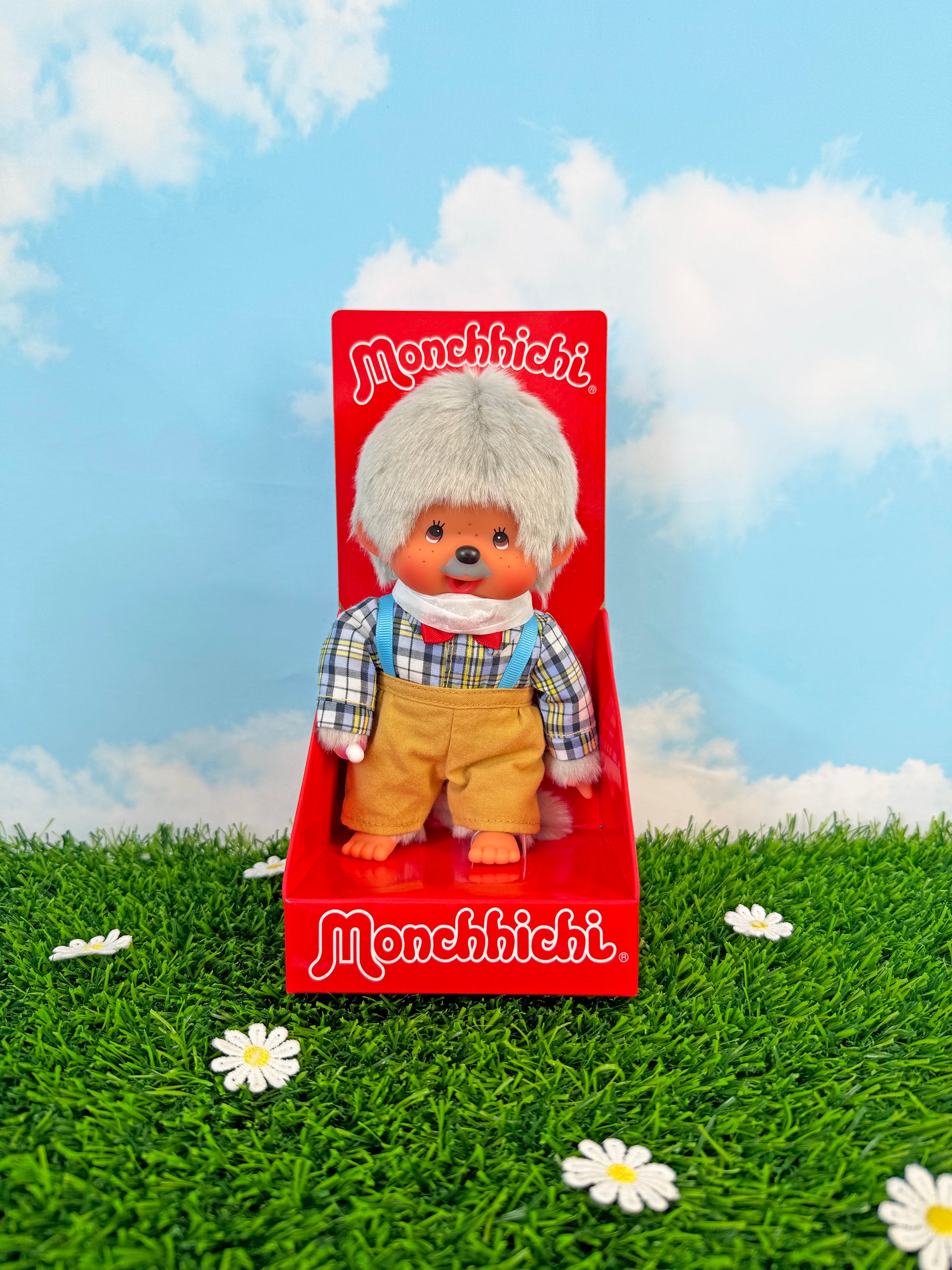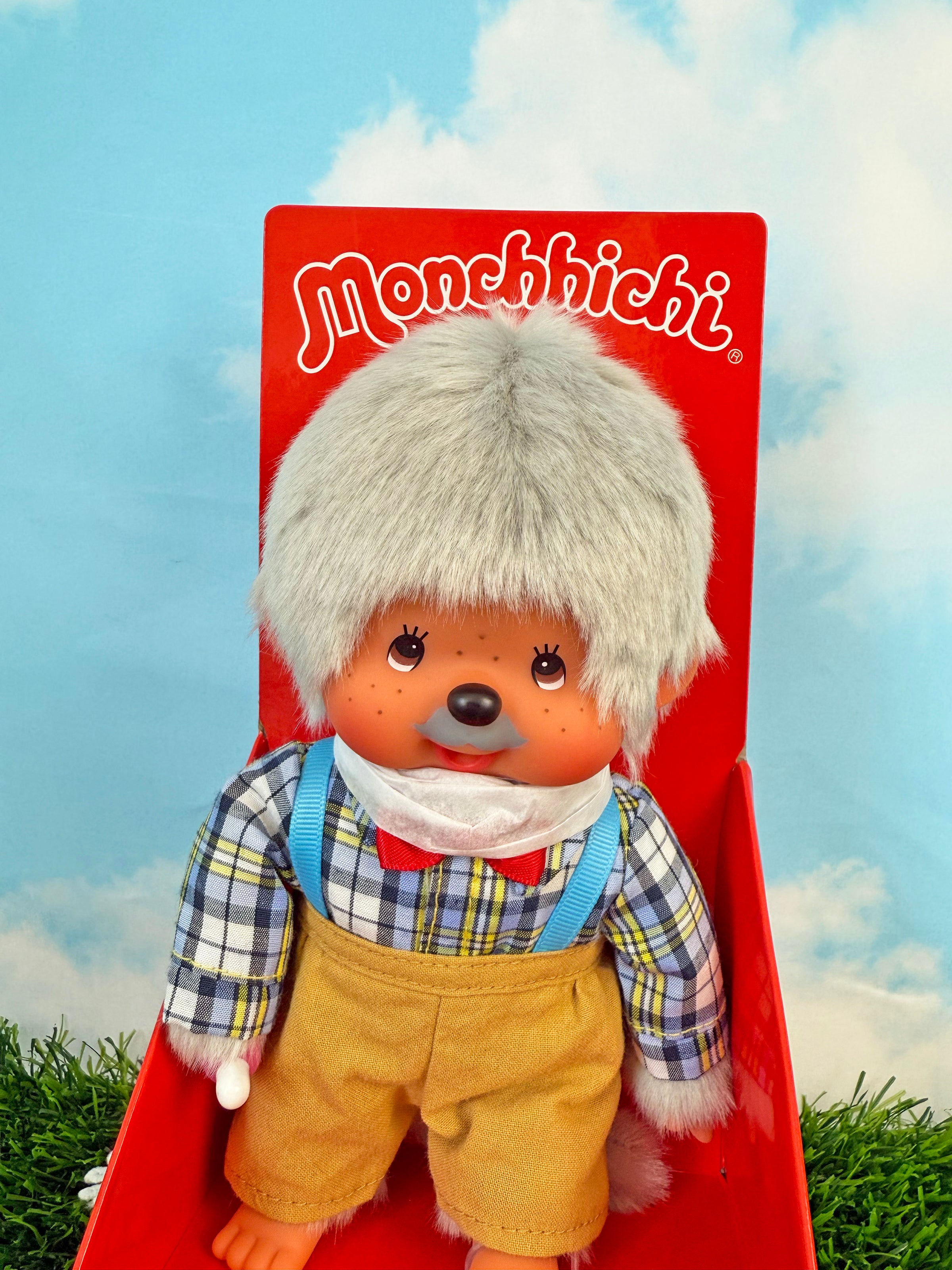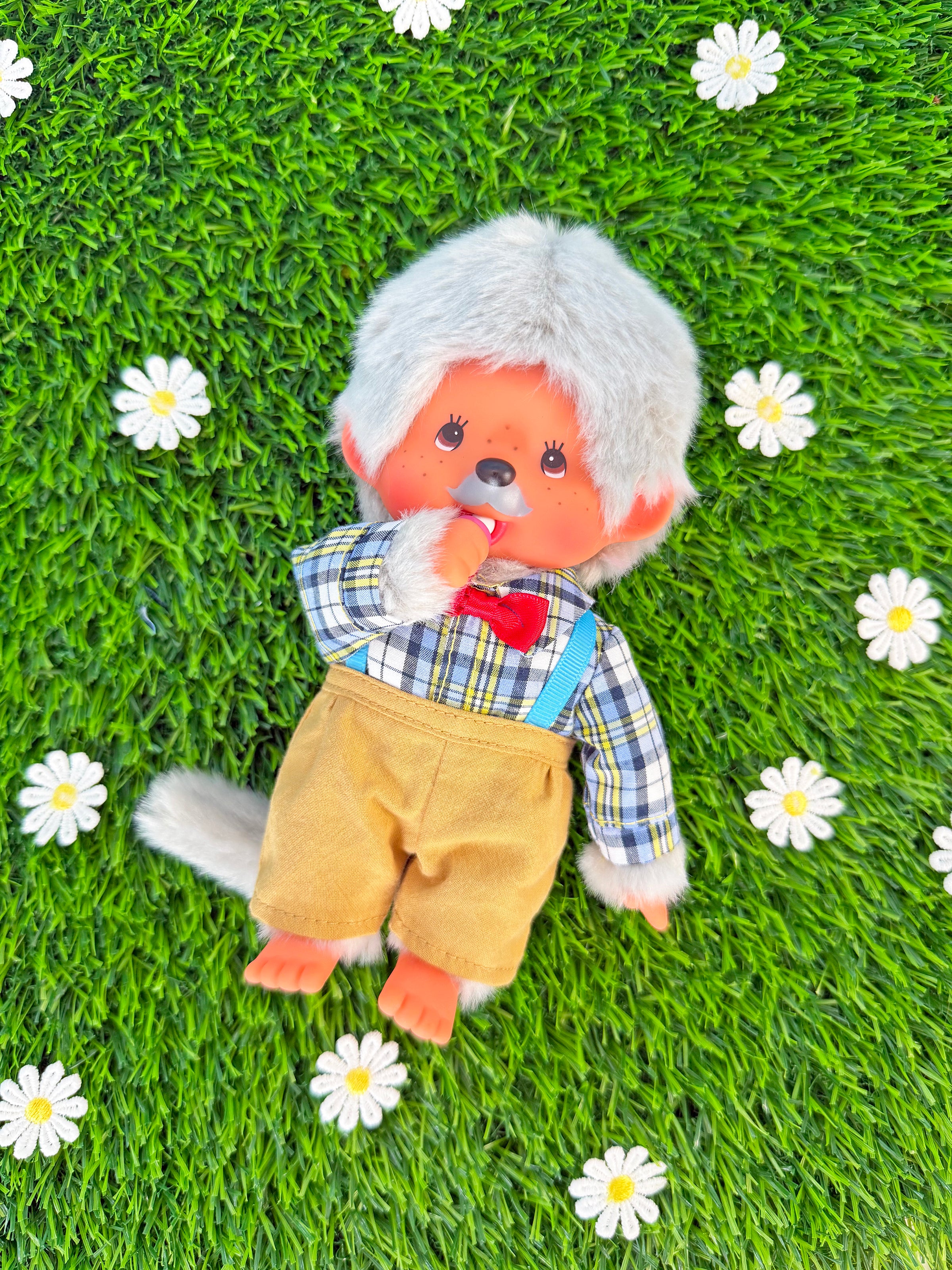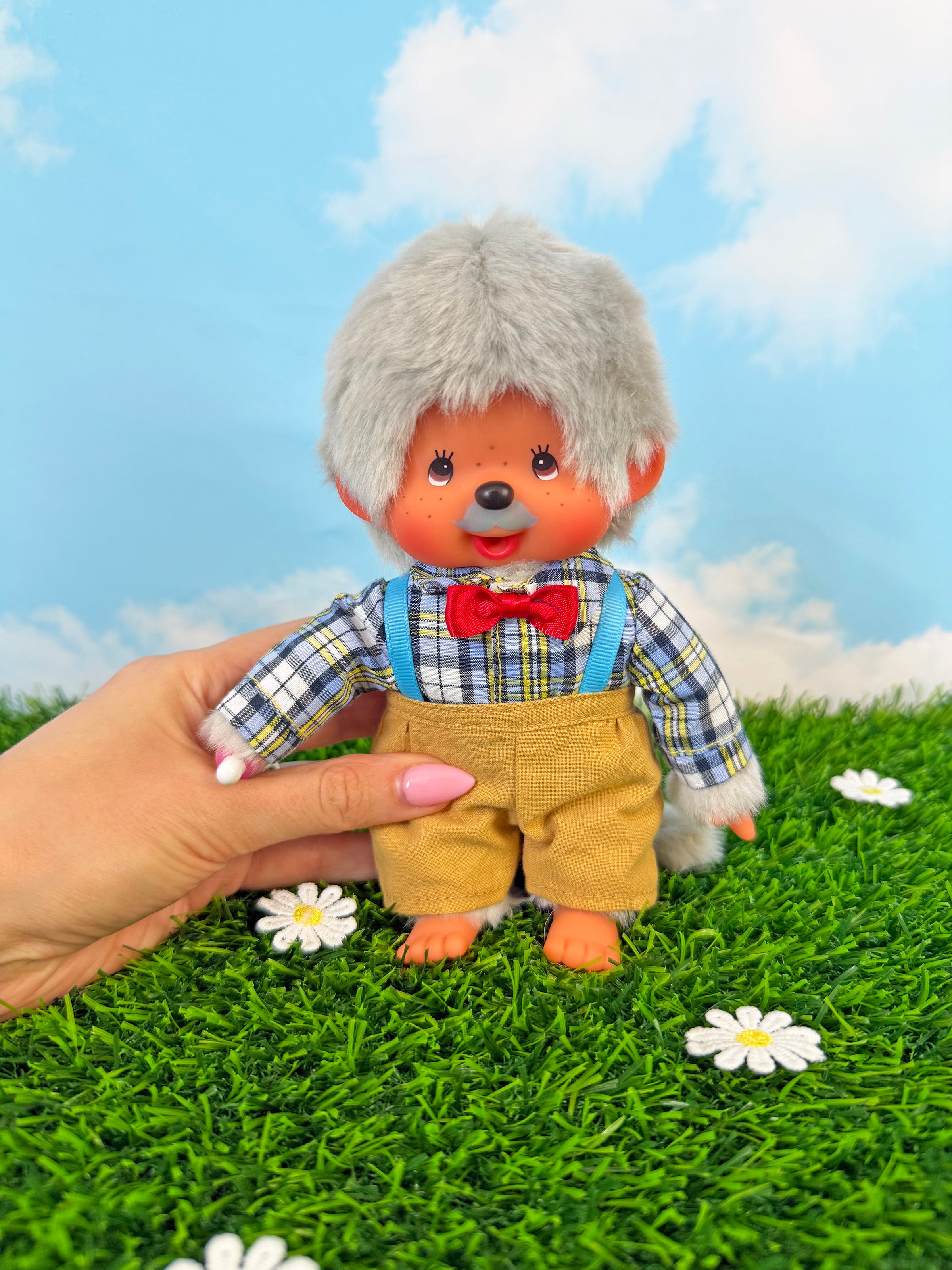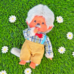 This sweet grandpa Monchhichi has the cutest grey fur and mustache! He's wearing a plaid button down with khaki pants, accessorized perfectly with a red bow tie and blue suspenders! Perfect for gifting, adding to your growing collection, or just to add some fun vibes to your space!