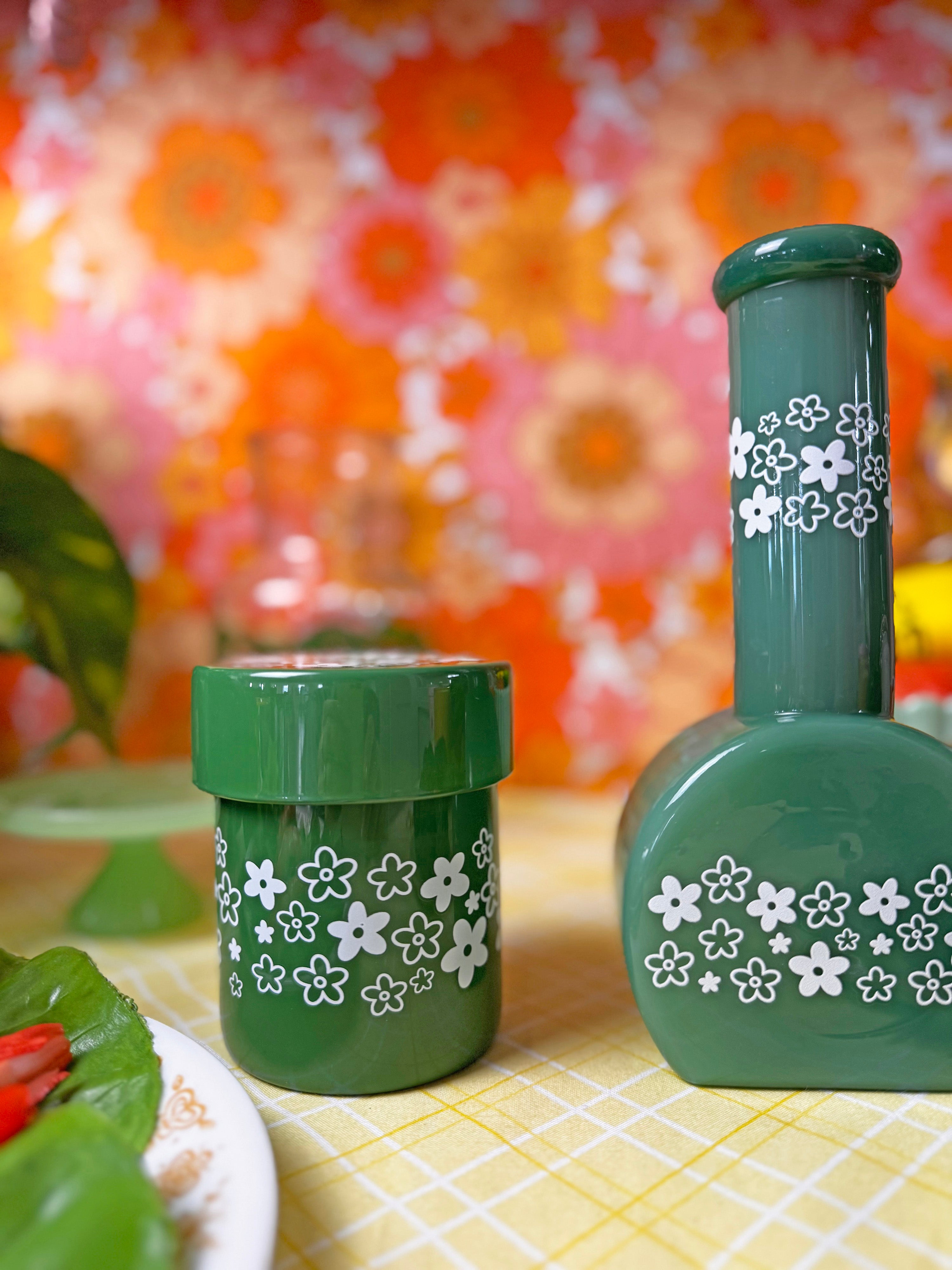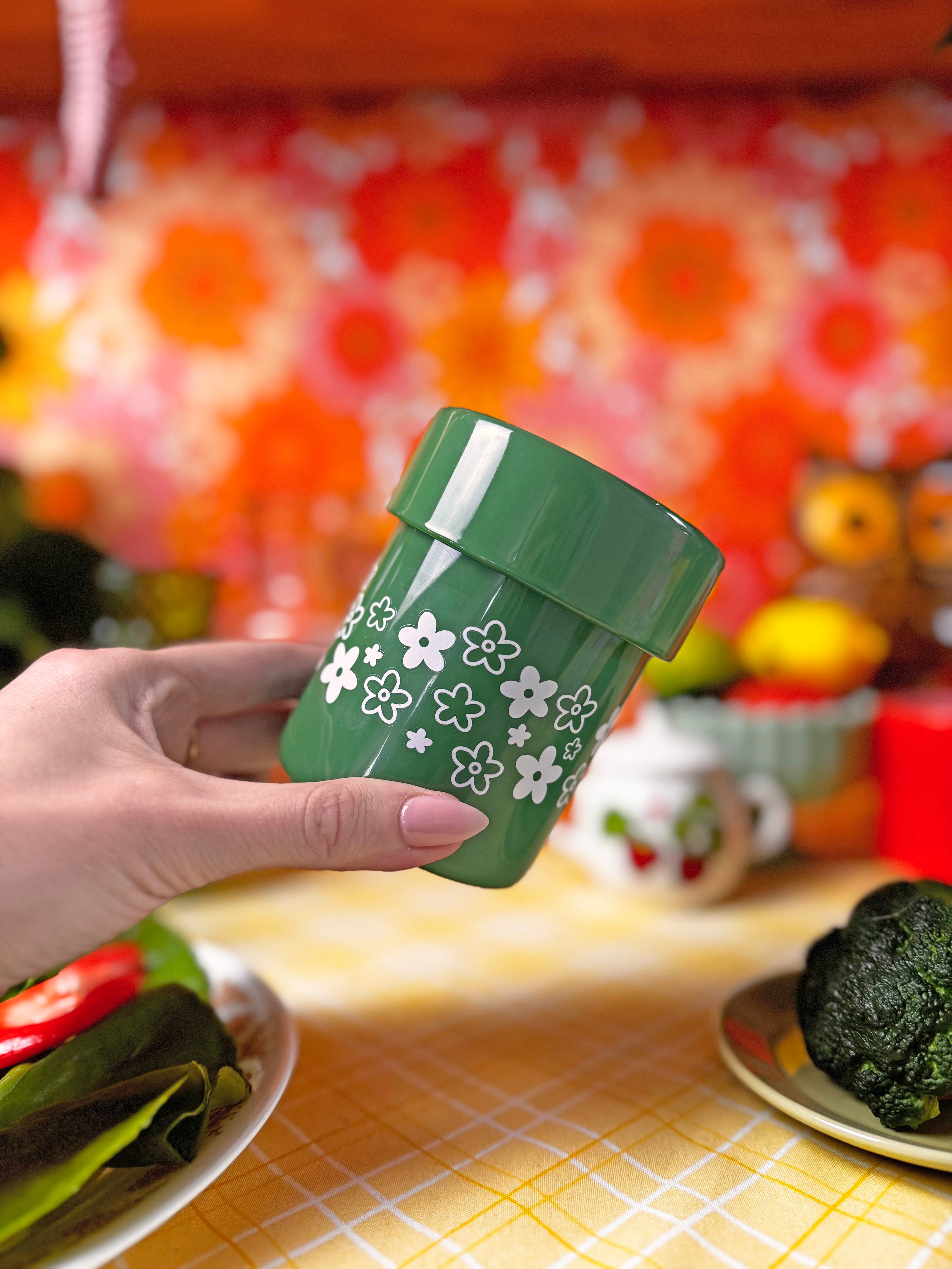 Looking for the perfect place to stash your goods? The timeless design of this stash jar is too cute to pass up. Made from jade green glass with our vintage blossom print and a glass top with rubber seal that keeps your stash fresh!