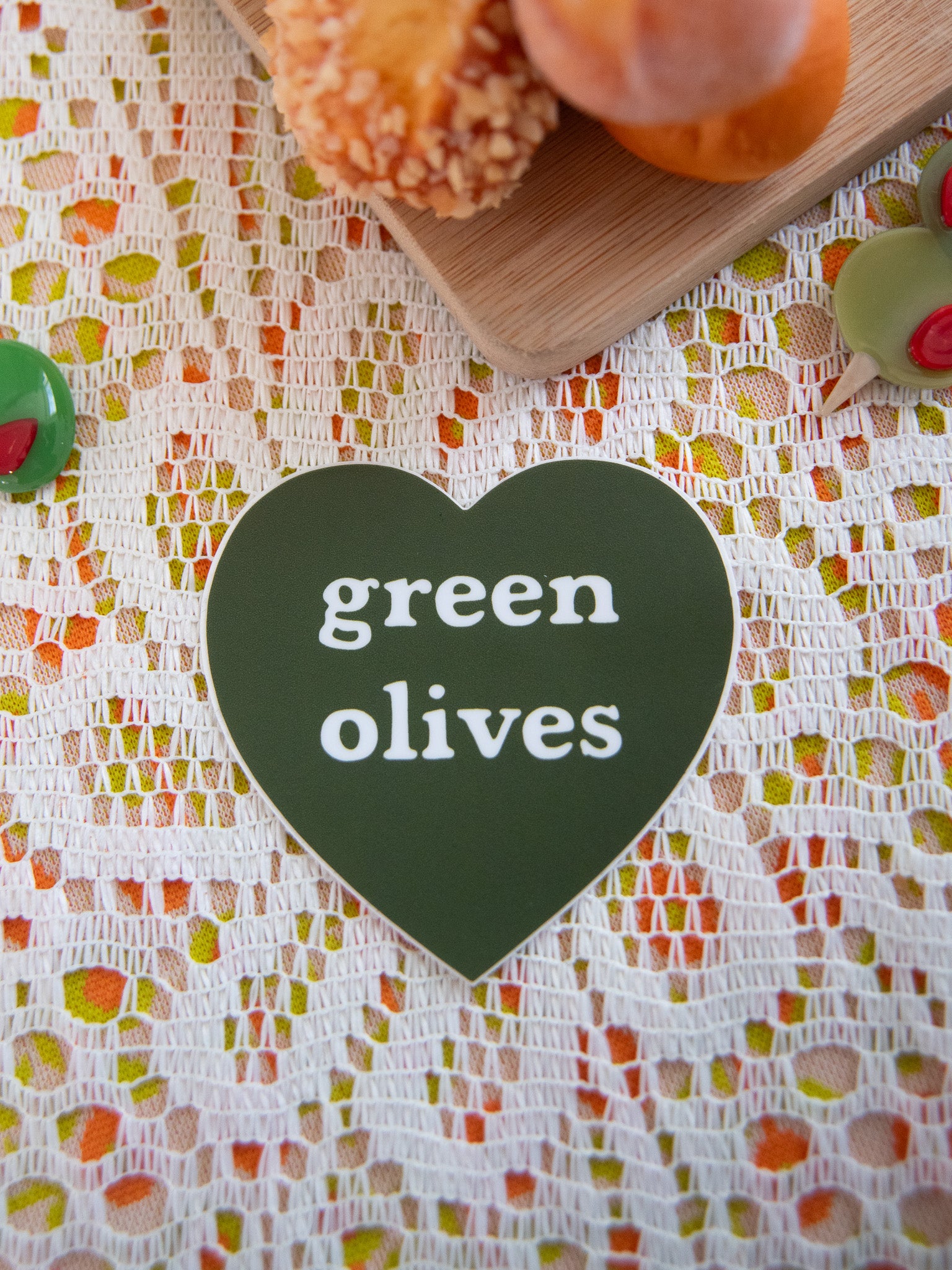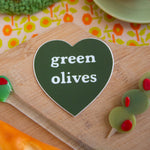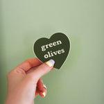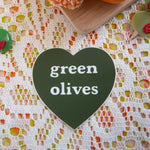 The perfect sticker for the foodie in your life! The cutest olive green heart that reads "green olives" in the center.