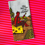 This high quality dish towel is super absorbent and made with 100% cotton material! The towel folds out to reveal a scenic image of a devil luring you in with some very tempting cheese and reads "Hey, have you tried cheese?". We love this dish towel almost as much as we love cheese!!Β