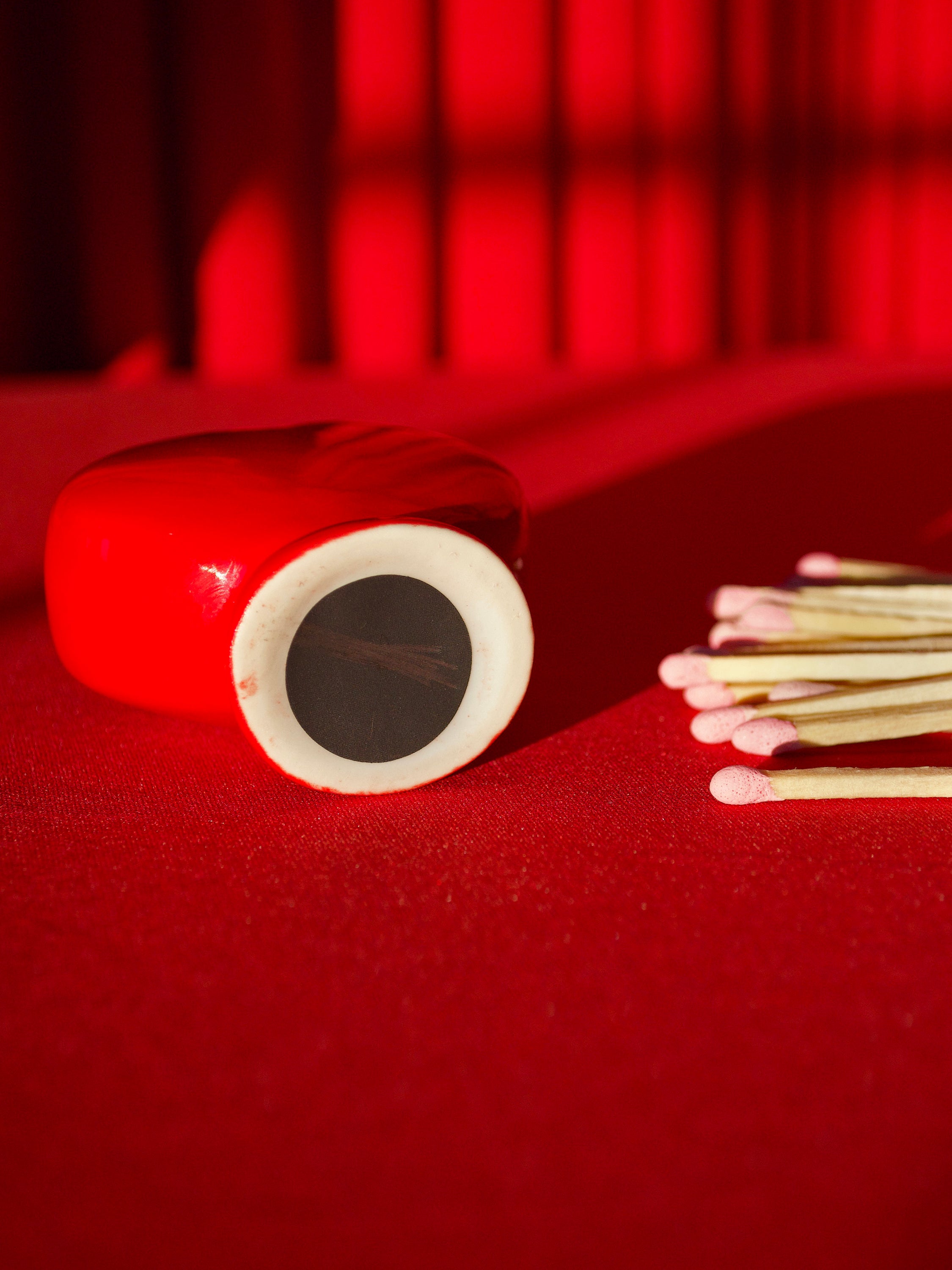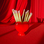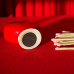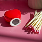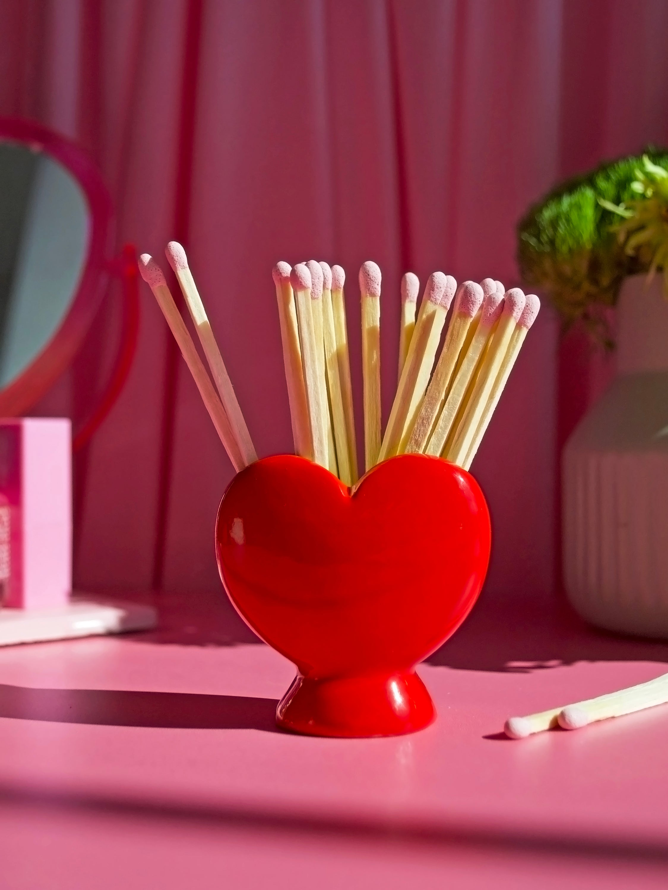 This striker is shaped like the cutest little heart you've ever seen! Comes with 25 matches measuring 3.75" each, stored conveniently inside the heart! When you need a light, tilt it over and strike a match on the base! Looks great on a desk, coffee table, shelf, etc! Also makes a cute tiny vase for tiny flowers :)