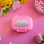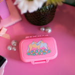 Carry your meds and vitamins in style with this pink pill case that has two convenient, removable dividers on the inside that creates 3 separate compartments. Shaped like an adorable mini suitcase and has the sweetest illustration of two horses in a field of flowers! Water proof + smell proof!