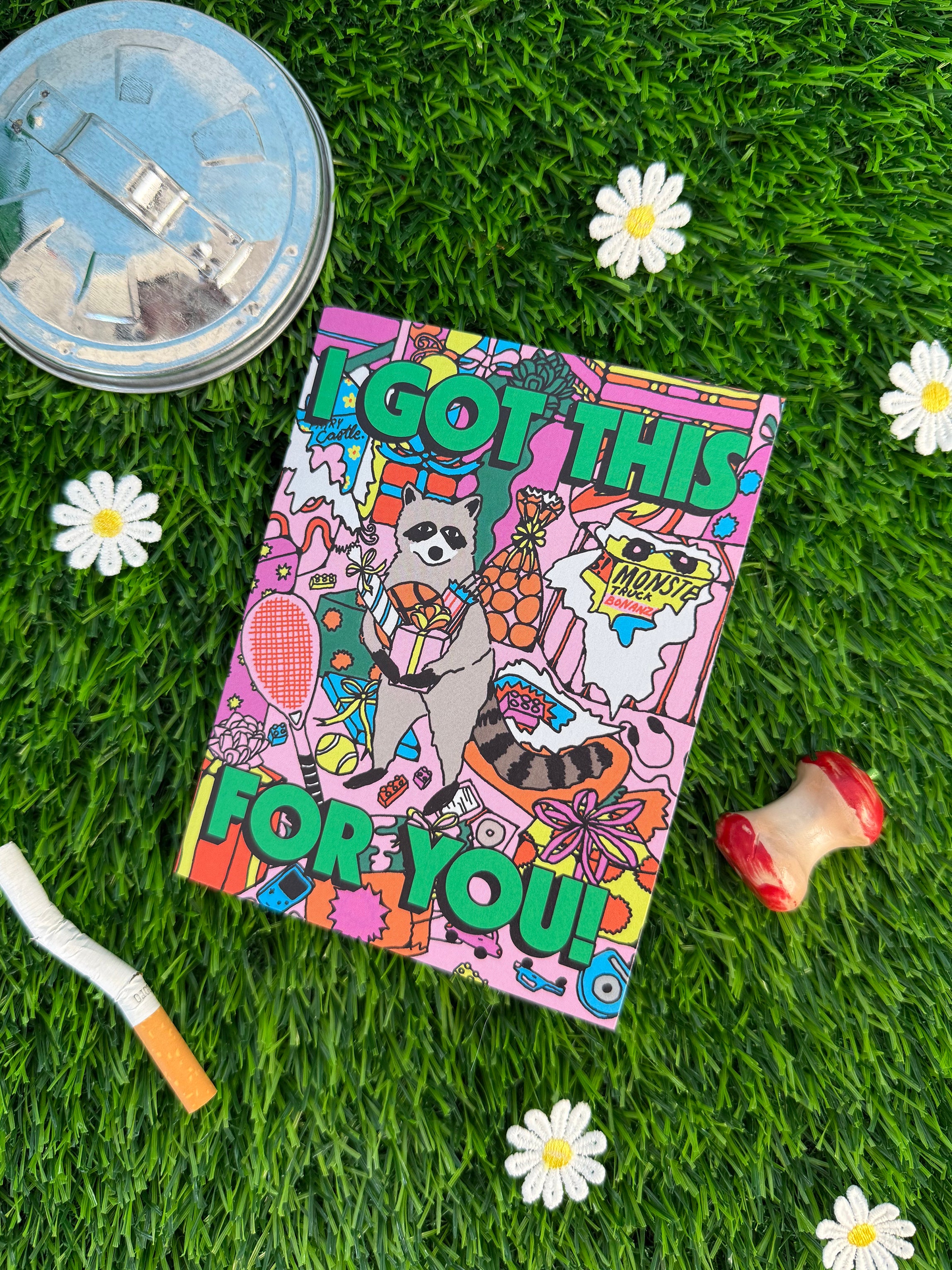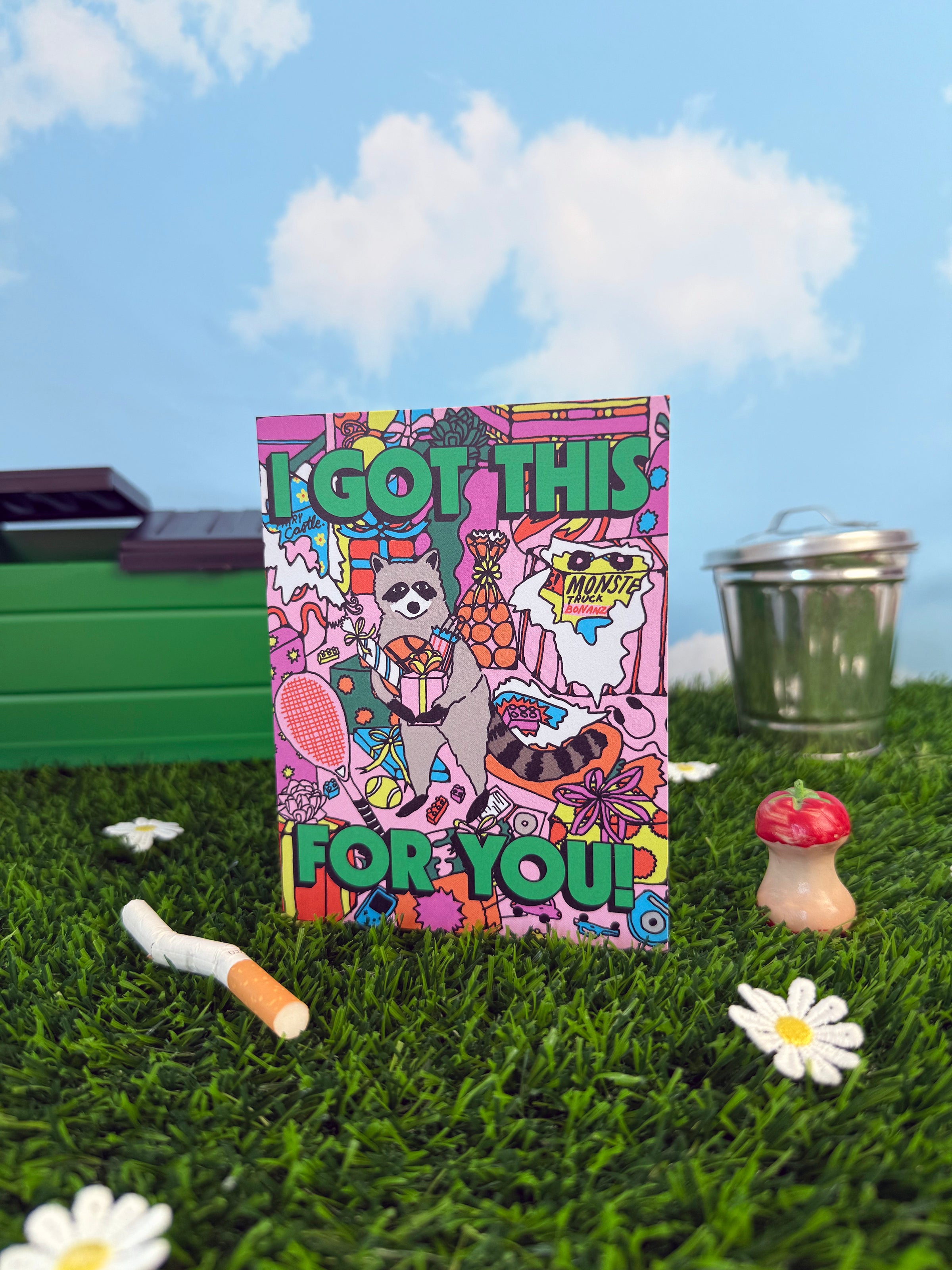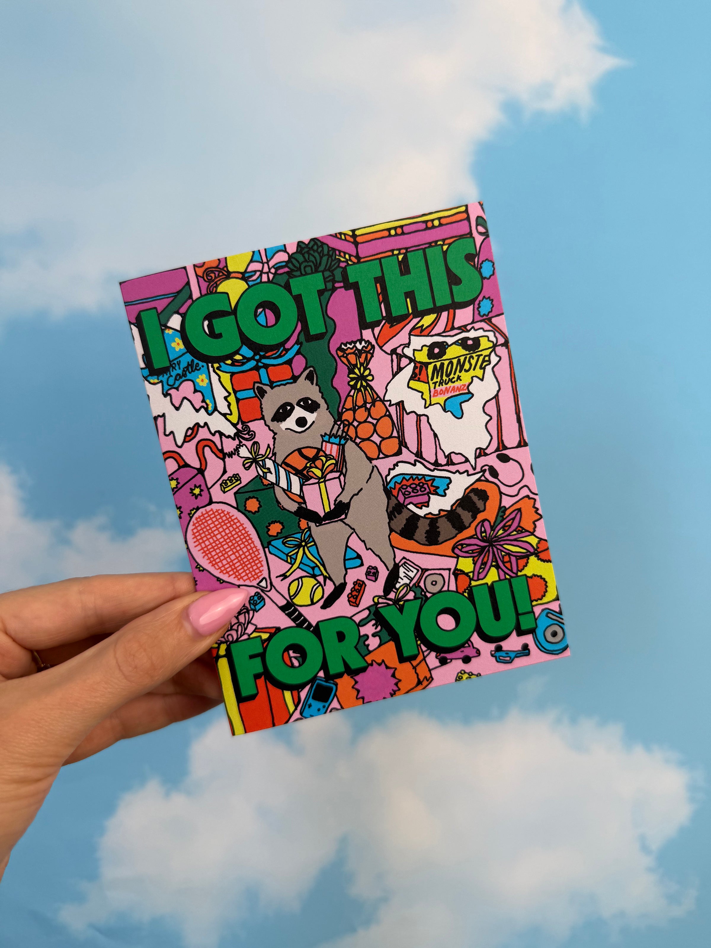 This card features a raccoon holding an arm full of gifts, surrounded by a bunch presents that he's very kindly previewed for you! Aww.