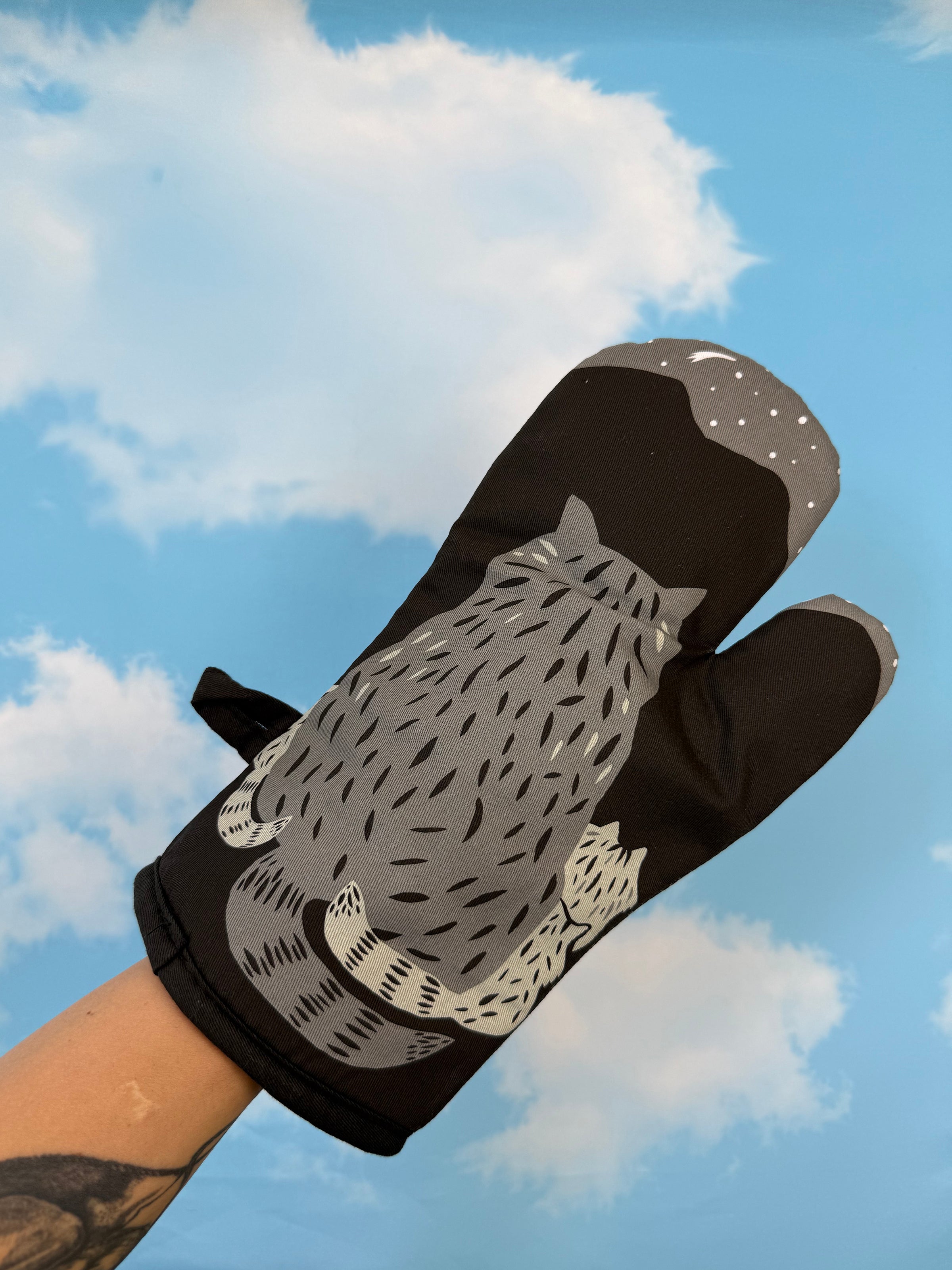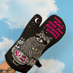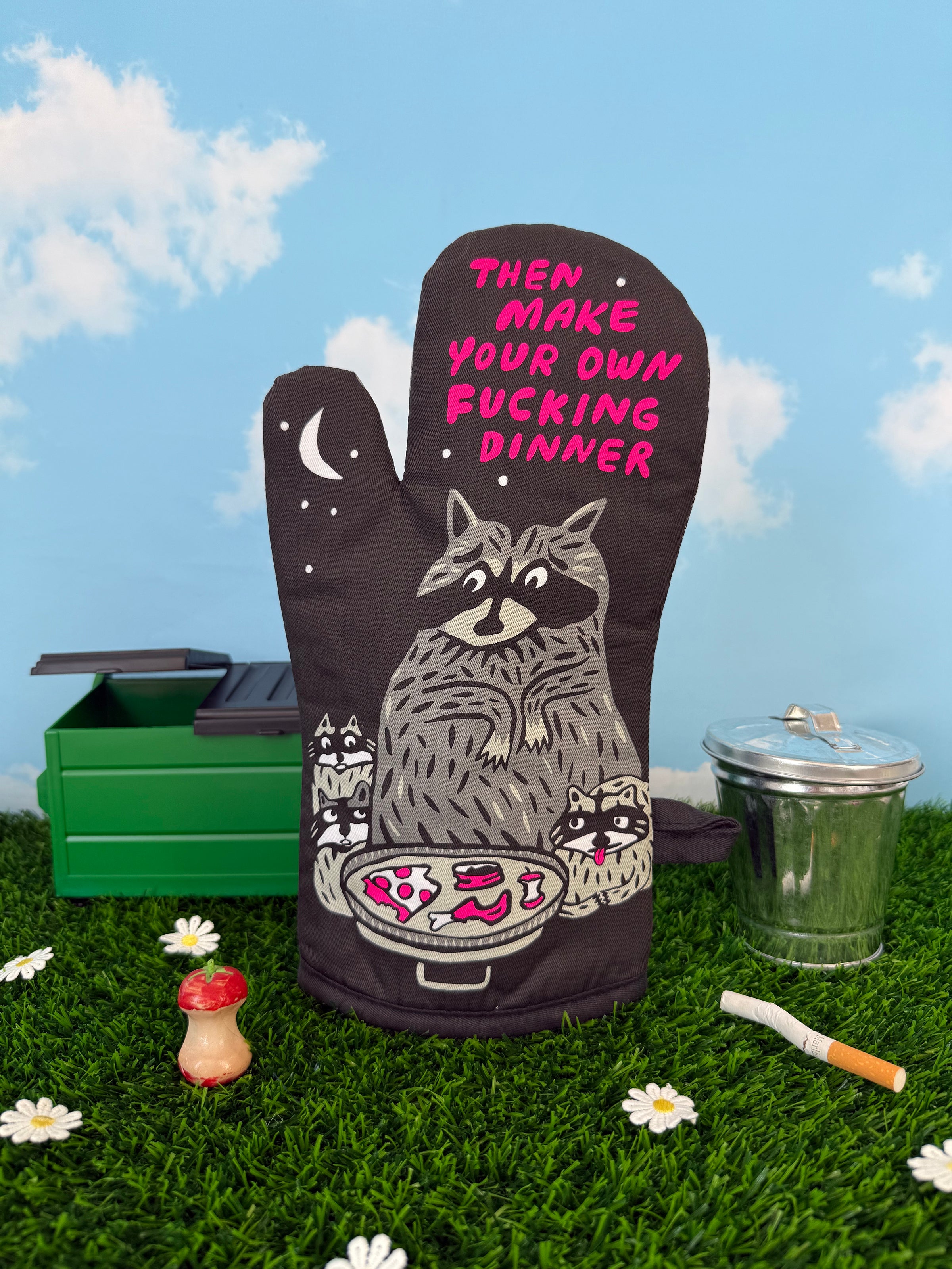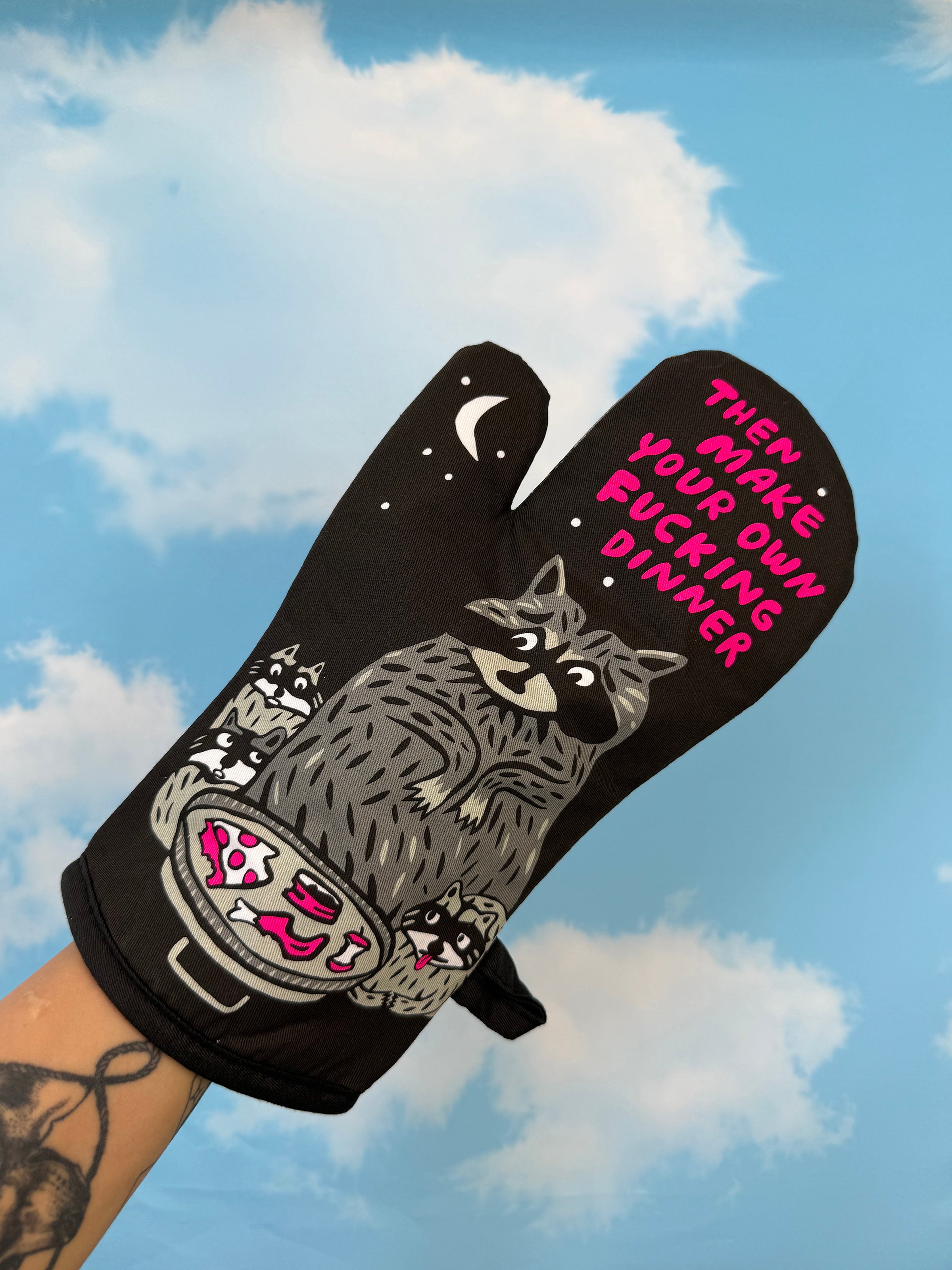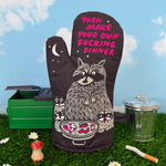 This high quality oven mitt is insulated and made with a 100% cotton material! One side of the oven mitt features a mother raccoon serving dinner and reads "Then make your own fucking dinner". The other side features a cute back view of the raccoon family! The bottom edge of the mitt is black and has a matching loop for convenient hanging when not in use! Great gift for the chef in your life!!