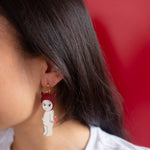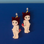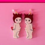 These handmade earrings feature our favorite little angels in devil outfits, horns and all!! You just know they're up to no good! Made from acrylic and 18k gold plated stainless steel.
