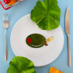Green olive shaped keychain is made out of marbled acetate. Keychain is double-sided but the green on the front of the keychain is slightly different than the back.