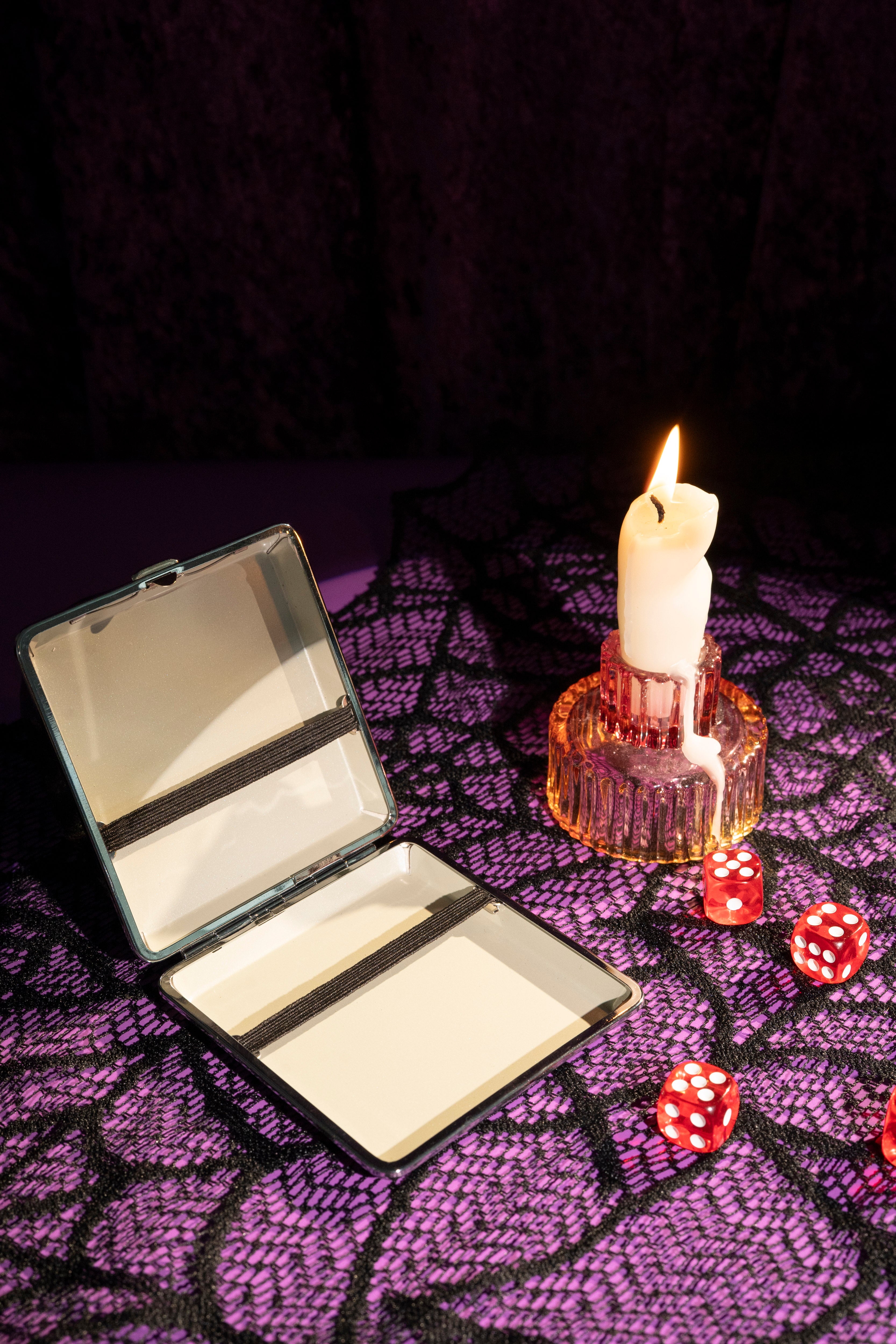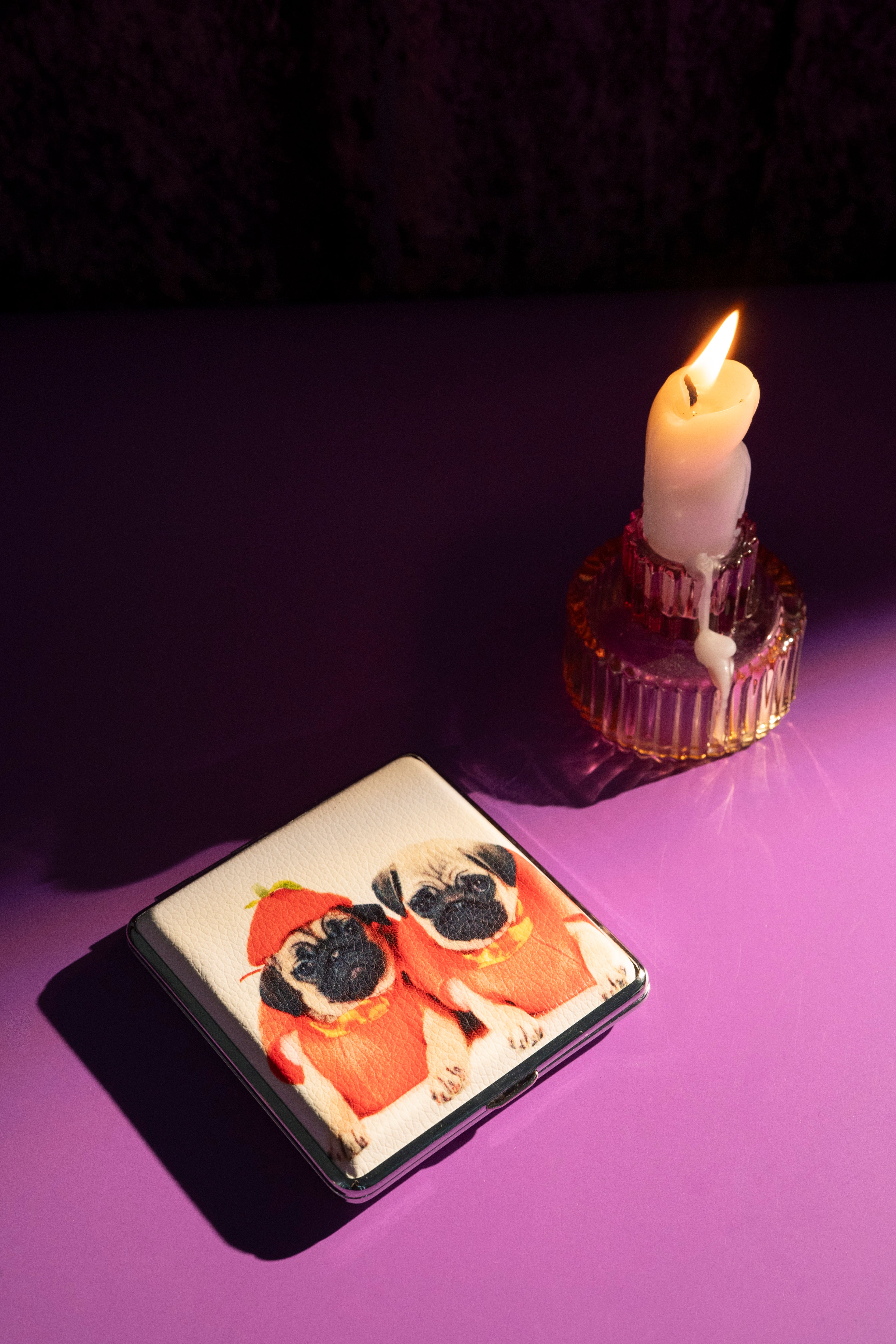 This cig case features two sweet little pug babies dressed up as pumpkins!!!! Possibly the cutest thing we've ever seen?? Perf for holding cigs or prerolls. We love this case because it's slim and discreet so you can easily toss it in your bag! Also perfect for cash, cards, lip gloss, whatever else fits!
