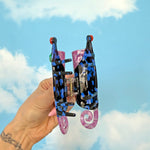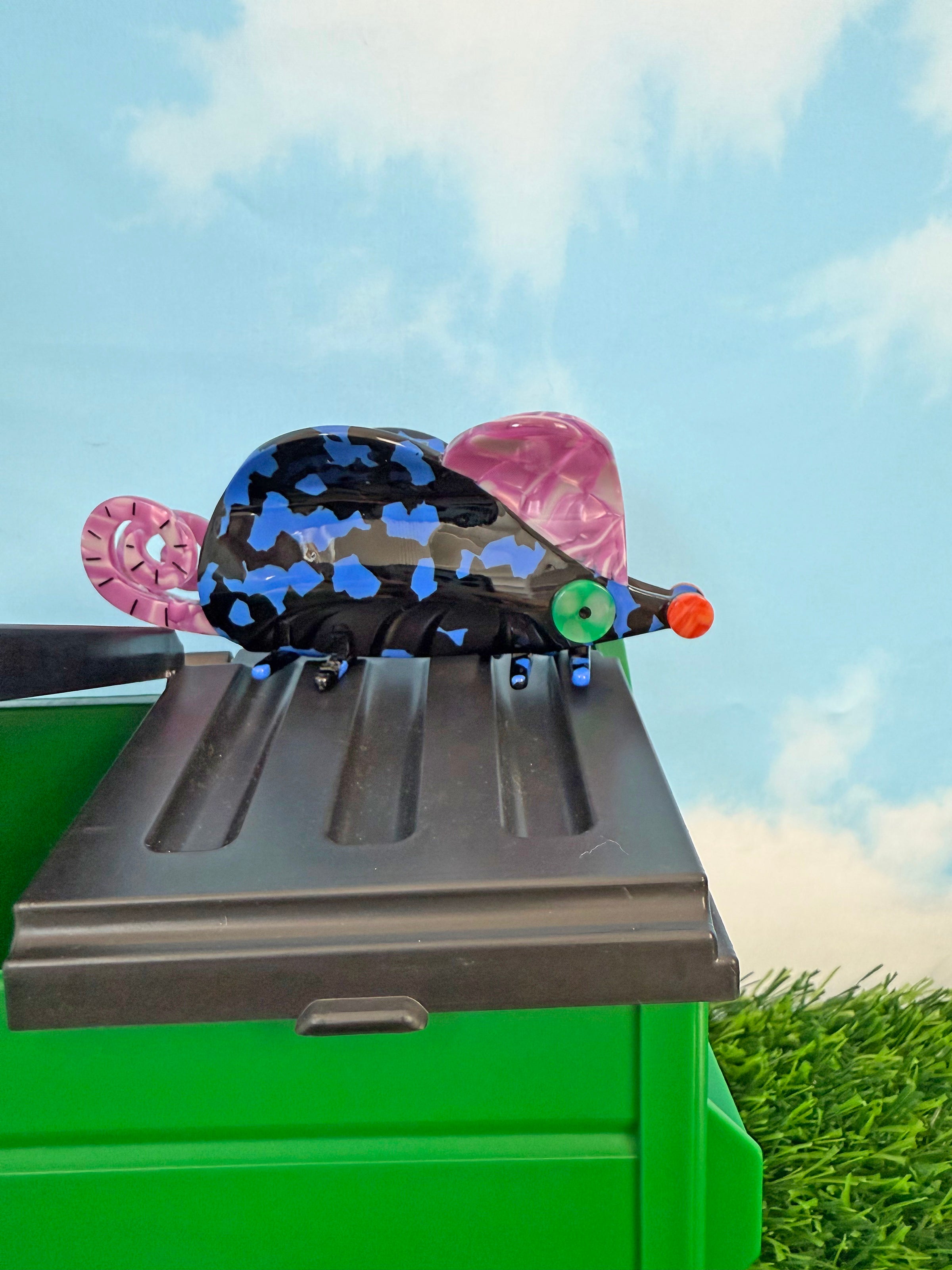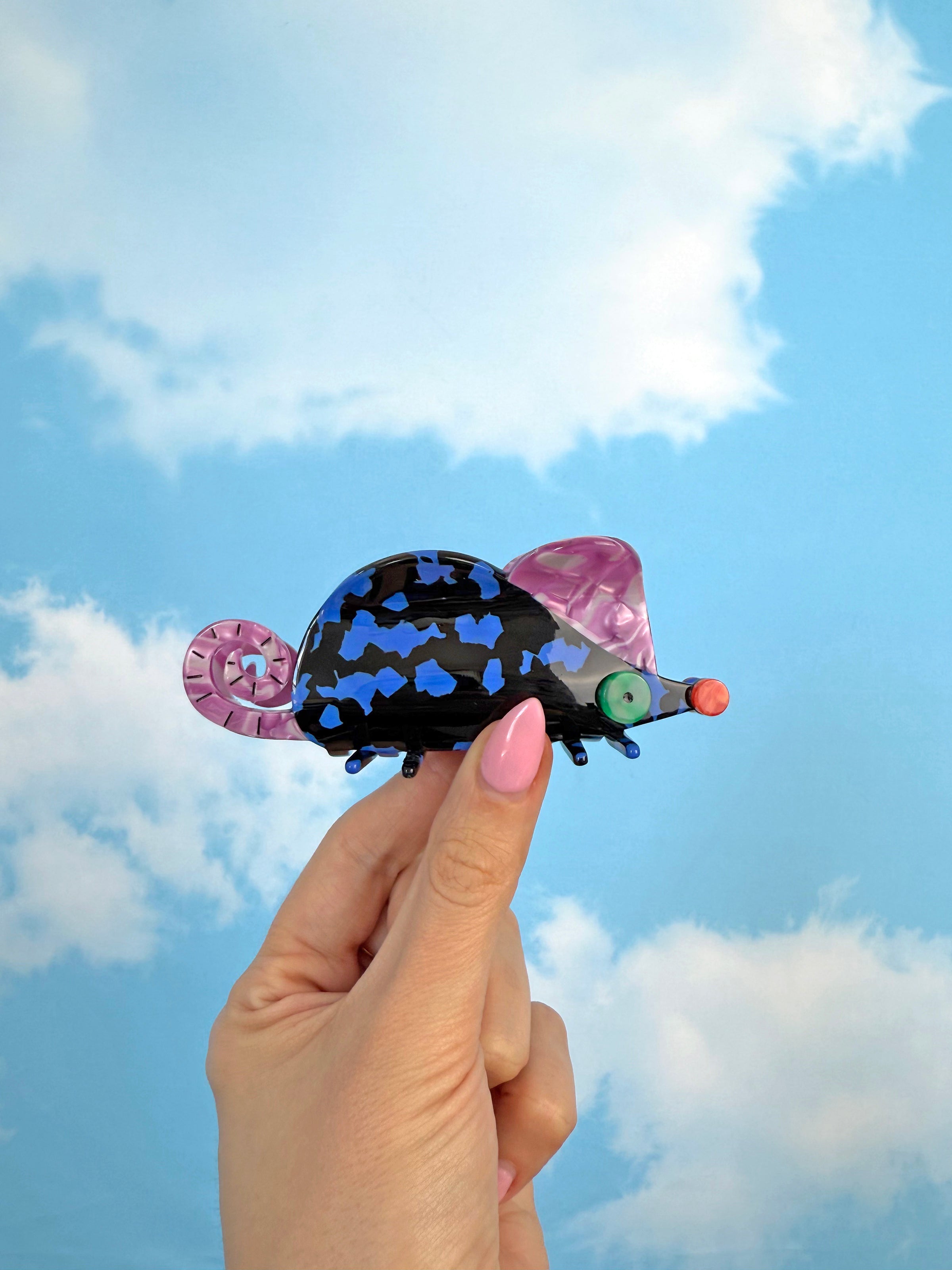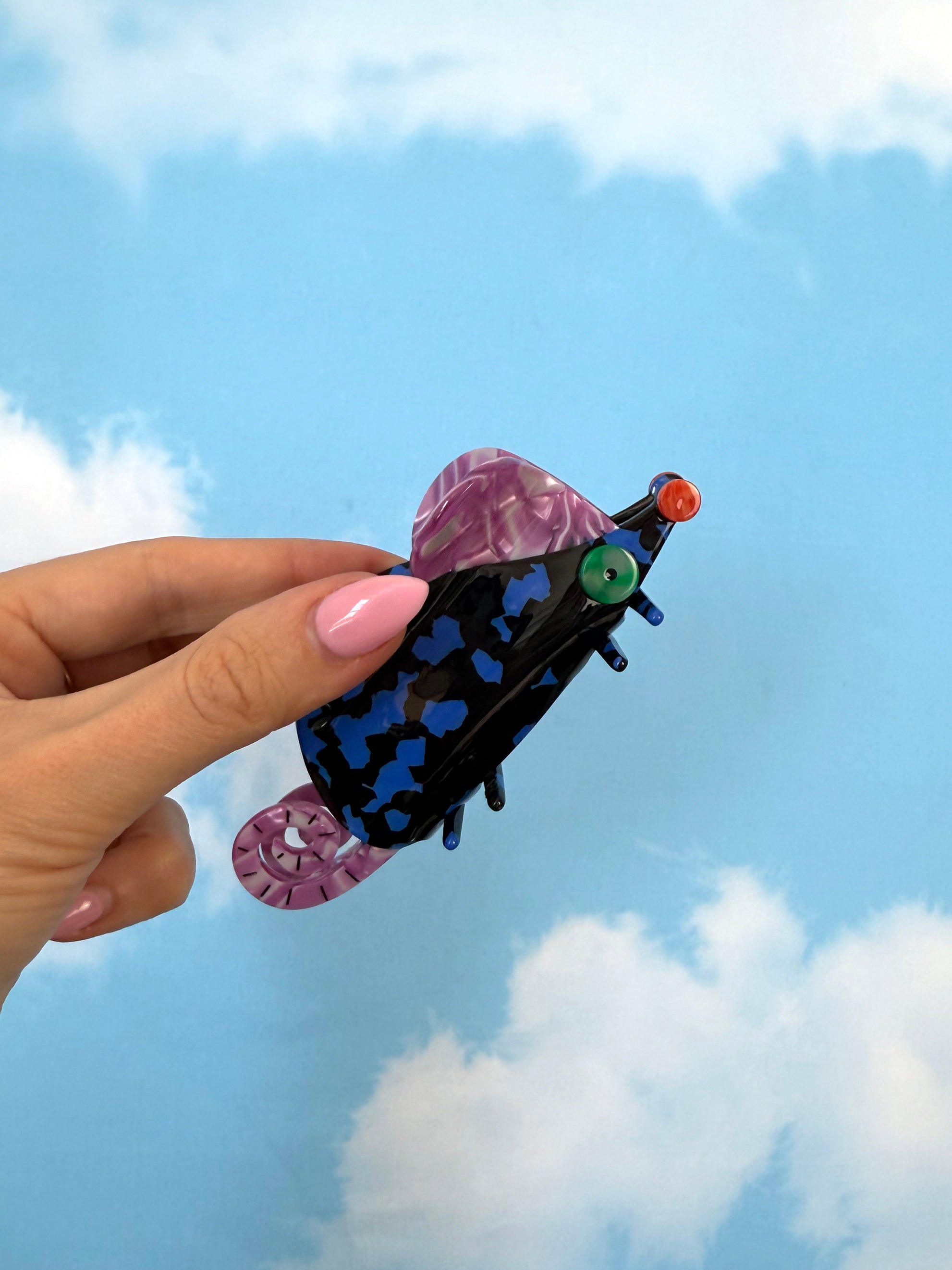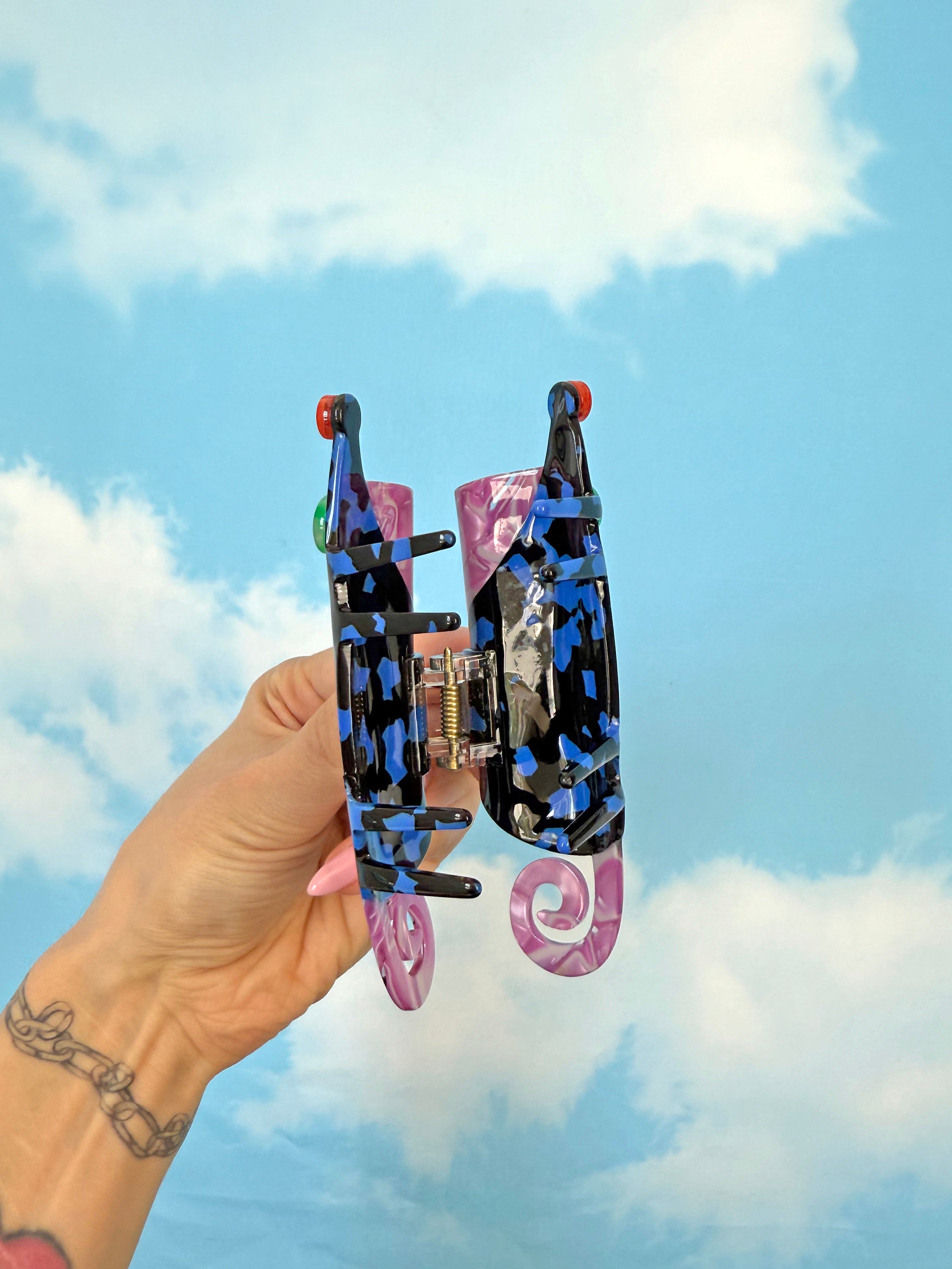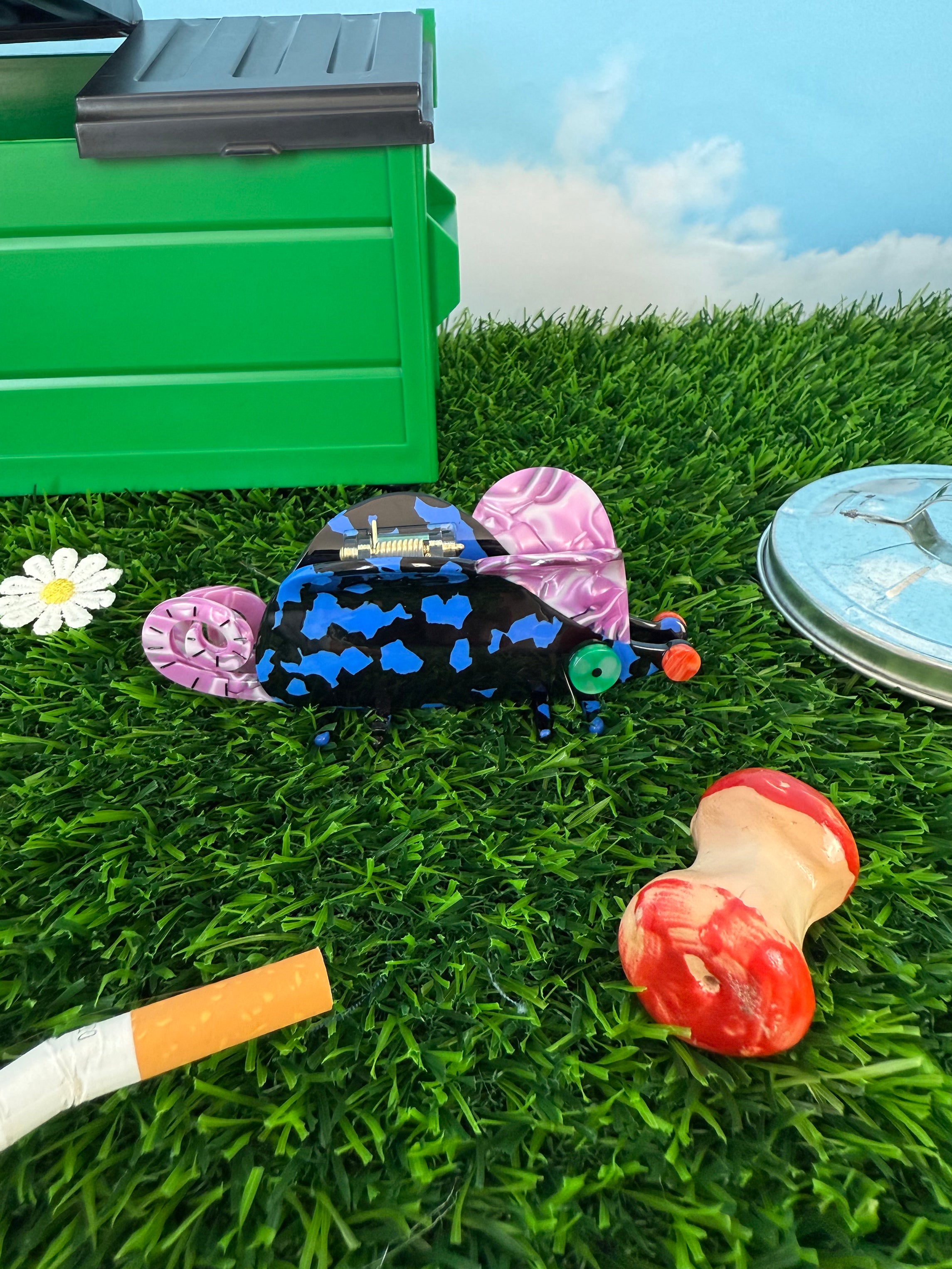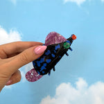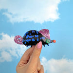 But don't worry, she's super cute! This hair claw features a cutie rat with blue details on the body, pink+white ears and tail, gorg green eyes, and a sweet lil orange nose! The perfect pop of color to finish off any outfit!