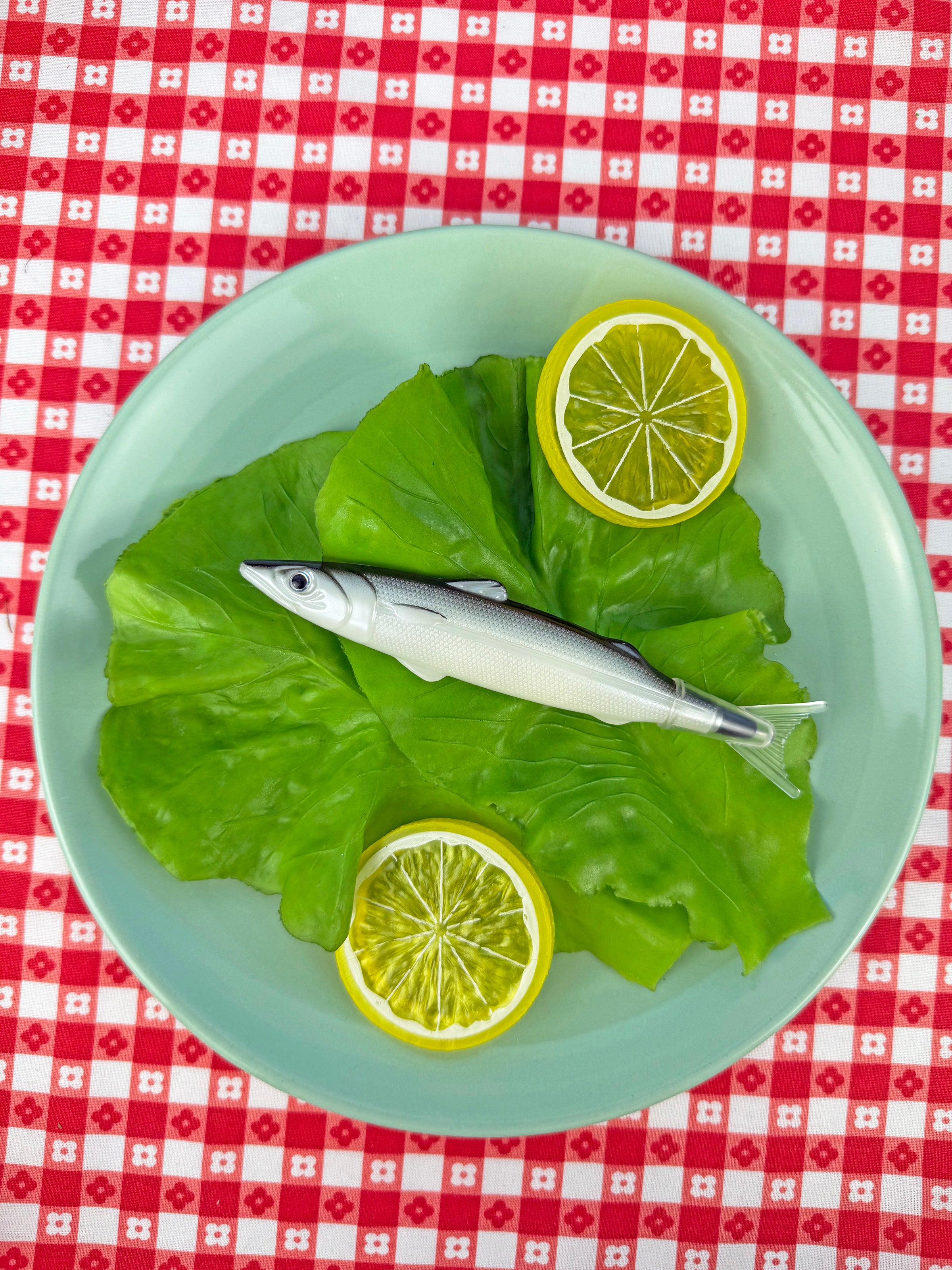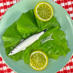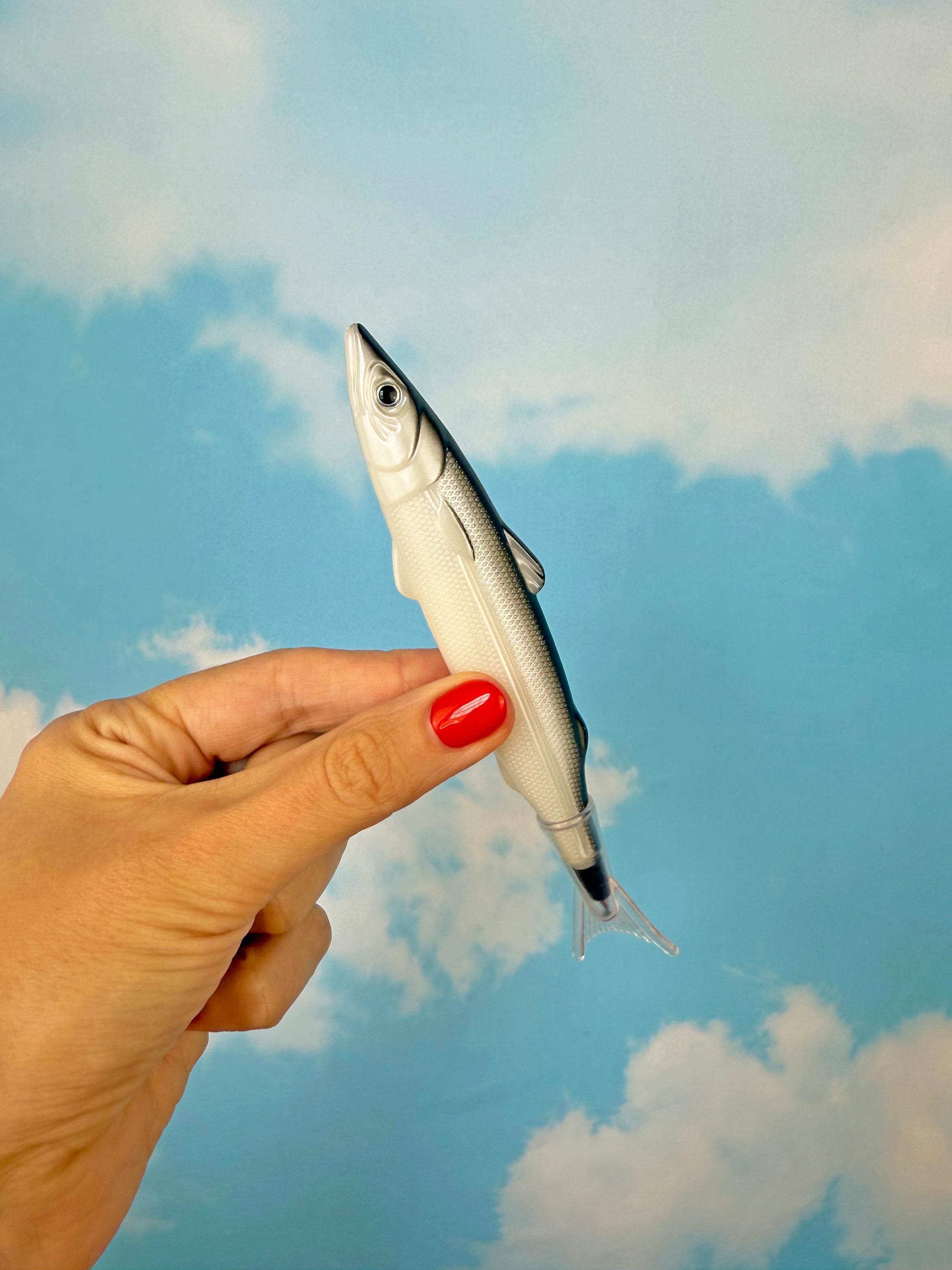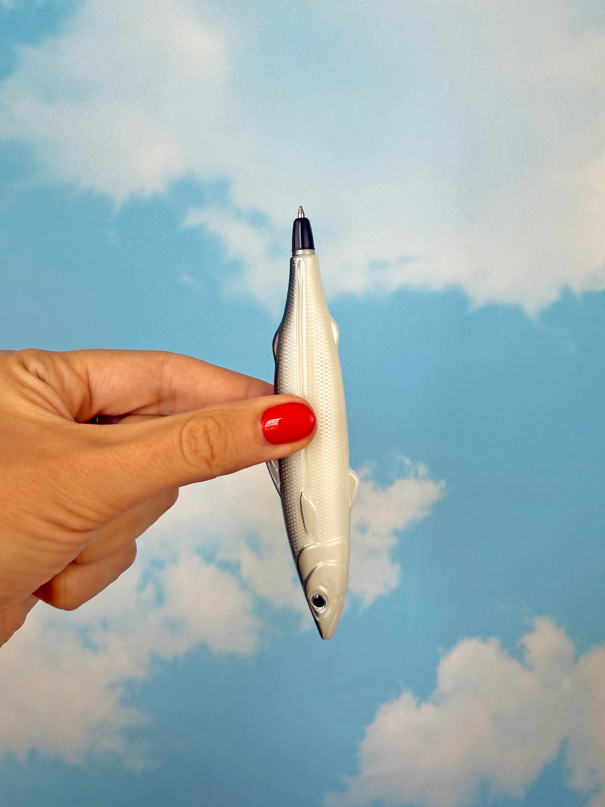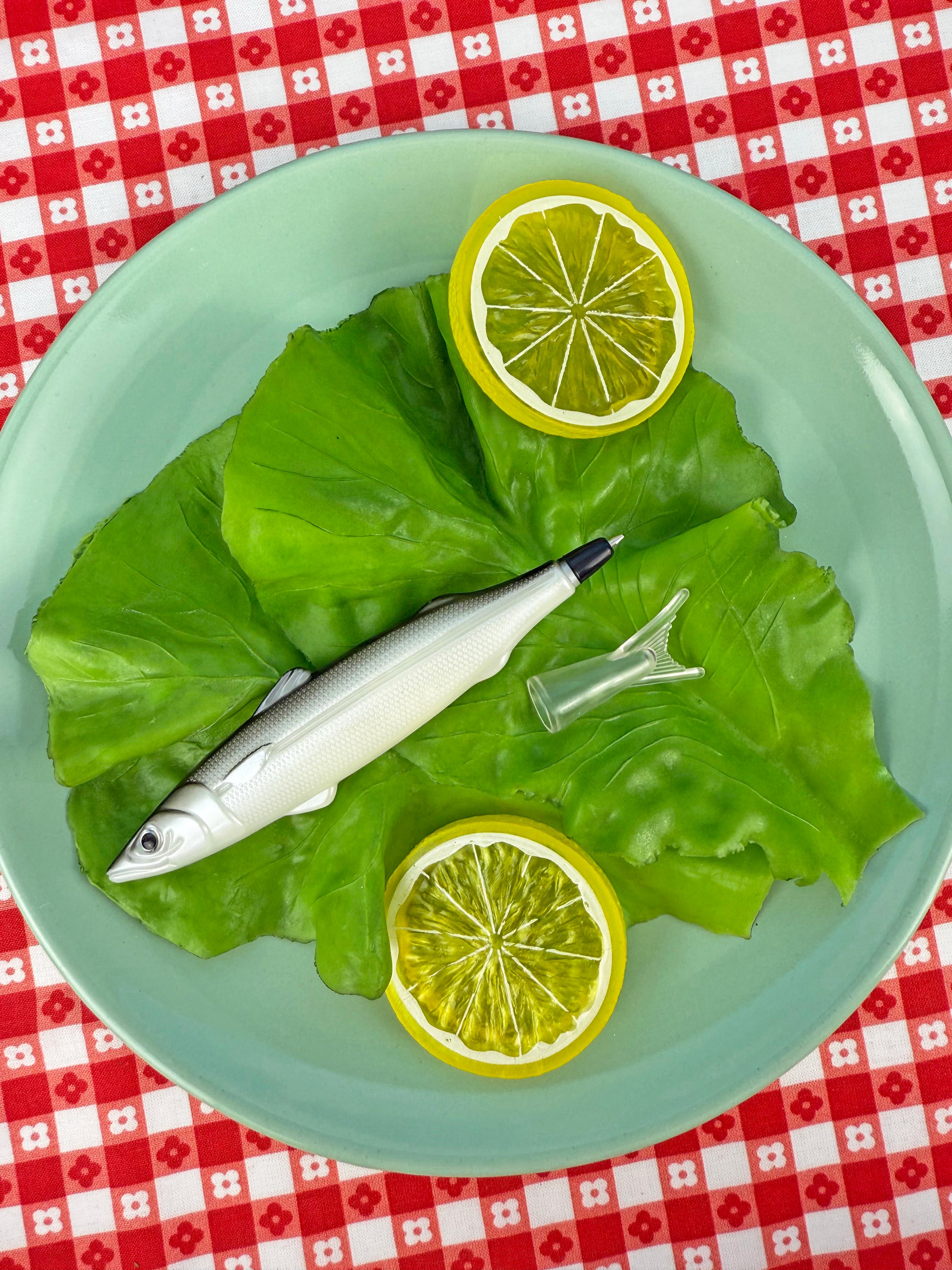 This silver sardine-shaped pen wants to swim into your cart! We love the realistic eyes and the tiny fin details - it even comes with a cute tail-shaped cap to keep your pen from drying out! Would look adorable sitting in your pen holder and makes a great gift for the tinned fish lover in your life!